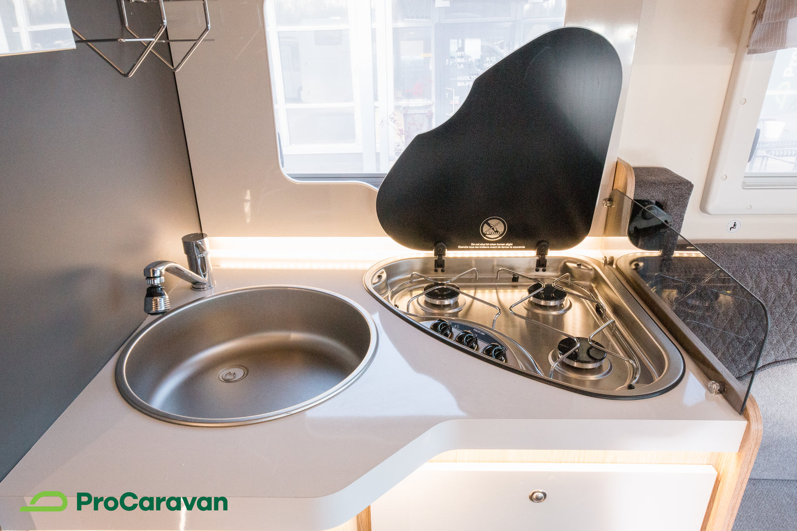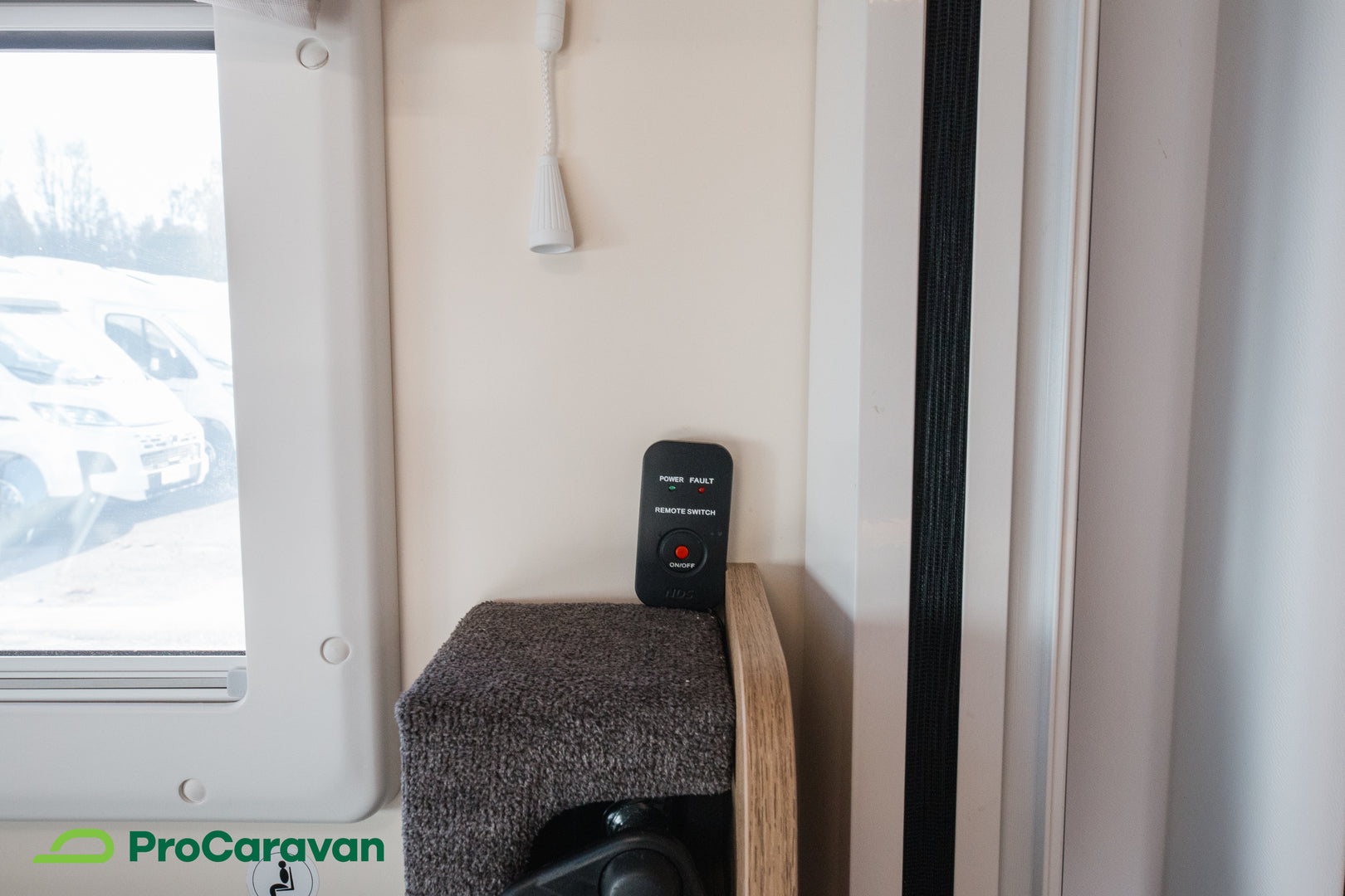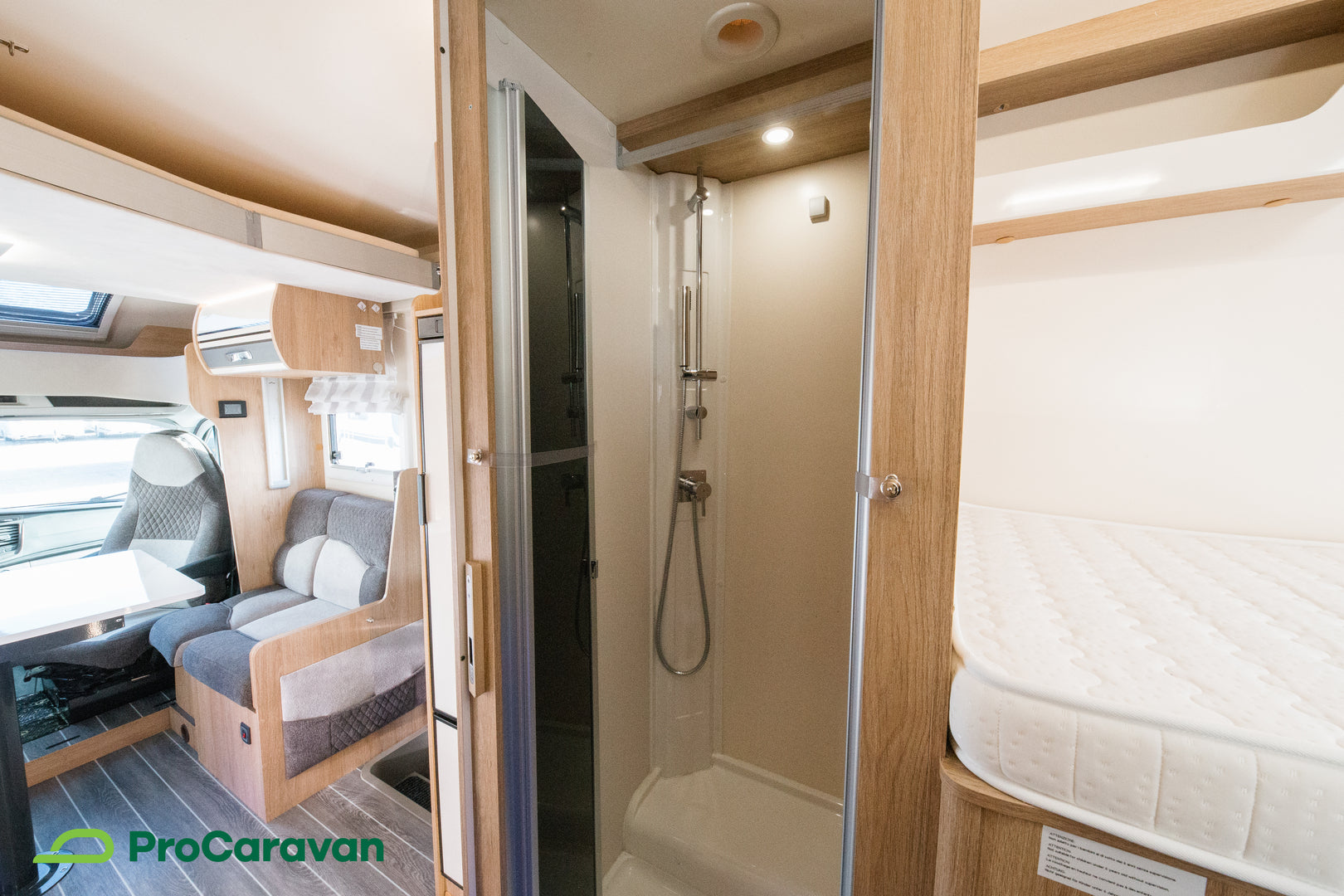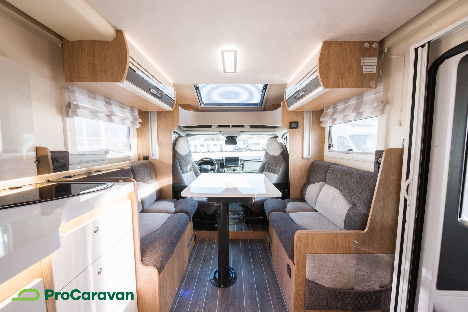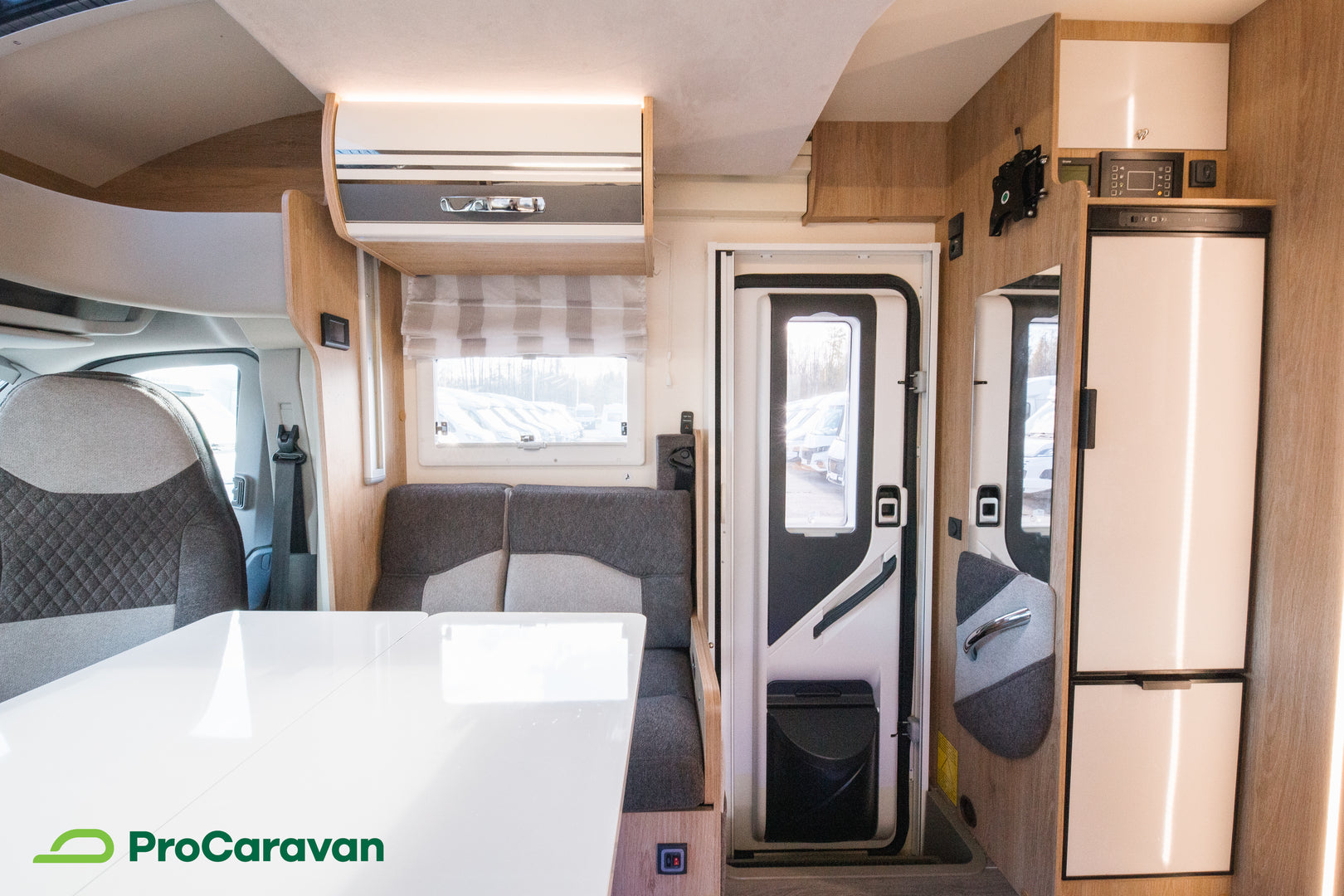 TV-antenni, stereot, TV-teline ja äänentoistojärjestelmä kosketusnäytöllä tuovat viihteen helposti osaksi arkea matkalla. Kasettiverhot, hyttysverkko-ovi ja panoraamaikkuna viimeistelevät viihtyisän asuinosan.