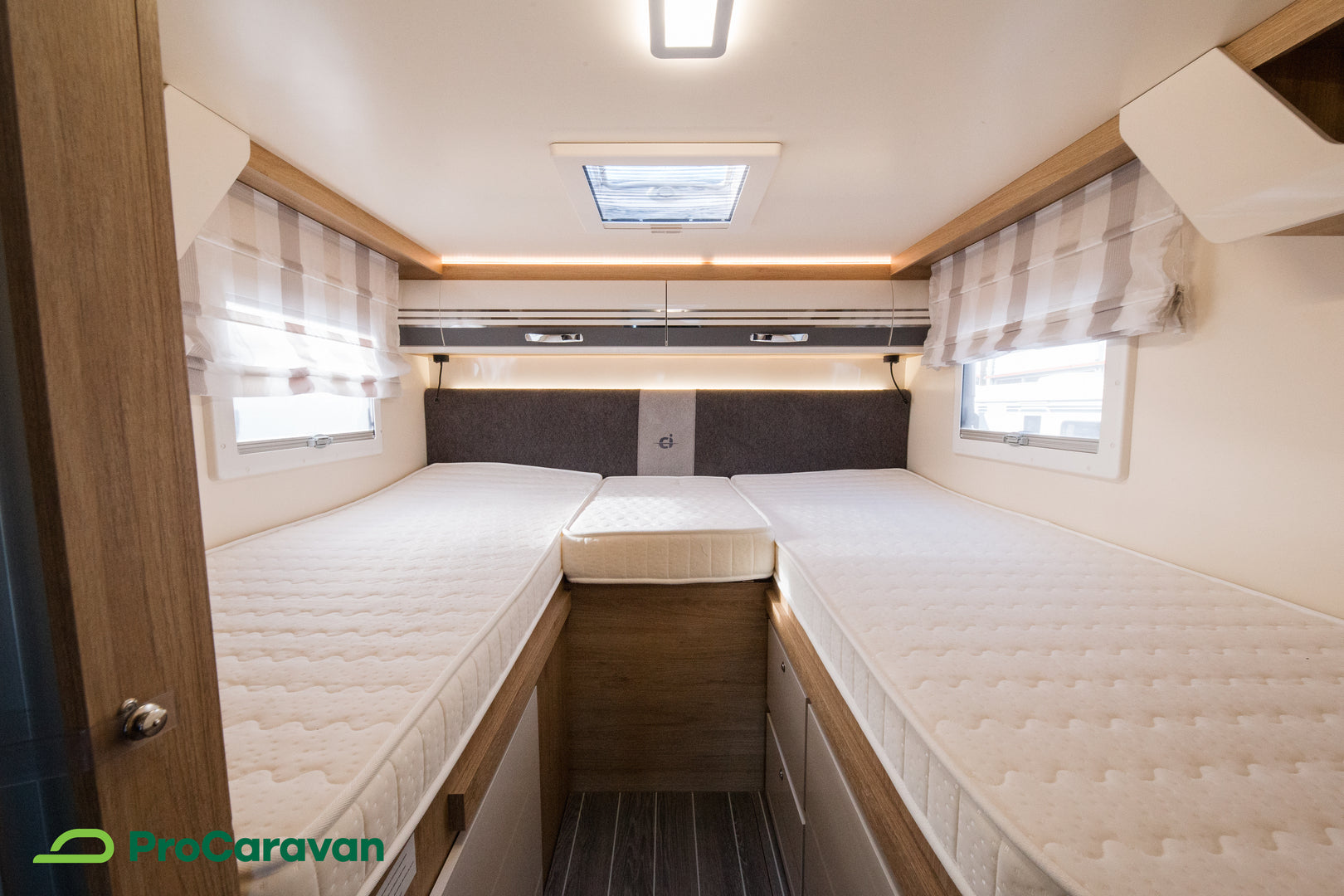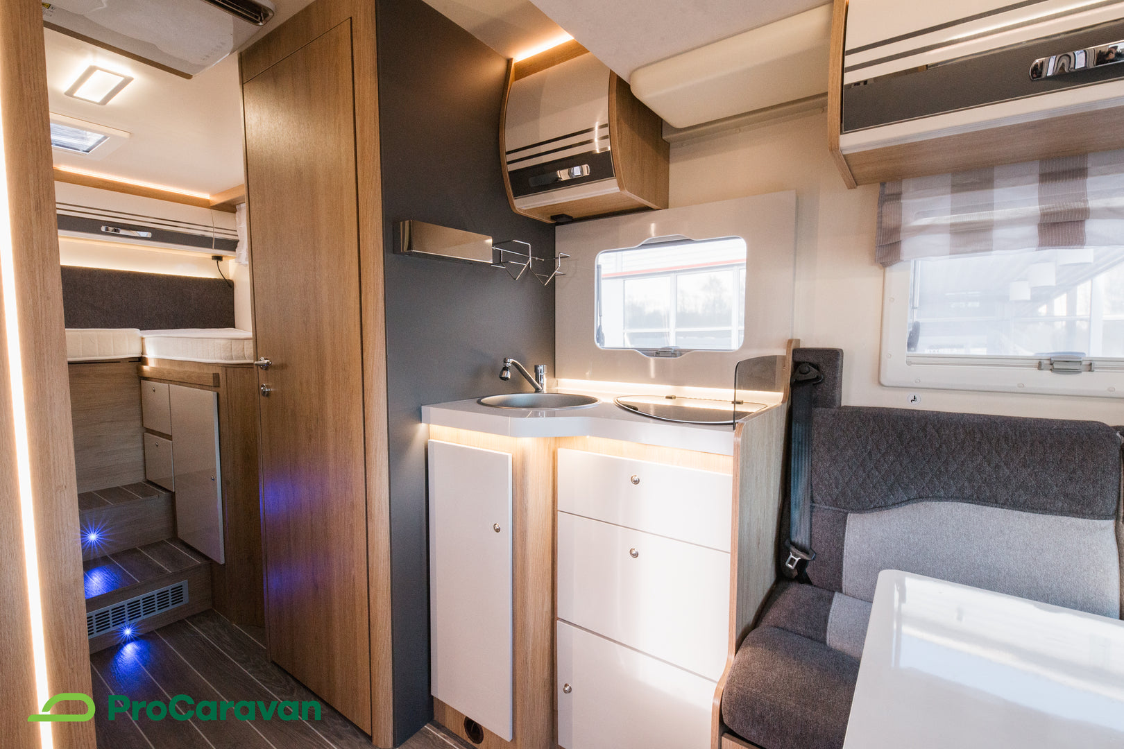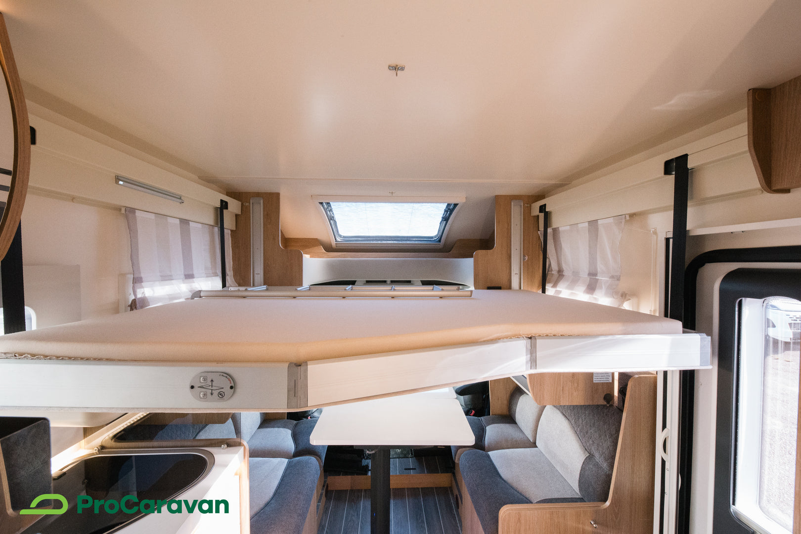 Yöpymiseen löytyy käytännölliset erillisvuoteet ja sähkötoiminen alaslaskettava ylävuode, jotka tarjoavat tilaa neljälle nukkujalle. Sisätilojen tunnelmaa korostaa tehokas tunnelmavalaistus ja kattavat pimennysverhot, jotka takaavat rauhalliset yöunet.