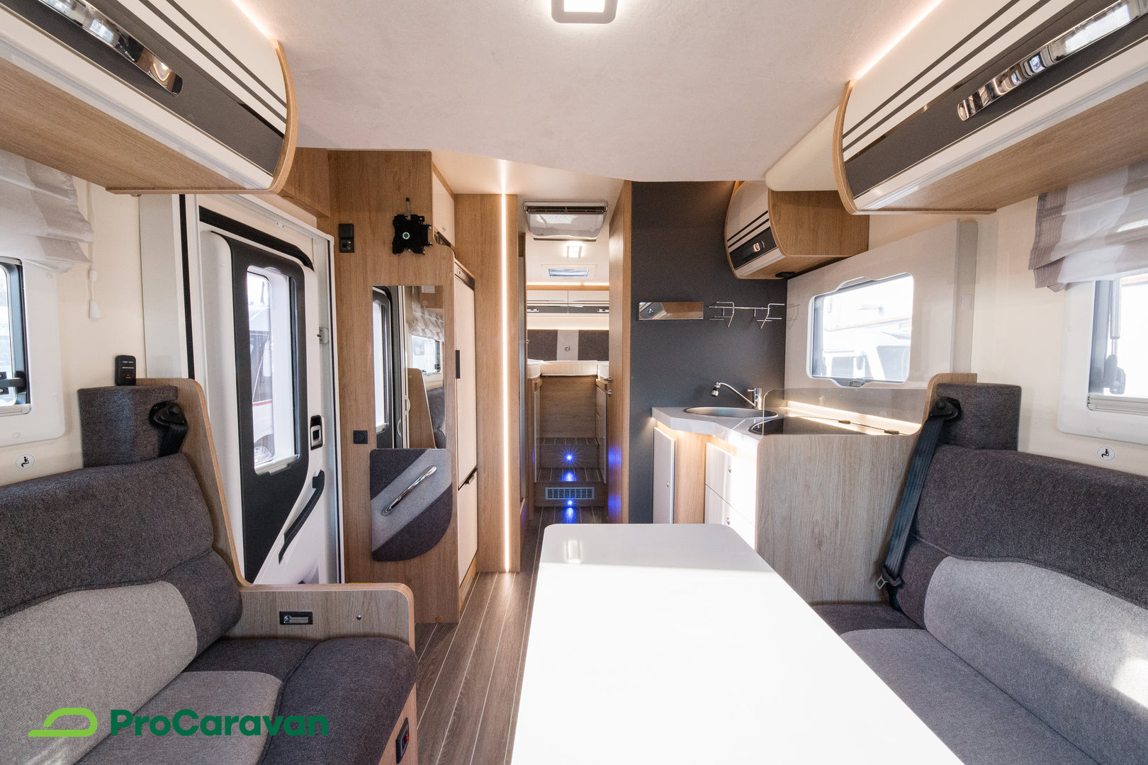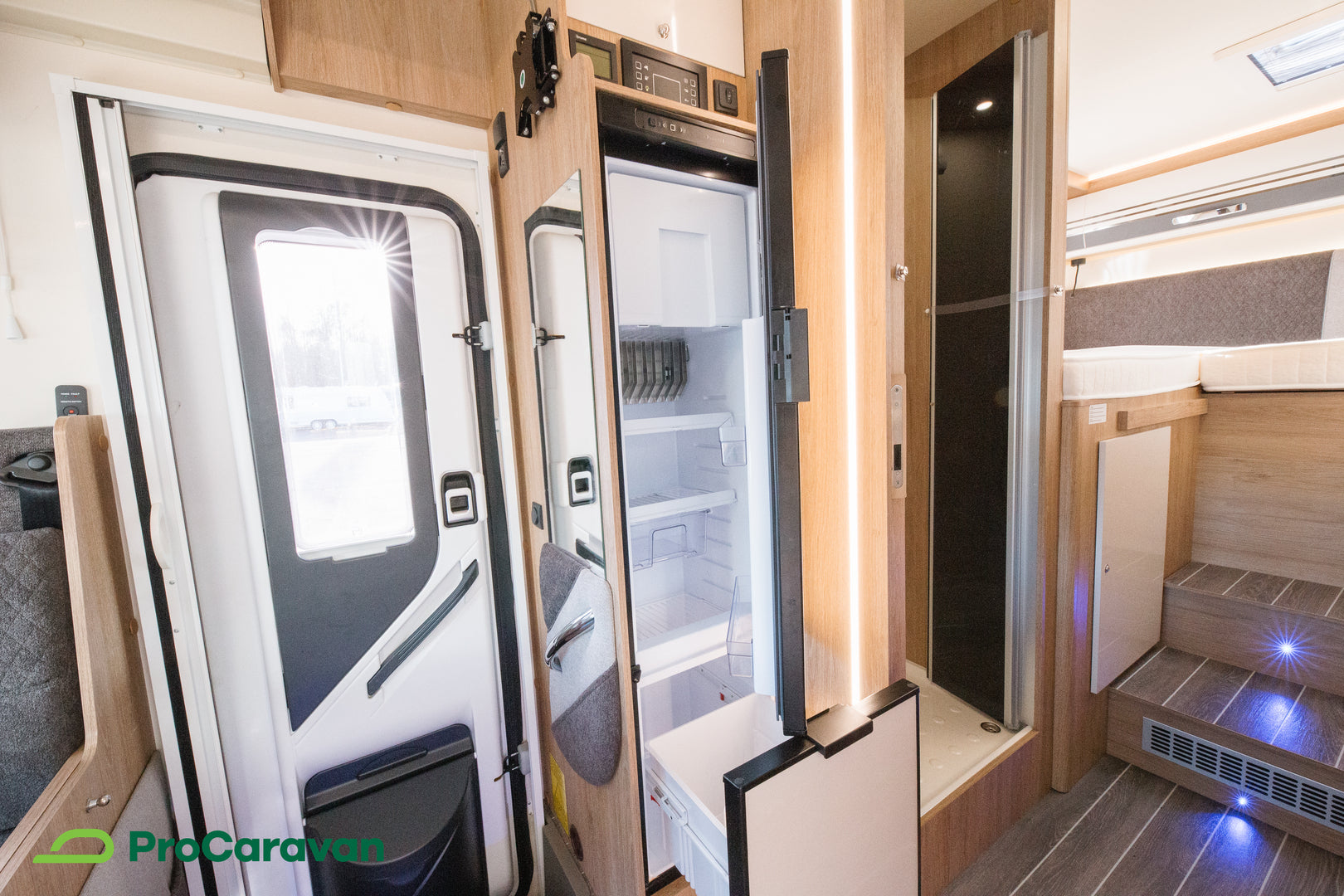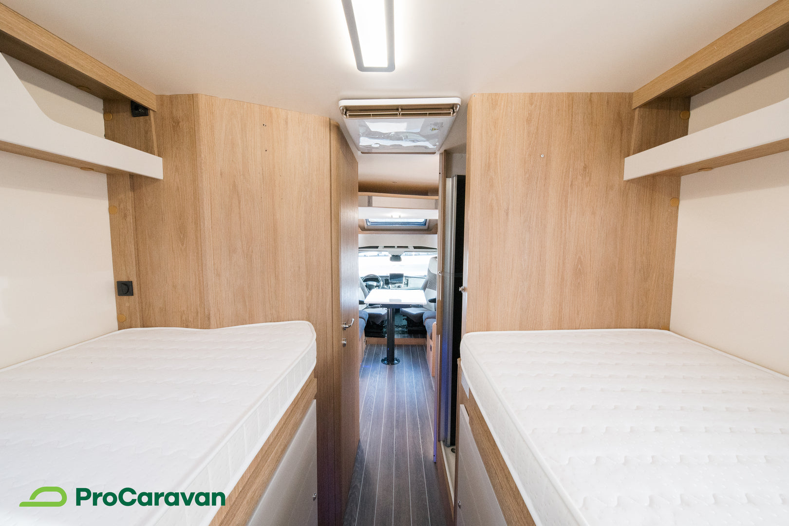 Yöpymiseen löytyy käytännölliset erillisvuoteet ja sähkötoiminen alaslaskettava ylävuode, jotka tarjoavat tilaa neljälle nukkujalle. Sisätilojen tunnelmaa korostaa tehokas tunnelmavalaistus ja kattavat pimennysverhot, jotka takaavat rauhalliset yöunet.