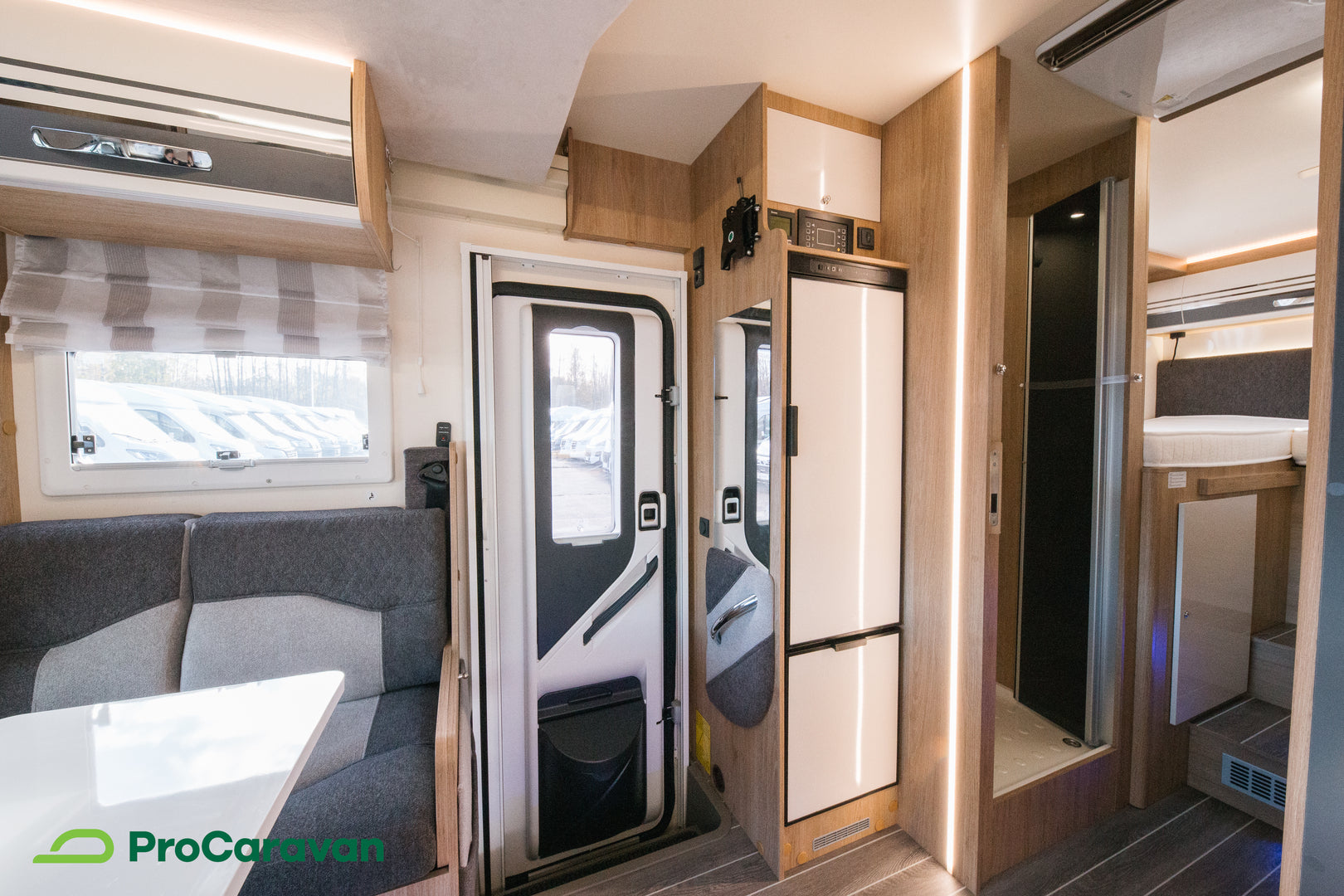 Asuinosan ilmastointi ja Truma-ilmakeskuslämmitys sähköpatruunalla varmistavat miellyttävän sisäilman vuodenajasta riippumatta. Eristetty sisääntulorappu, lämmitetty harmaavesijärjestelmä ja sähköinen lattialämmitys tuovat lisämukavuutta erityisesti viileämmillä keleillä.
