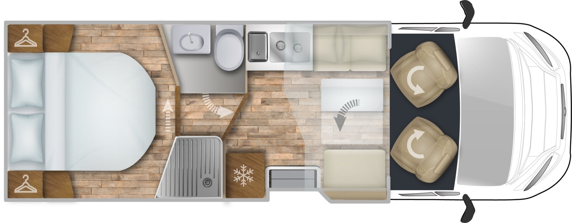 Keittiössä on iso 158 litran kaksiosainen kompressorijääkaappi, kaksi kaasupoltinta ja ulosvedettävä kori, joka helpottaa säilytystä. Tiskialtaan kansi toimii leikkuulautana, ja 220 V pistorasia takatallissa lisää käytännöllisyyttä arjessa. Ohjaamon pimennysverhot ja keittiön kahvinkeitinvalmius viimeistelevät mukavuuden.