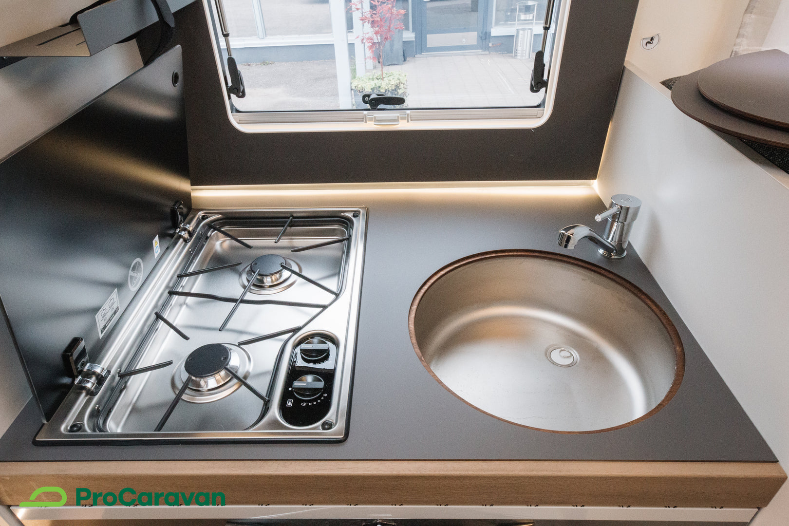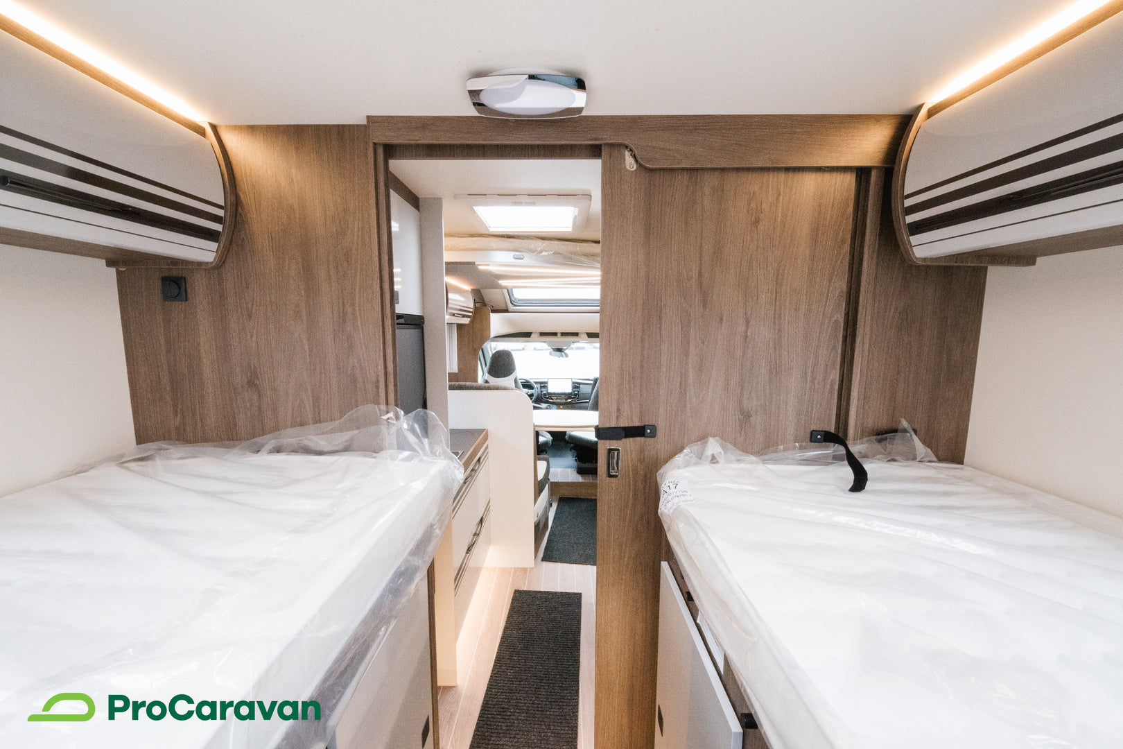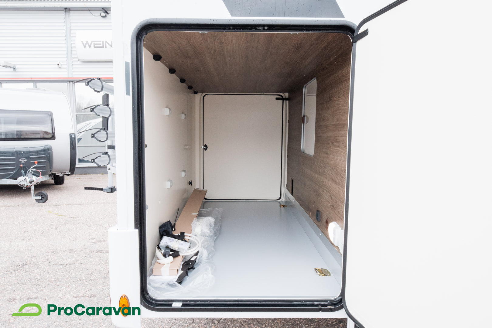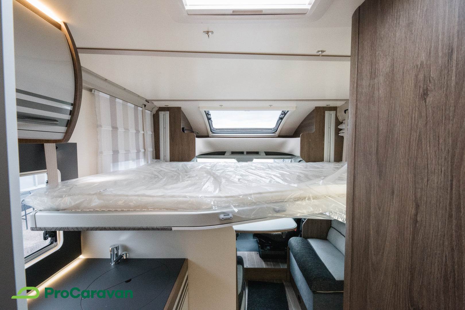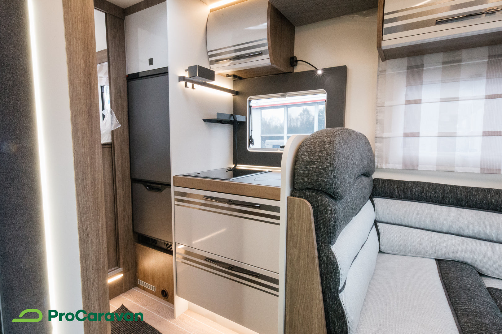 Asuinosan suunnittelussa yhdistyvät käytännöllisyys ja tyylikkyys. Sähkötoiminen laskuvuode, erillisvuoteet pedinlevityksellä ja tilava 158 litran kompressorijääkaappi luovat mukavuutta pidemmilläkin reissuilla. Keittiön ulosvedettävä kori, leikkuulaudalla varustettu tiskiallas ja 200 watin aurinkopaneeli lisäävät omavaraisuutta. Truma Combi 6 -lämmitys pitää sisätilat miellyttävinä ja eristetty harmaavesisäiliö helpottaa käyttöä myös kylmillä keleillä.