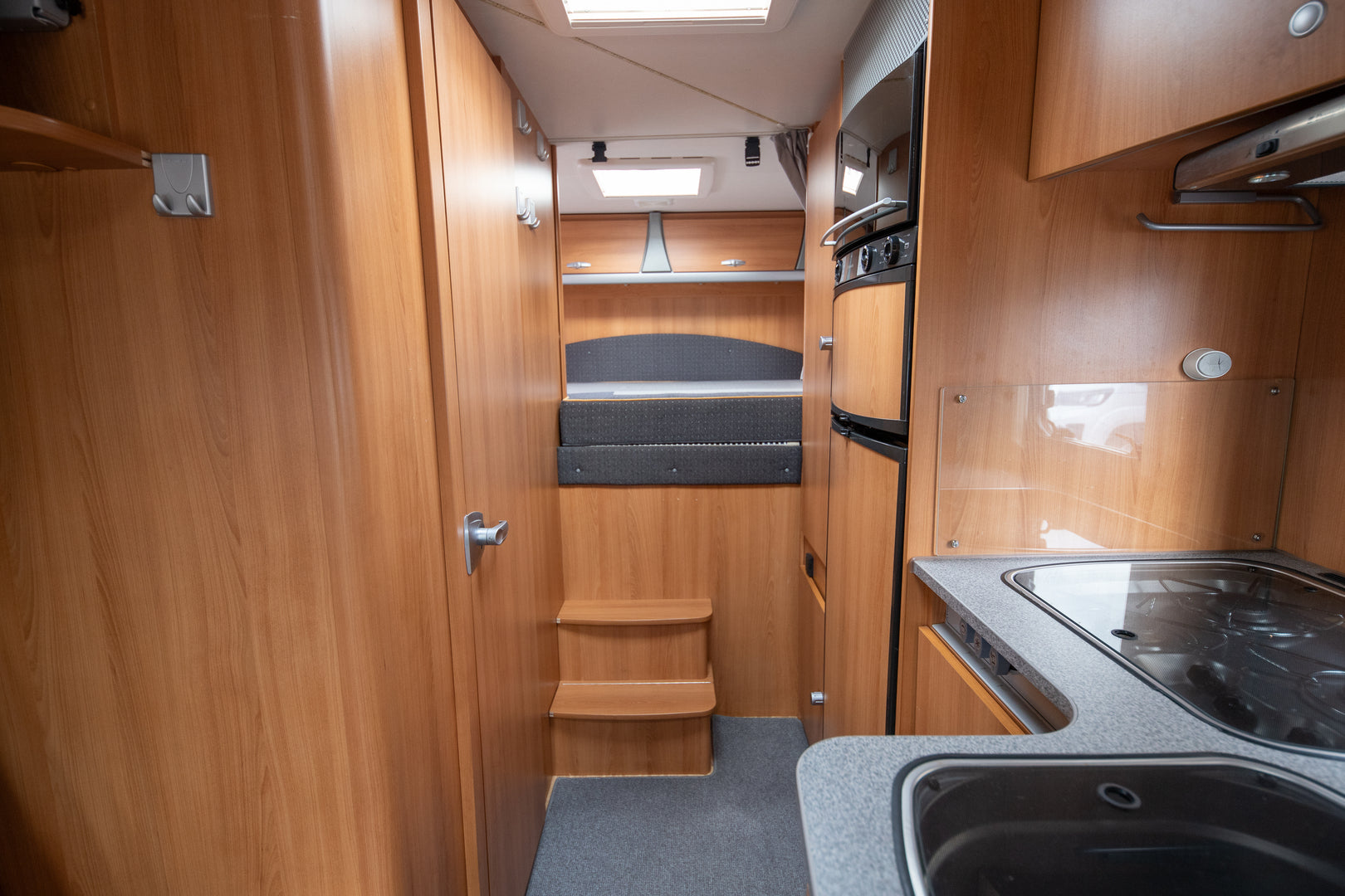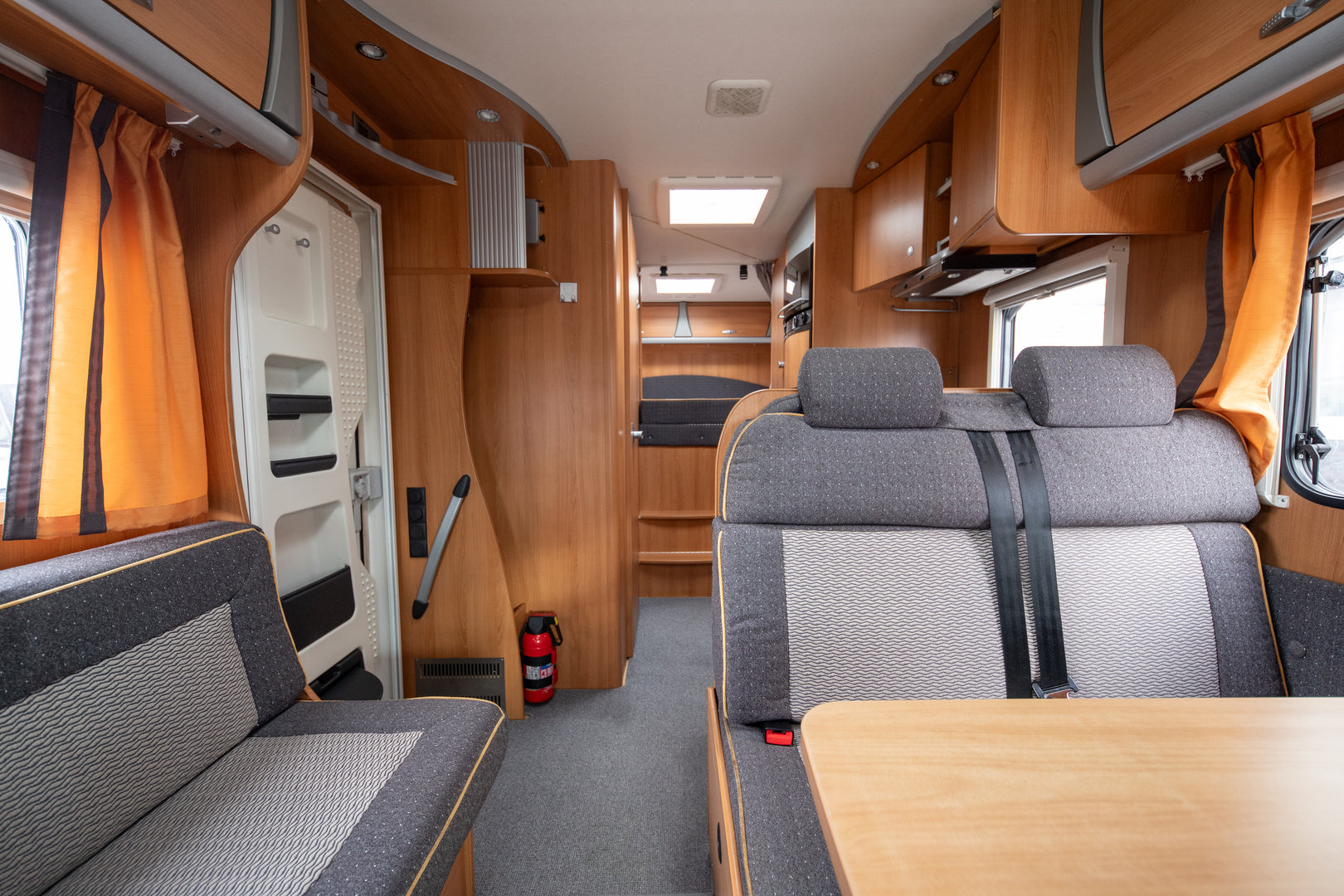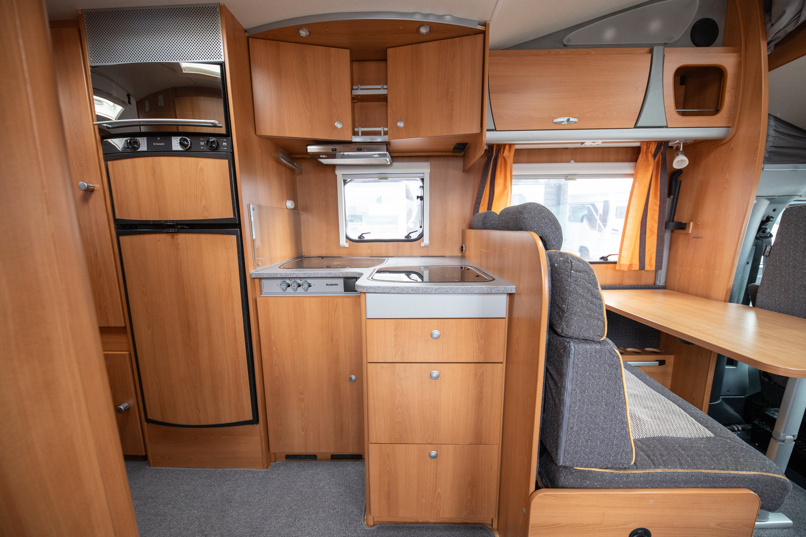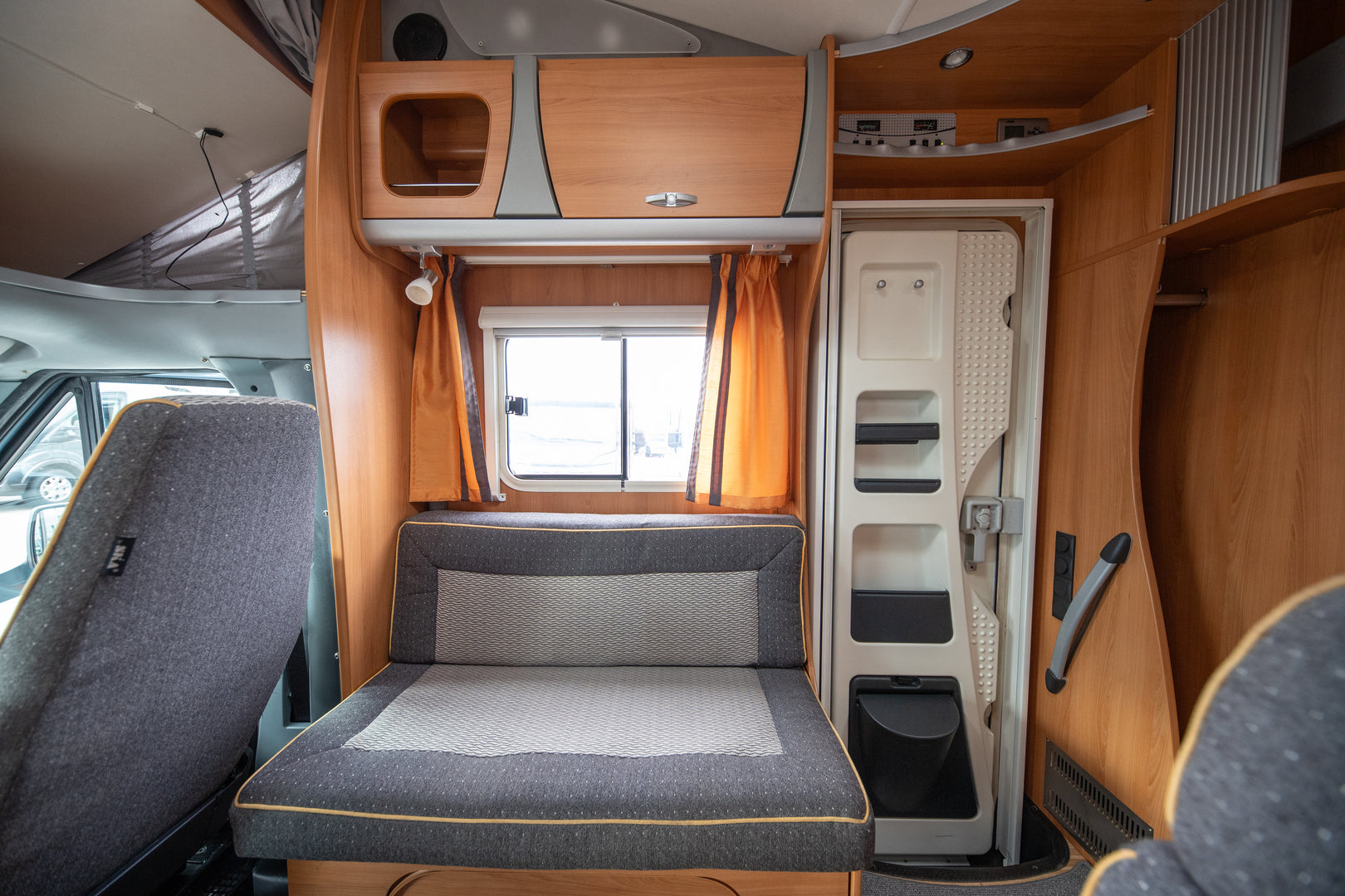 Kiinteä alkovin ylävuode ja parivuode mahdollistavat mukavat yöunet jopa neljälle hengelle. Keittiöstä löytyvät liesi ja jääkaappi, ja peseytymistilat sisältävät kasetti-WC:n sekä pesualtaan. Takatalli tarjoaa hyvin säilytystilaa, ja pyöräteline sekä vetokoukku tuovat lisäkäyttömahdollisuuksia.