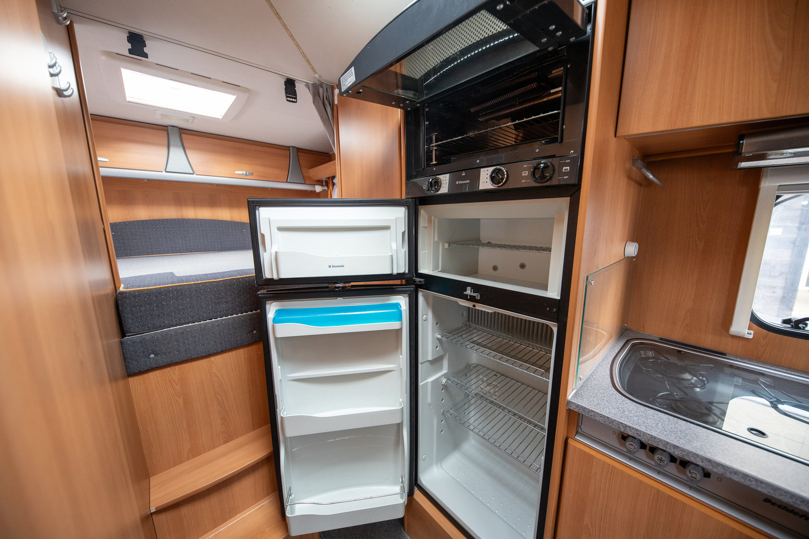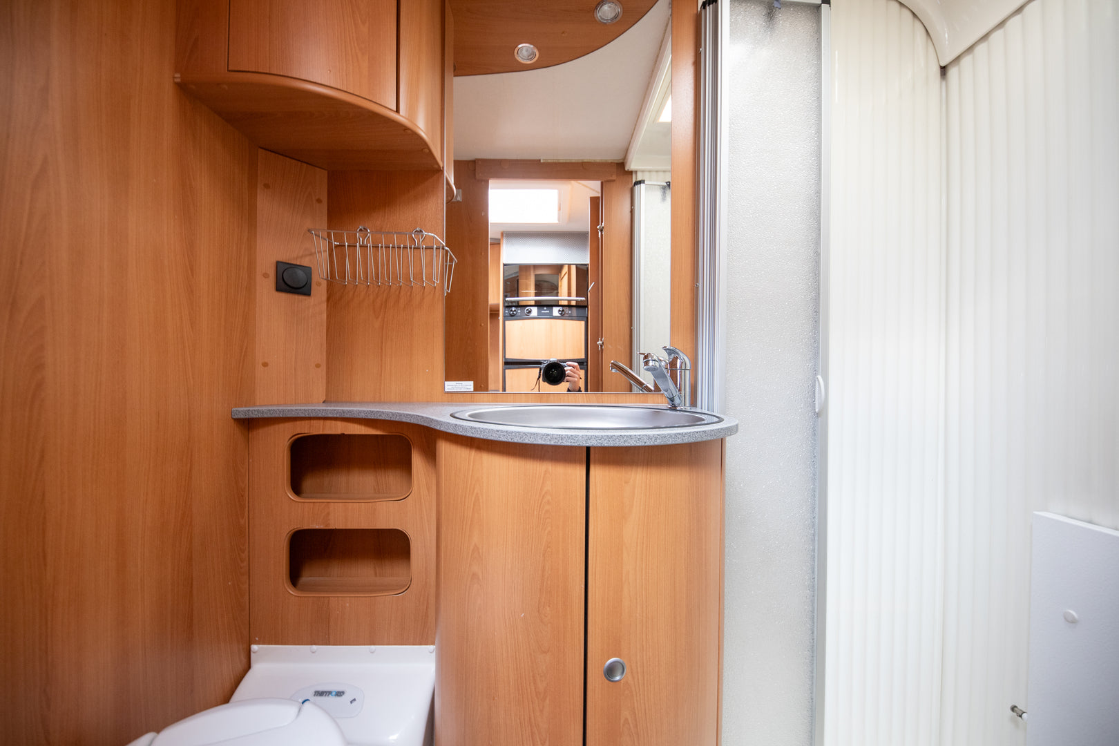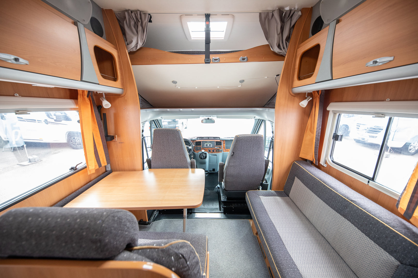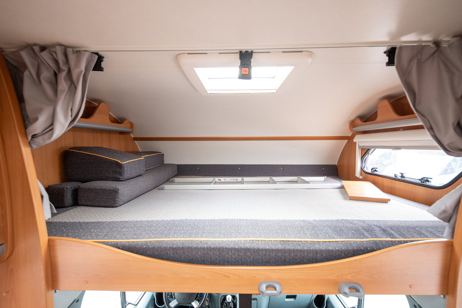Kiinteä alkovin ylävuode ja parivuode mahdollistavat mukavat yöunet jopa neljälle hengelle. Keittiöstä löytyvät liesi ja jääkaappi, ja peseytymistilat sisältävät kasetti-WC:n sekä pesualtaan. Takatalli tarjoaa hyvin säilytystilaa, ja pyöräteline sekä vetokoukku tuovat lisäkäyttömahdollisuuksia.