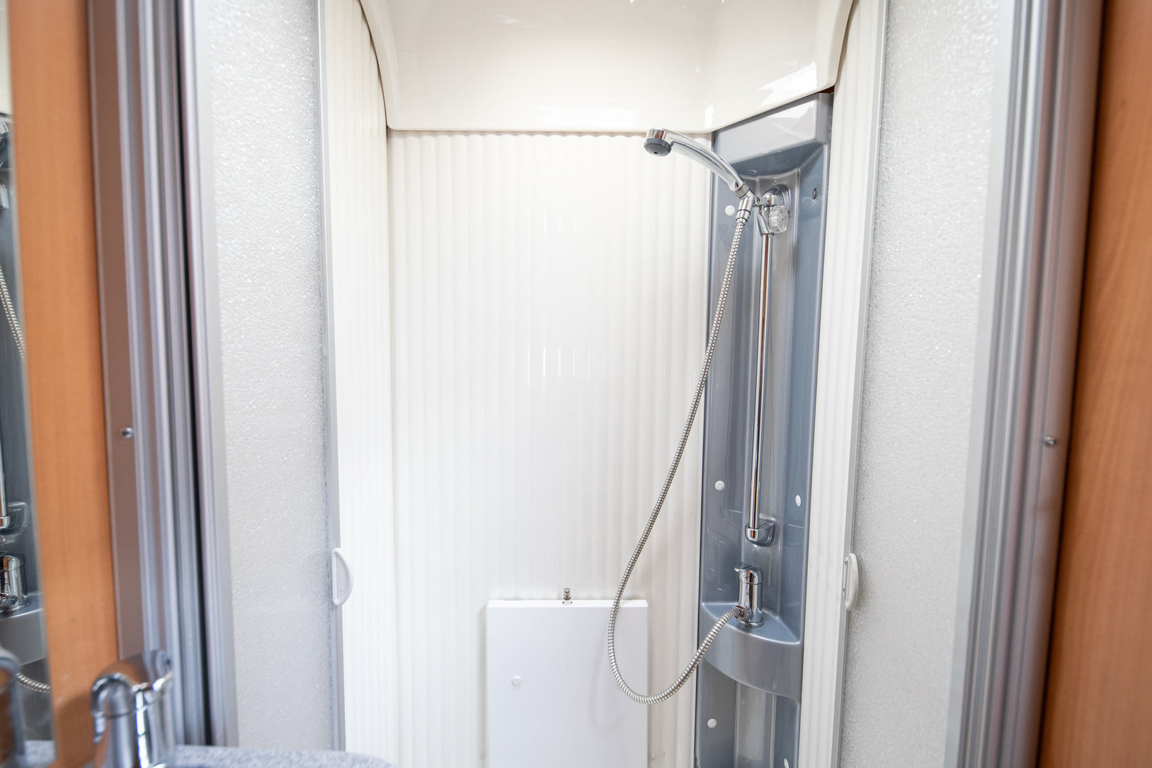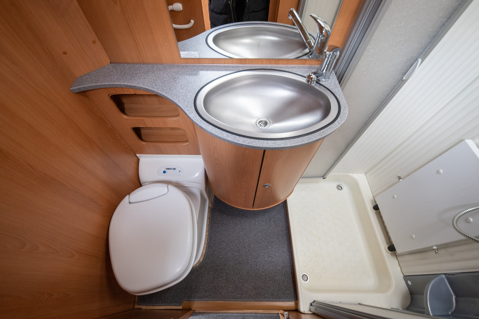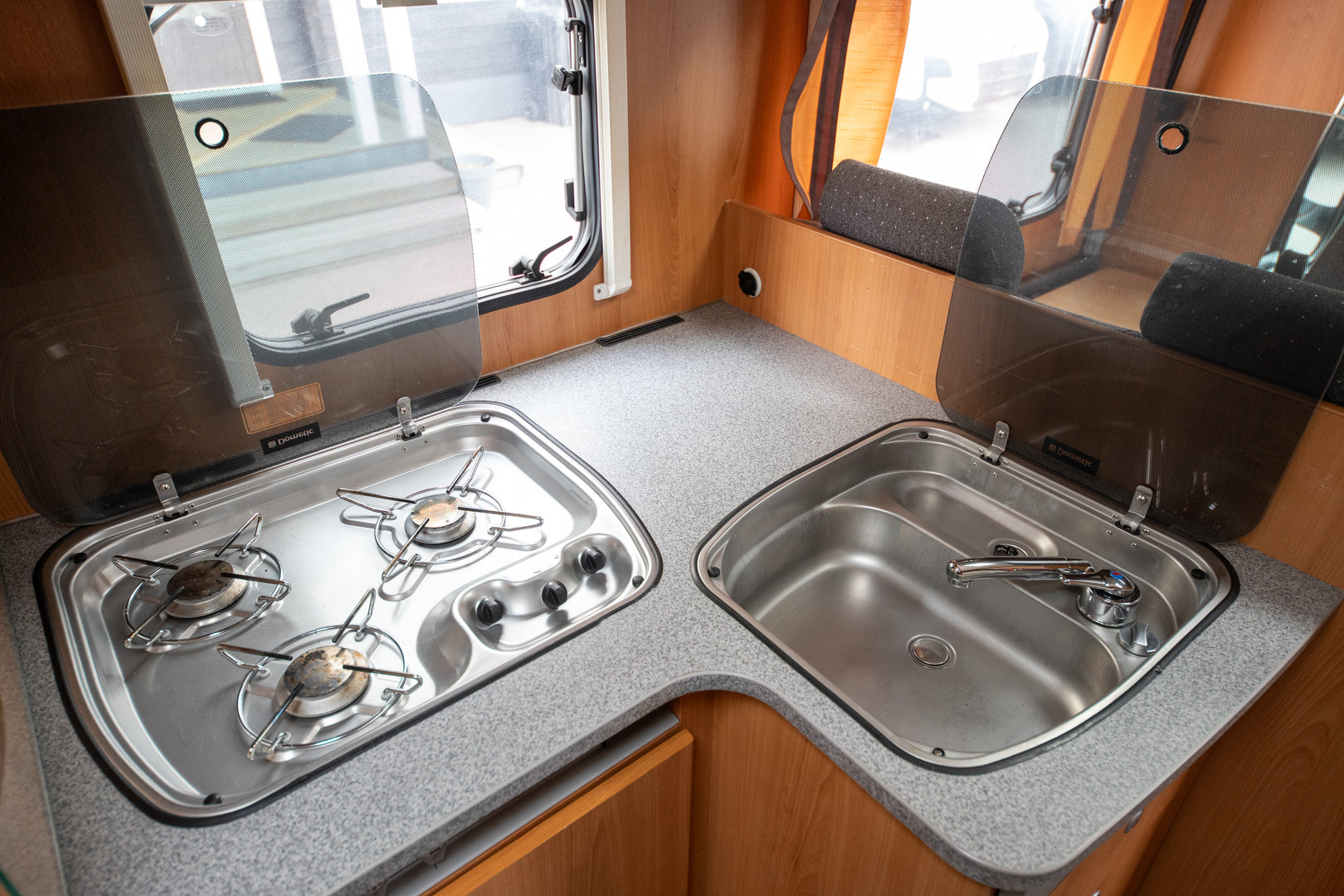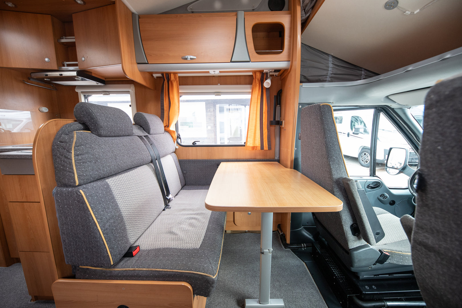 Kiinteä alkovin ylävuode ja parivuode mahdollistavat mukavat yöunet jopa neljälle hengelle. Keittiöstä löytyvät liesi ja jääkaappi, ja peseytymistilat sisältävät kasetti-WC:n sekä pesualtaan. Takatalli tarjoaa hyvin säilytystilaa, ja pyöräteline sekä vetokoukku tuovat lisäkäyttömahdollisuuksia.