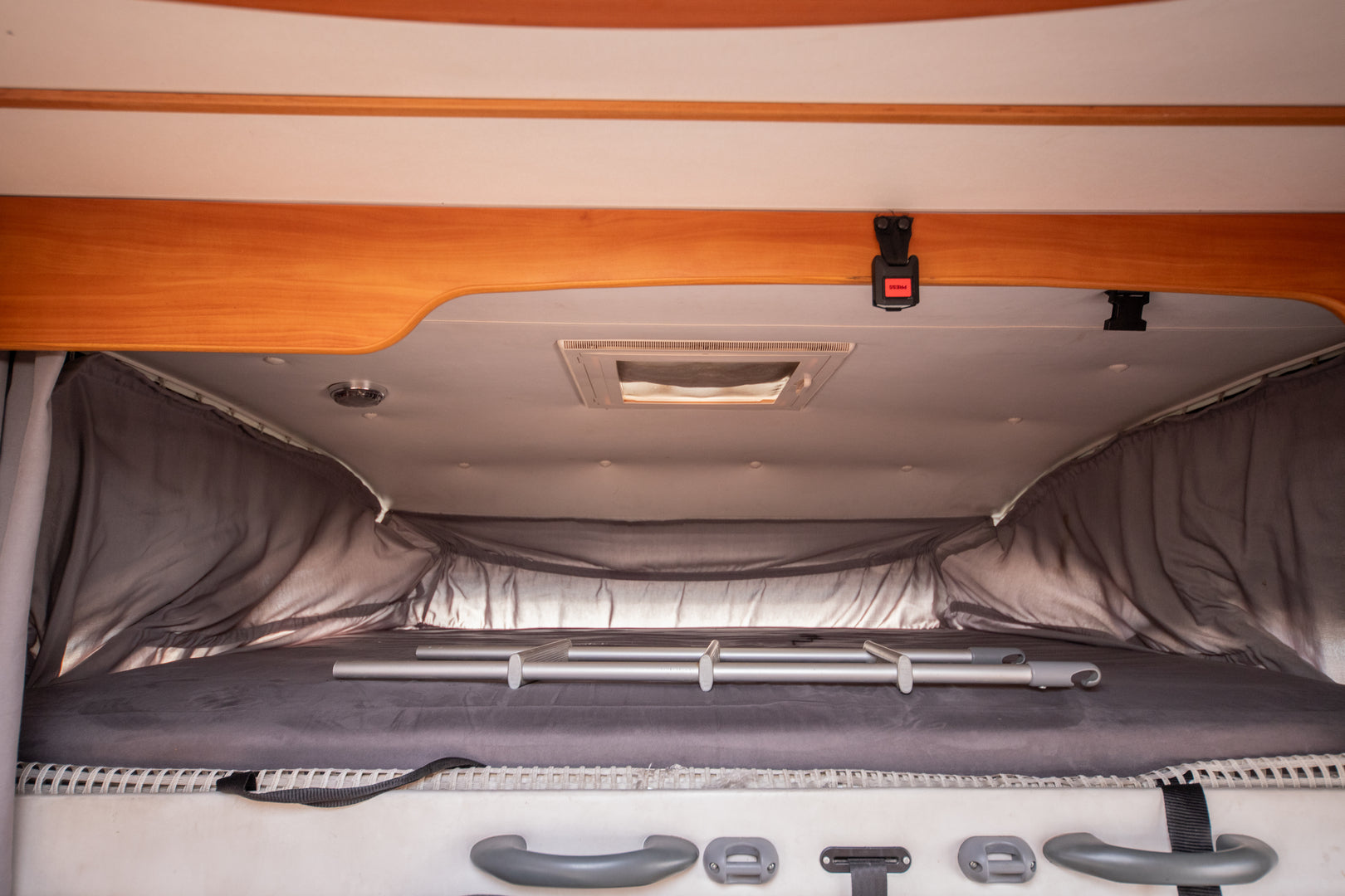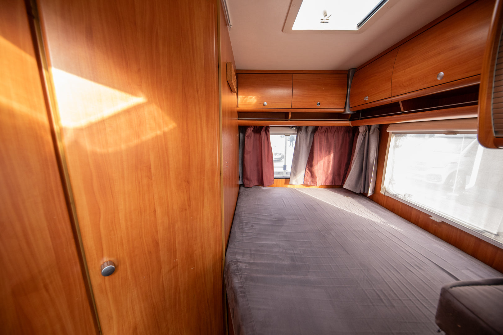 Sisällä odottaa käytännöllisesti suunniteltu tila, jossa mahtuu viettämään aikaa ja nukkumaan mukavasti. Manuaalisesti alas laskettava ylävuode sekä takana sijaitseva parivuode tarjoavat hyvät nukkumapaikat ilman, että yhteistä oleskelutilaa tarvitsee purkaa. Keittiössä on liesi, pesuallas ja jääkaappi, joilla ruoanlaitto sujuu helposti myös matkan päällä.