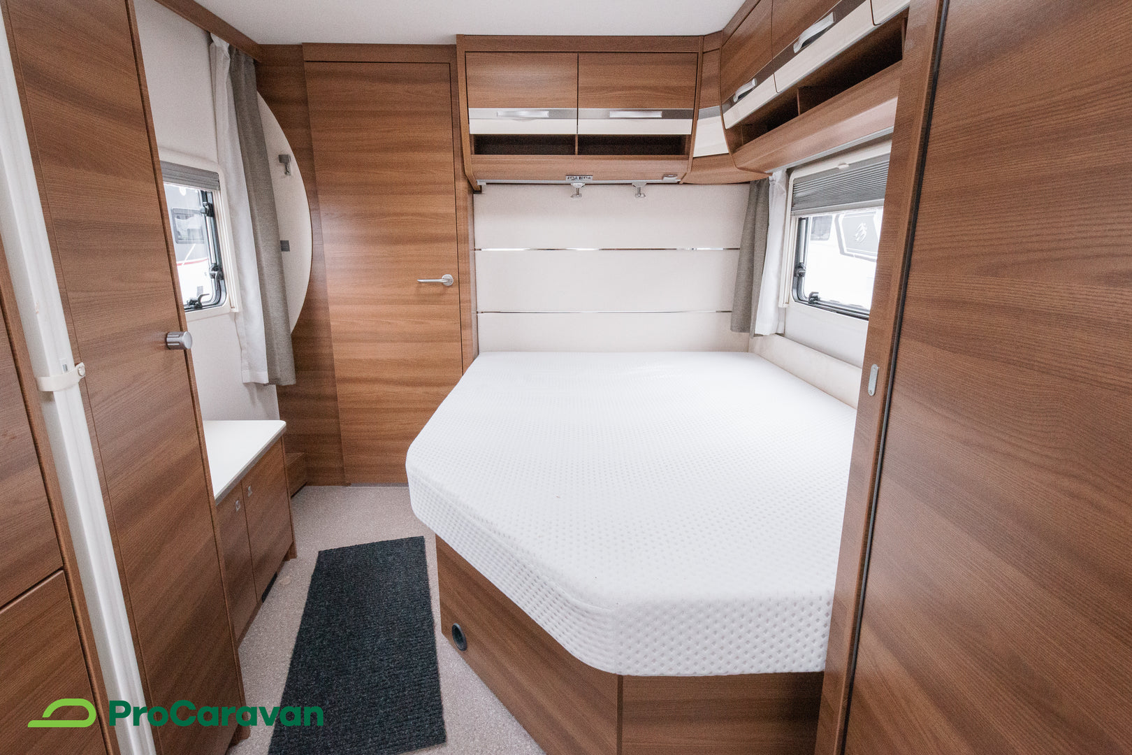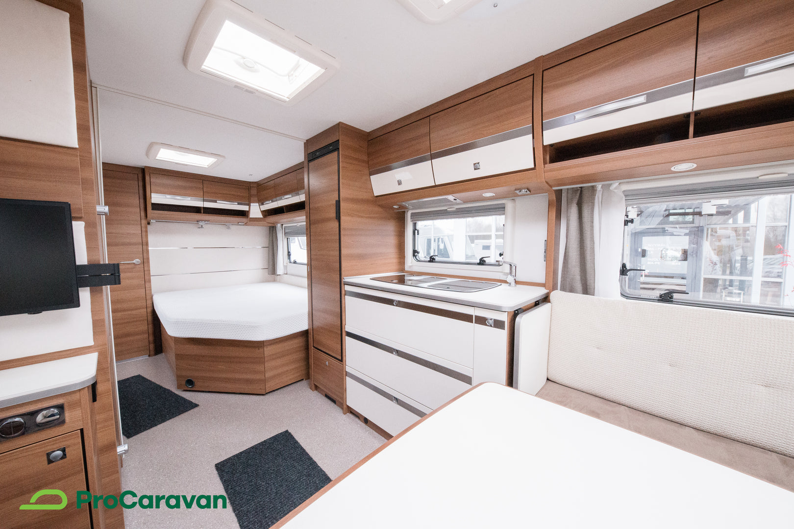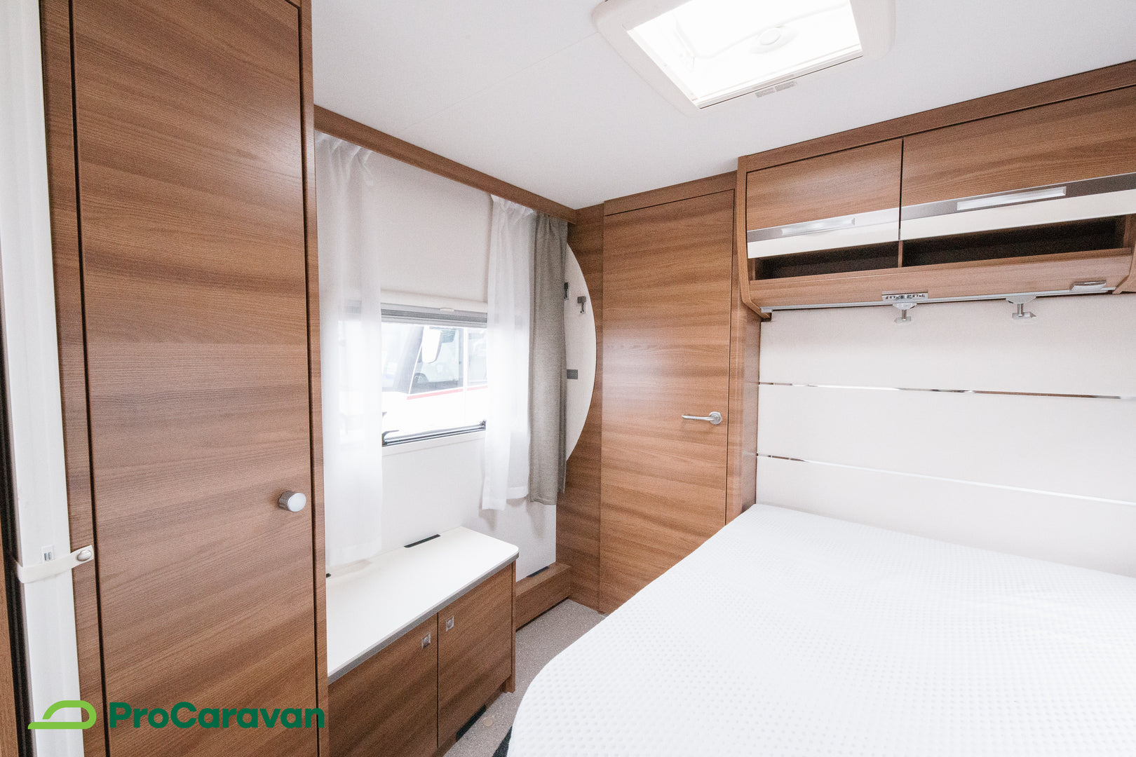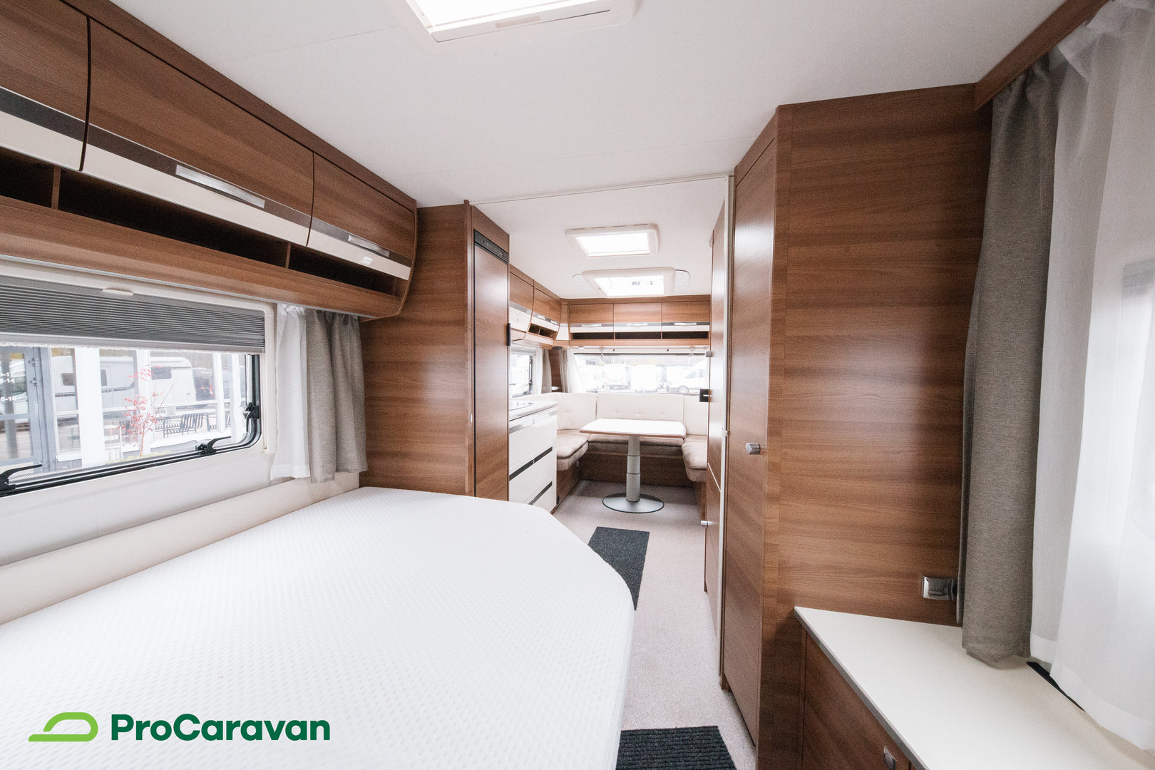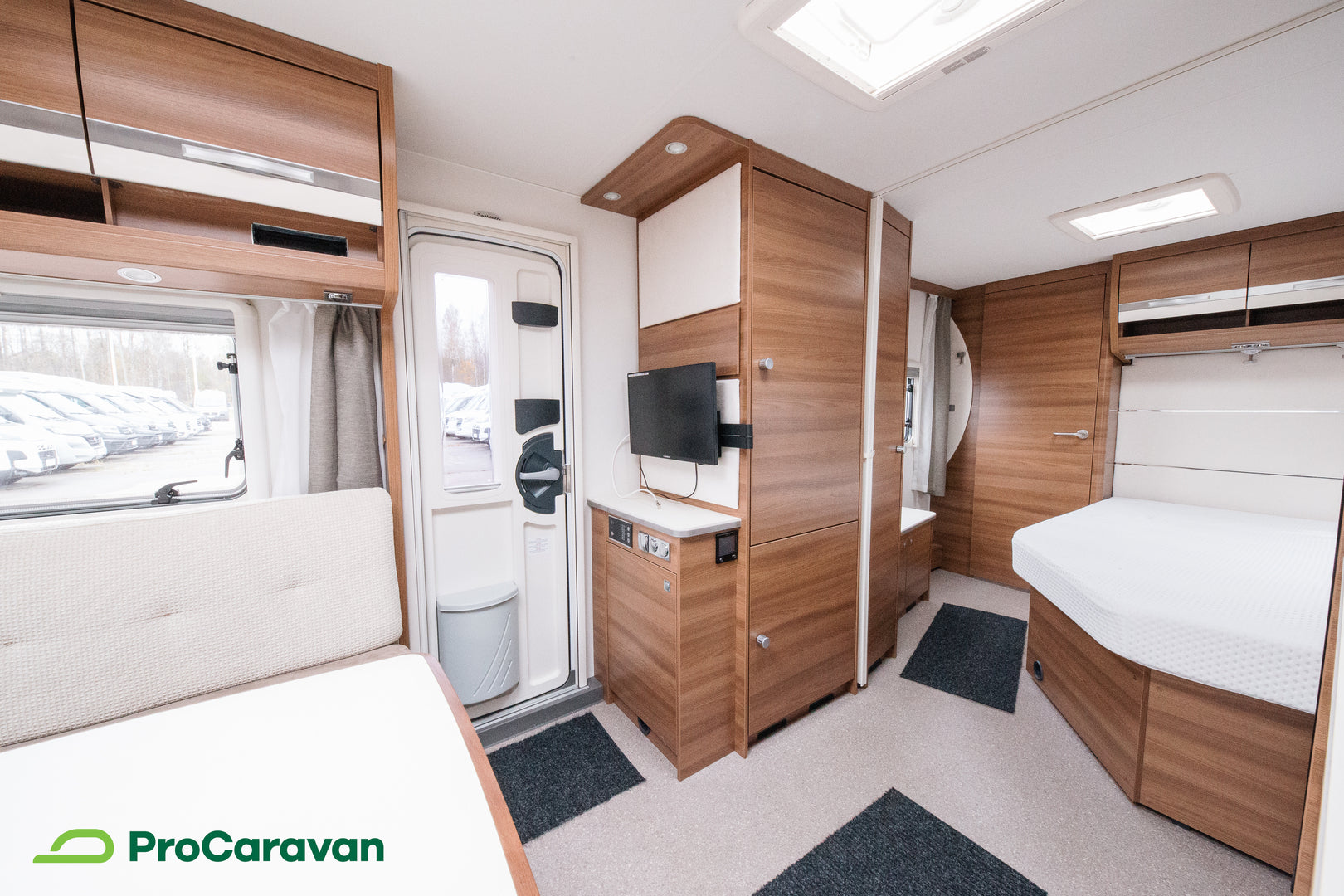 Makuutiloissa on mukava parivuode, ja lisävuode järjestyy helposti ruokailuryhmästä. Kattoikkuna tuo tilaan valoa ja avaruutta, kasettiverhot takaavat yksityisyyden ja rauhalliset yöunet.