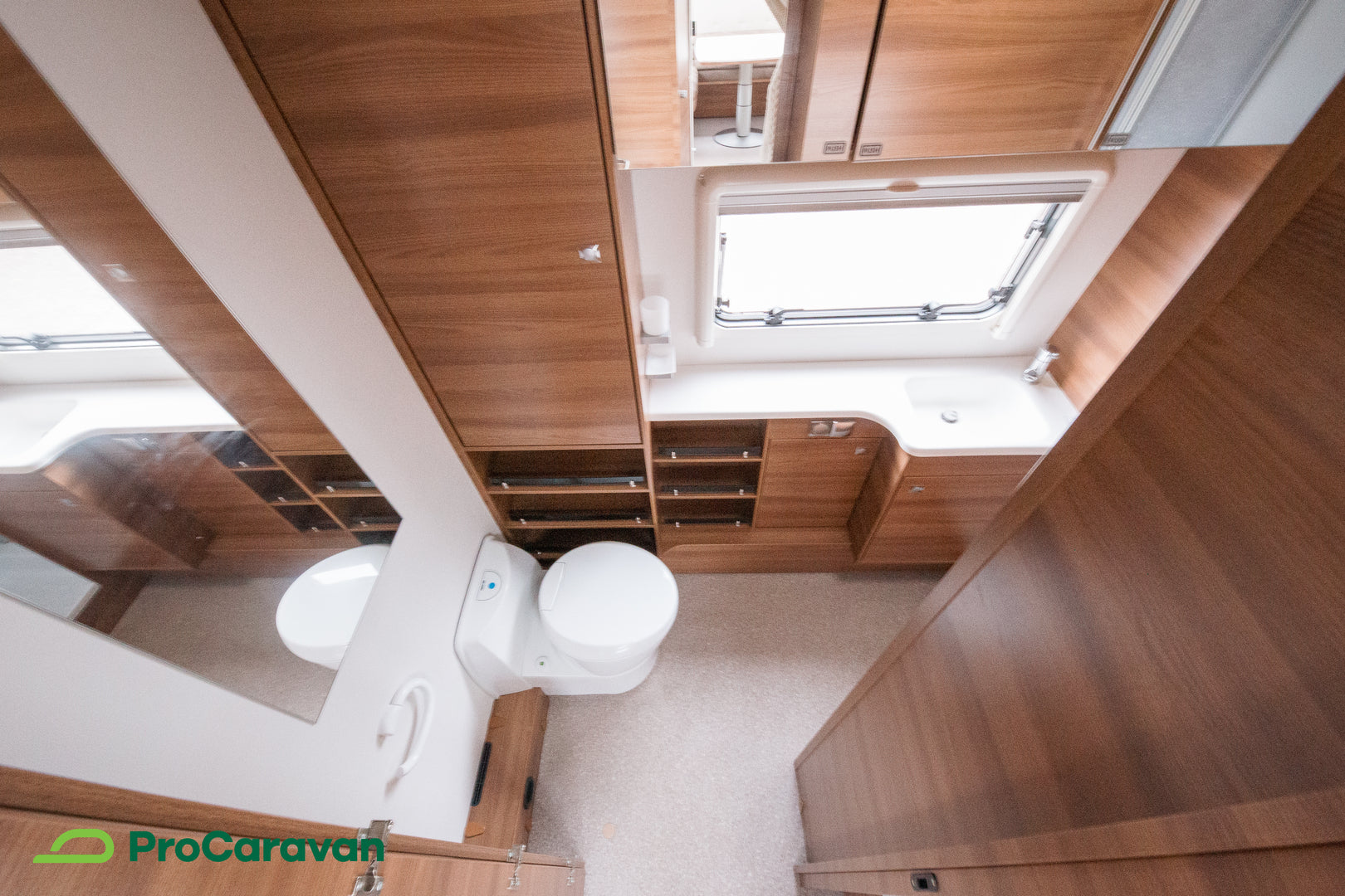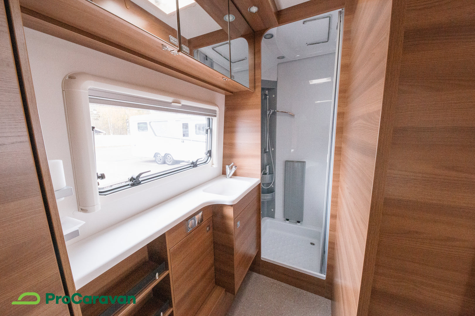 Nomadin kylpyhuoneessa on erillinen suihkutila, joka tuo lisäarvoa pidemmillä reissuilla. Käytössäsi on myös kasetti-WC, pesuallas ja suihku – kaikki selkeästi omissa paikoissaan. Käytännöllisyys näkyy myös muissa yksityiskohdissa, kuten hyttysverkko-ovessa ja lattiamatoissa asunto-osassa.