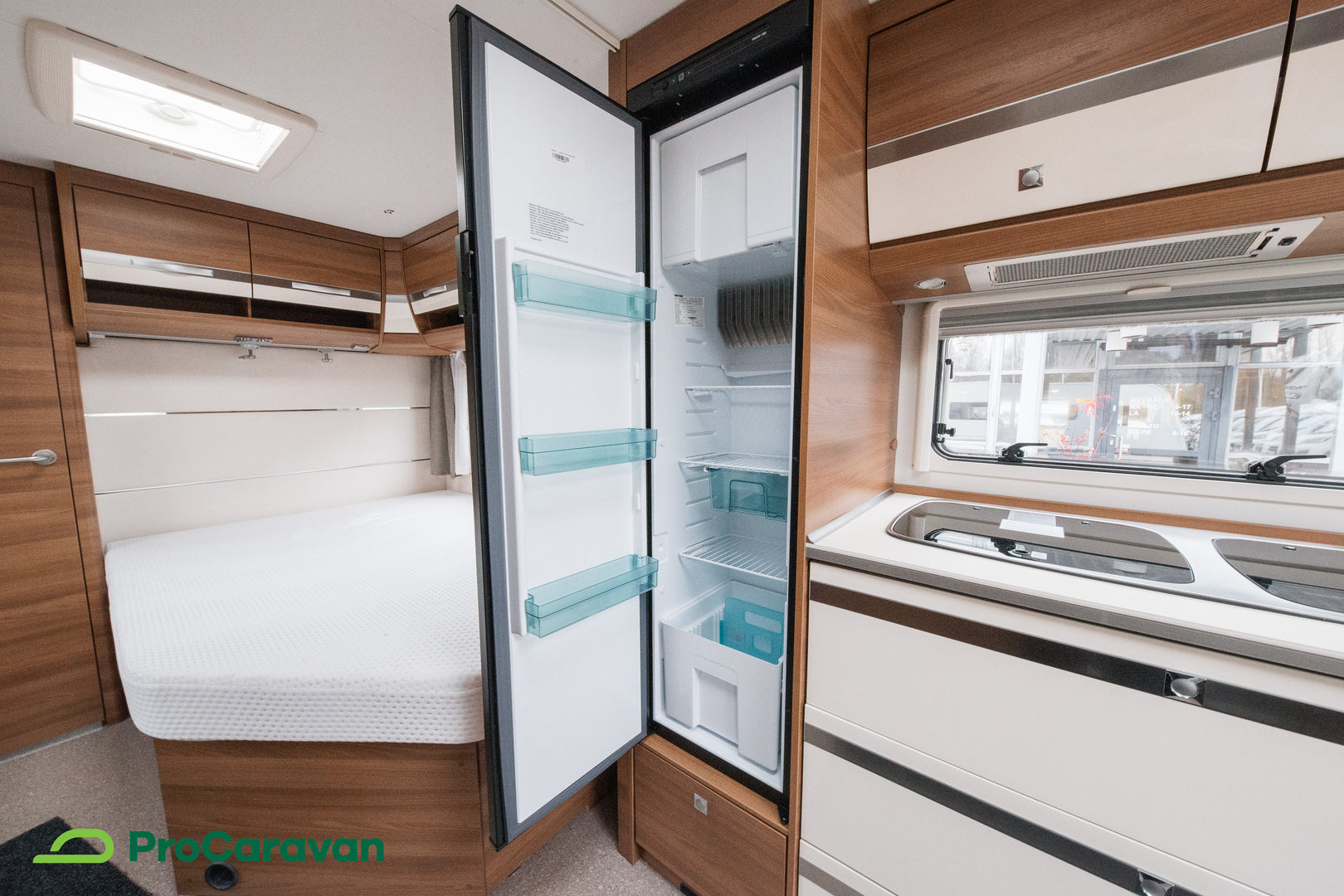 Kompaktin keittiön varustukseen kuuluu liesi, jääkaappi, pakastelokero ja liesituuletin, jotka helpottavat arkea reissun päällä. Huolella suunniteltu pohjaratkaisu mahdollistaa tehokkaan tilankäytön ilman kompromisseja mukavuudessa.