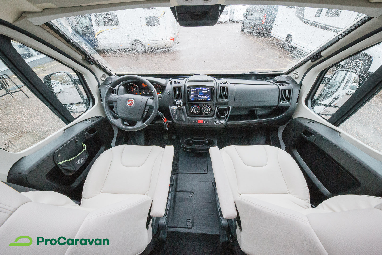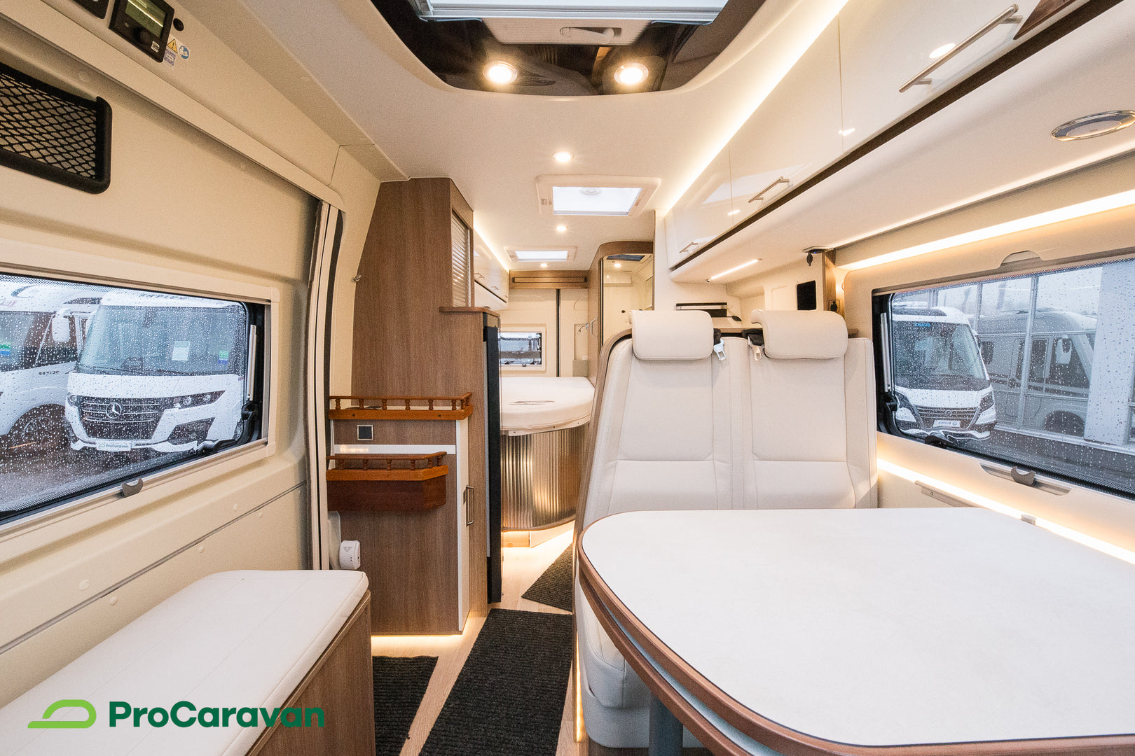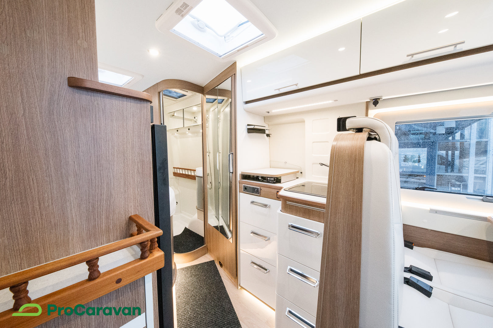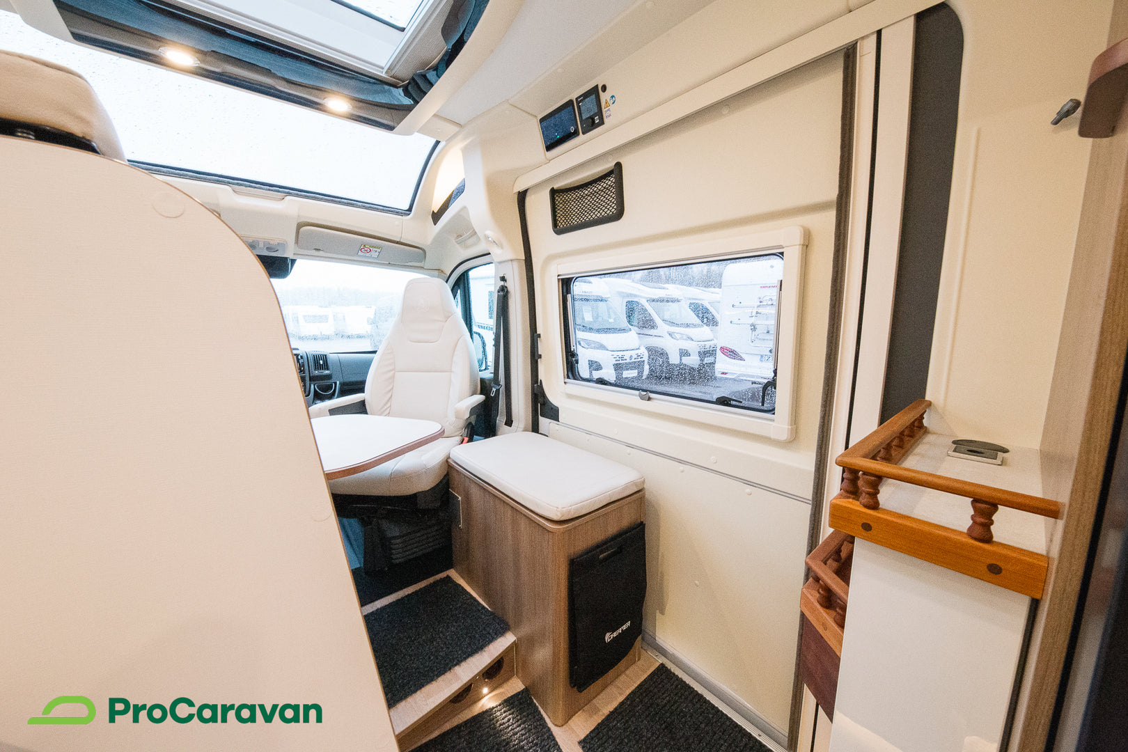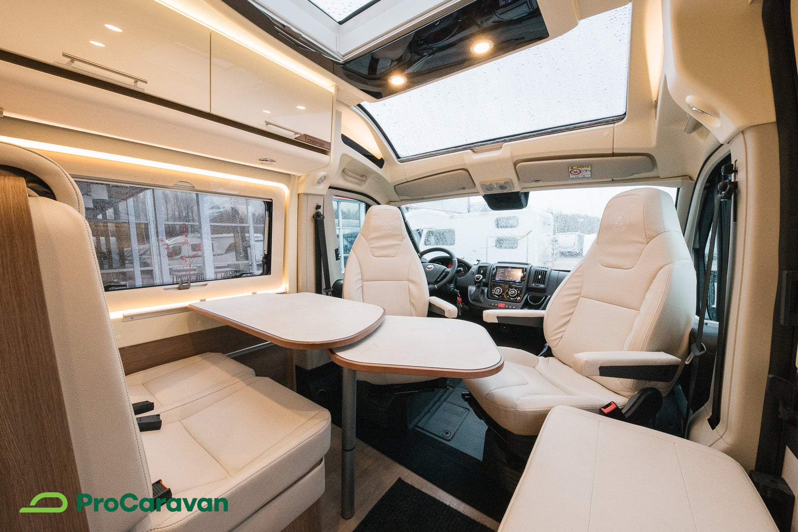 Sisätiloissa huomio kiinnittyy nahkasisustaan, panoraama kattoikkunaan ja viimeisteltyyn tunnelmaan. Kaasupullonvaihtaja Duocontrol sekä sähköinen lattialämmitys ja sähköpatruuna tuovat lisää mukavuutta pidemmilläkin reissuilla.