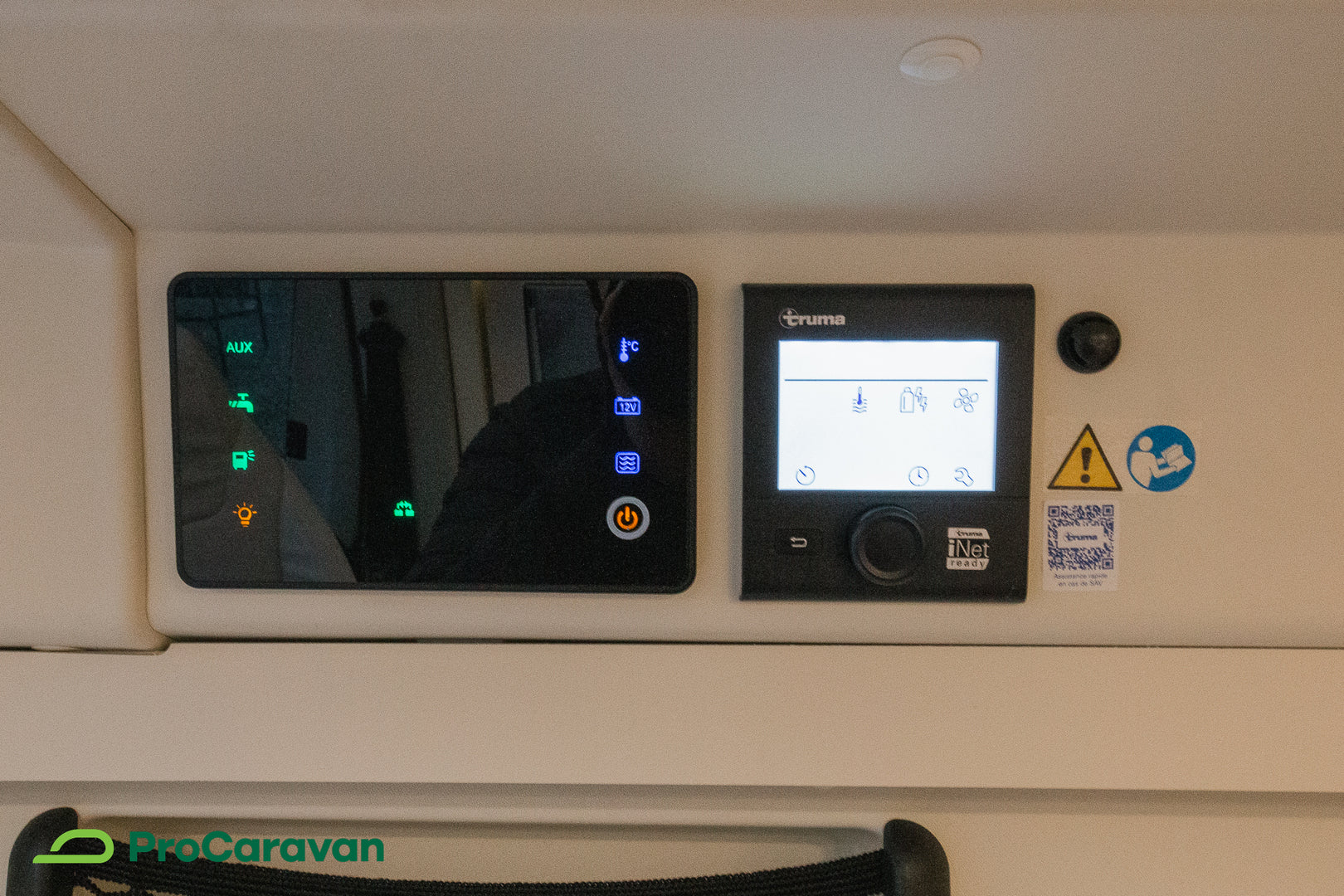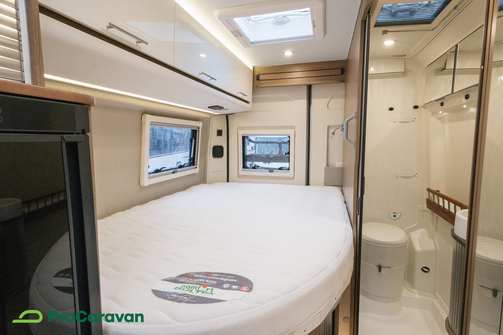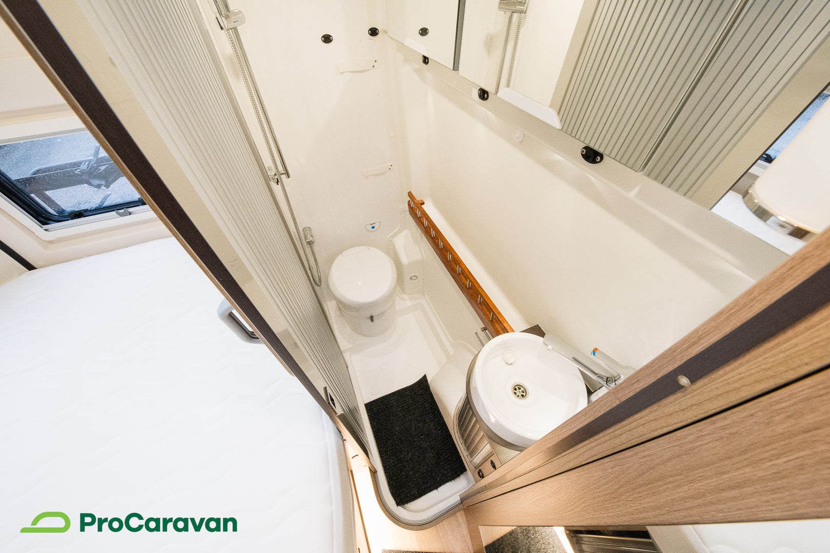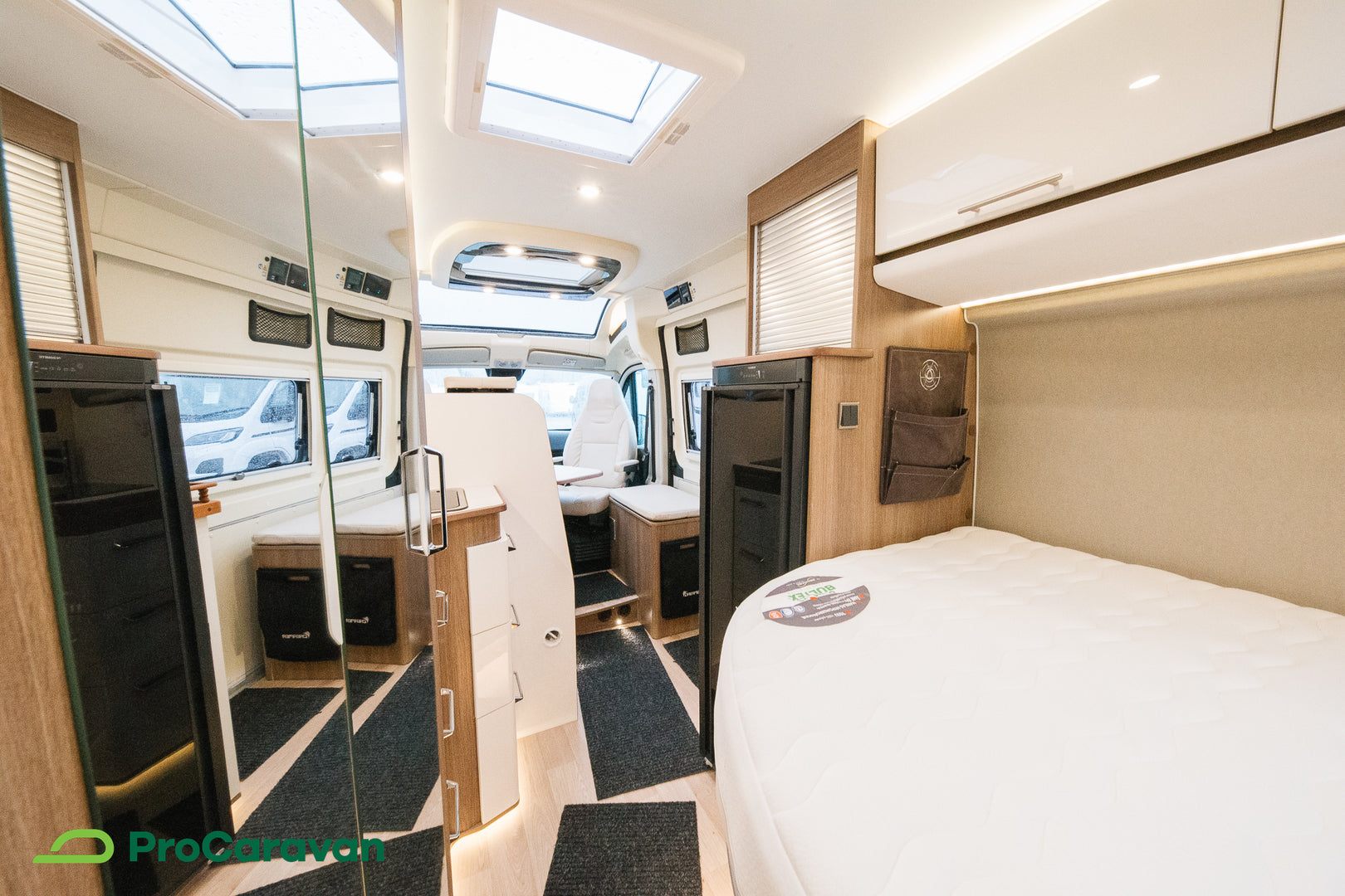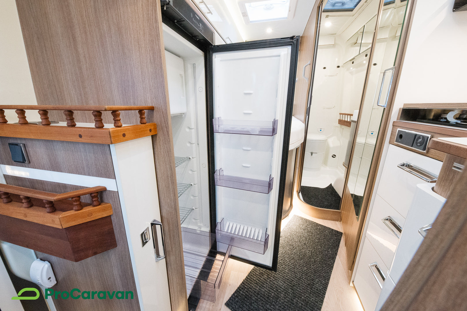 Sisätiloissa huomio kiinnittyy nahkasisustaan, panoraama kattoikkunaan ja viimeisteltyyn tunnelmaan. Kaasupullonvaihtaja Duocontrol sekä sähköinen lattialämmitys ja sähköpatruuna tuovat lisää mukavuutta pidemmilläkin reissuilla.