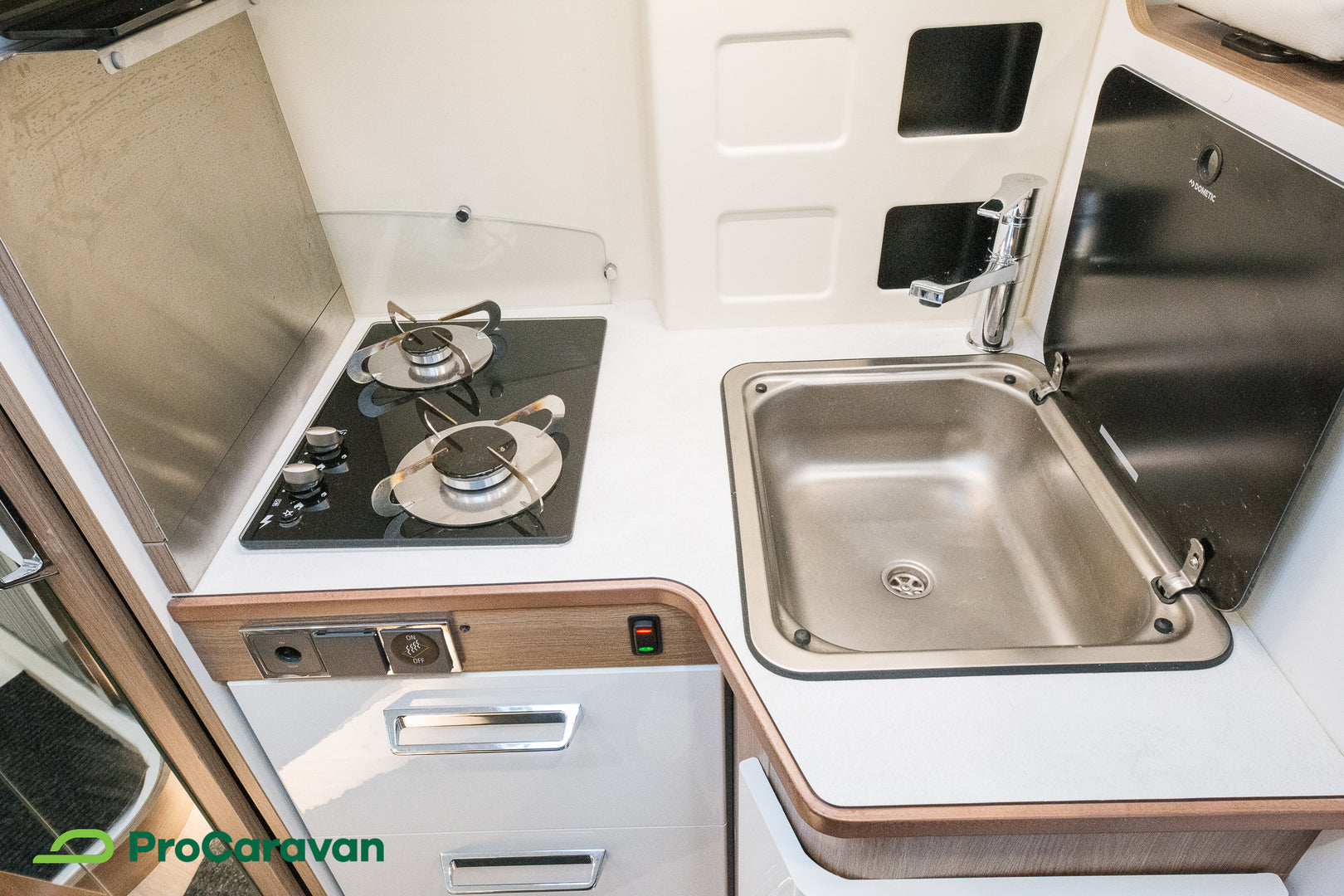 Ajoneuvon sisätiloissa on onnistuttu yhdistämään käytännöllisyys ja viihtyvyys. Parivuode tarjoaa levolliset yöunet ja käytännöllinen keittiö on varusteltu liesitasolla, isolla jääkaapilla ja pakastelokerolla. Peseytyminen onnistuu mukavasti erillisellä suihkulla, pesualtaalla ja kasetti-WC:llä.
