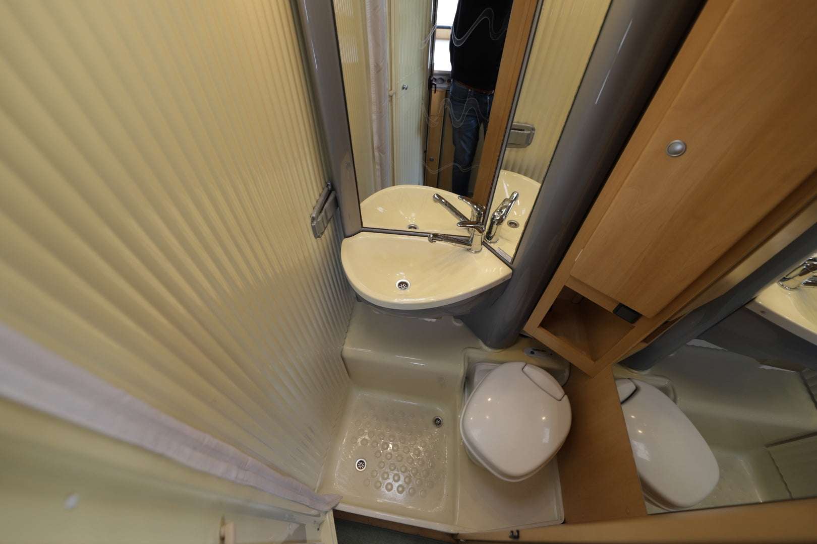 Kompakti koko ei tarkoita kompromisseja varustelussa. Keittiöstä löytyy liesi, jääkaappi ja pakastelokero, jotka tekevät ruoanlaitosta sujuvaa. Peseytymistilat ovat käytännölliset: erillinen suihku, kasetti-WC ja pesuallas takaavat mukavan hygienian myös pidemmillä matkoilla. Parivuode poikittain tarjoaa hyvän nukkumismukavuuden kahdelle.