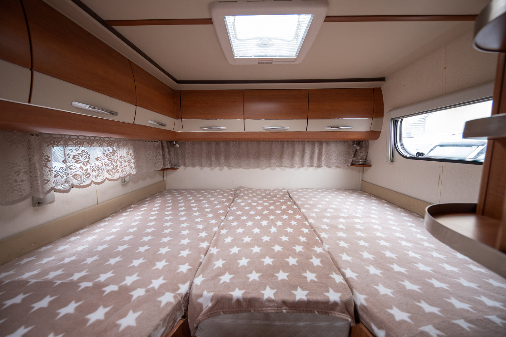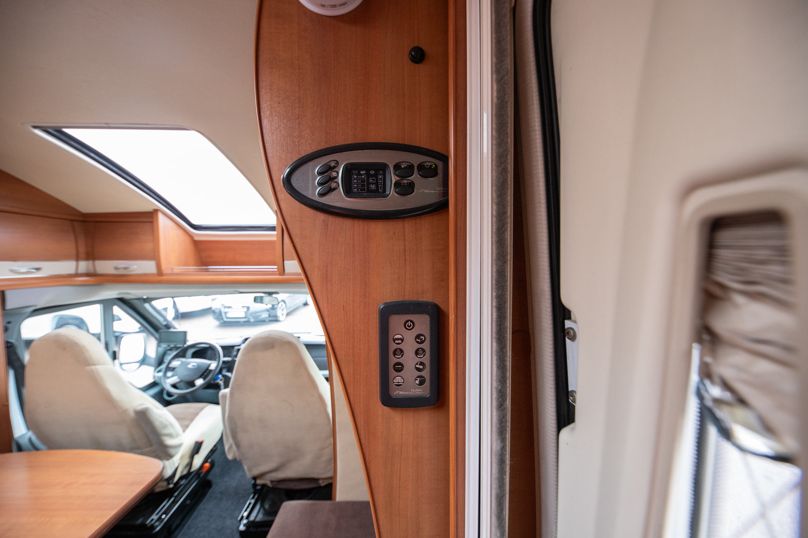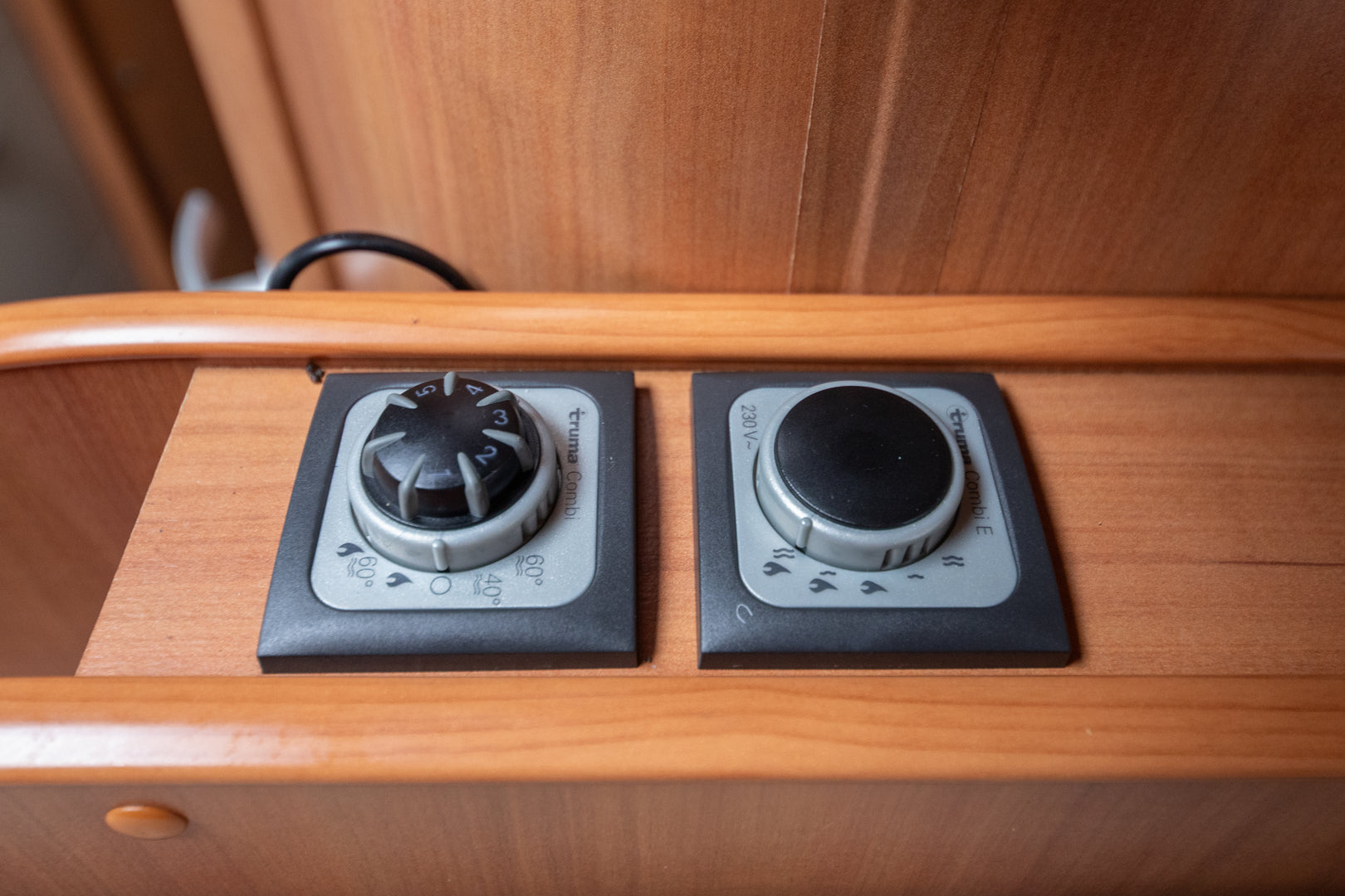 Truma-ilmakeskuslämmitys ja sähköpatruuna tuovat lämpöä kylmempiinkin päiviin. Oleskelutilat pysyvät viihtyisinä säästä riippumatta, ja sähkökäyttöinen porras helpottaa autoon kulkemista.