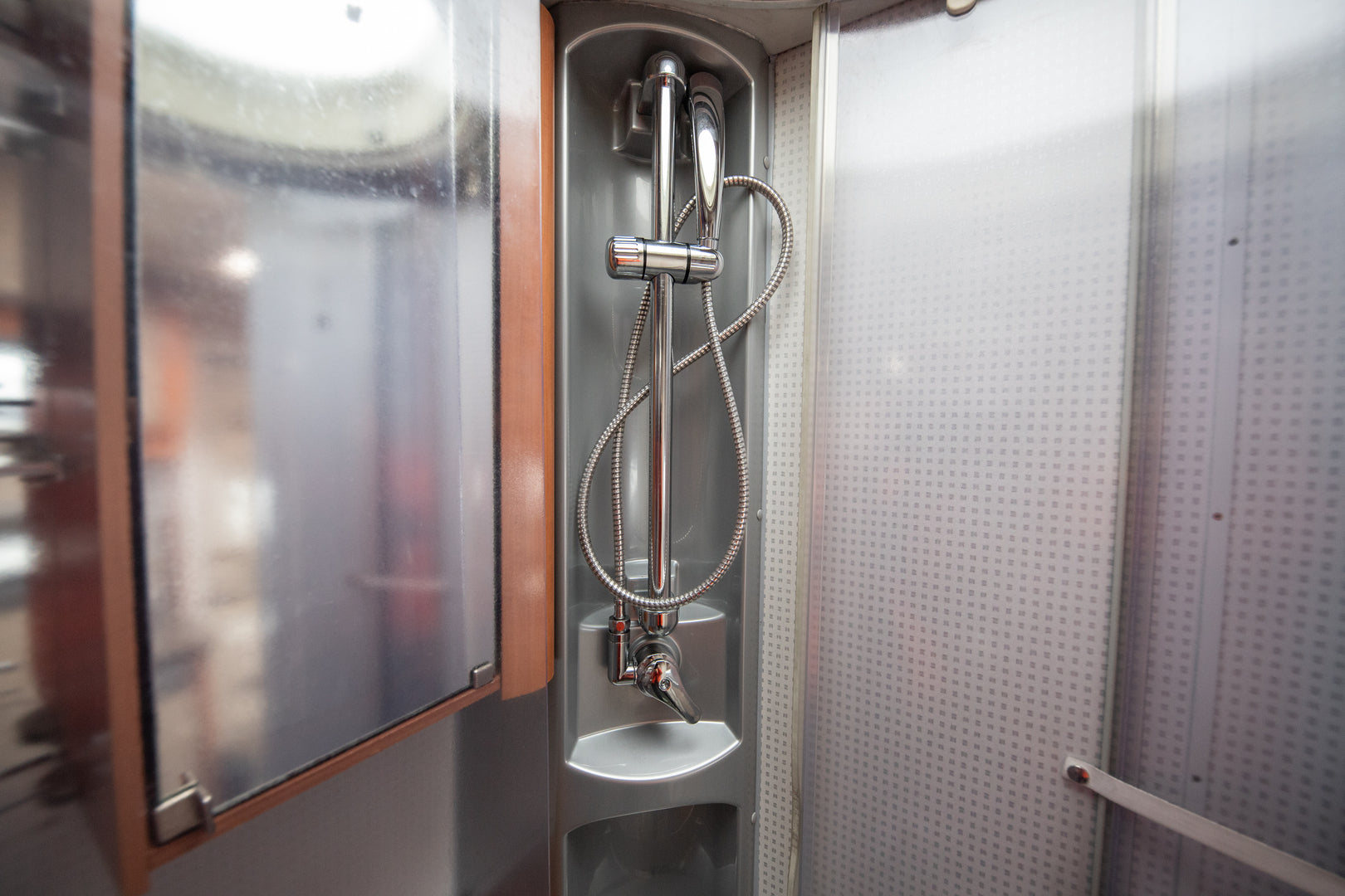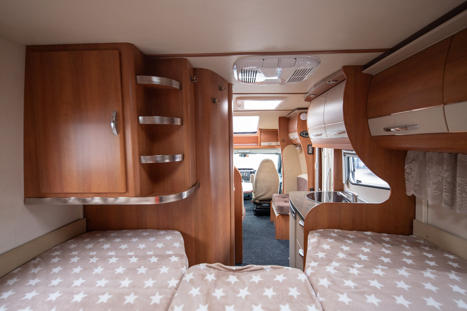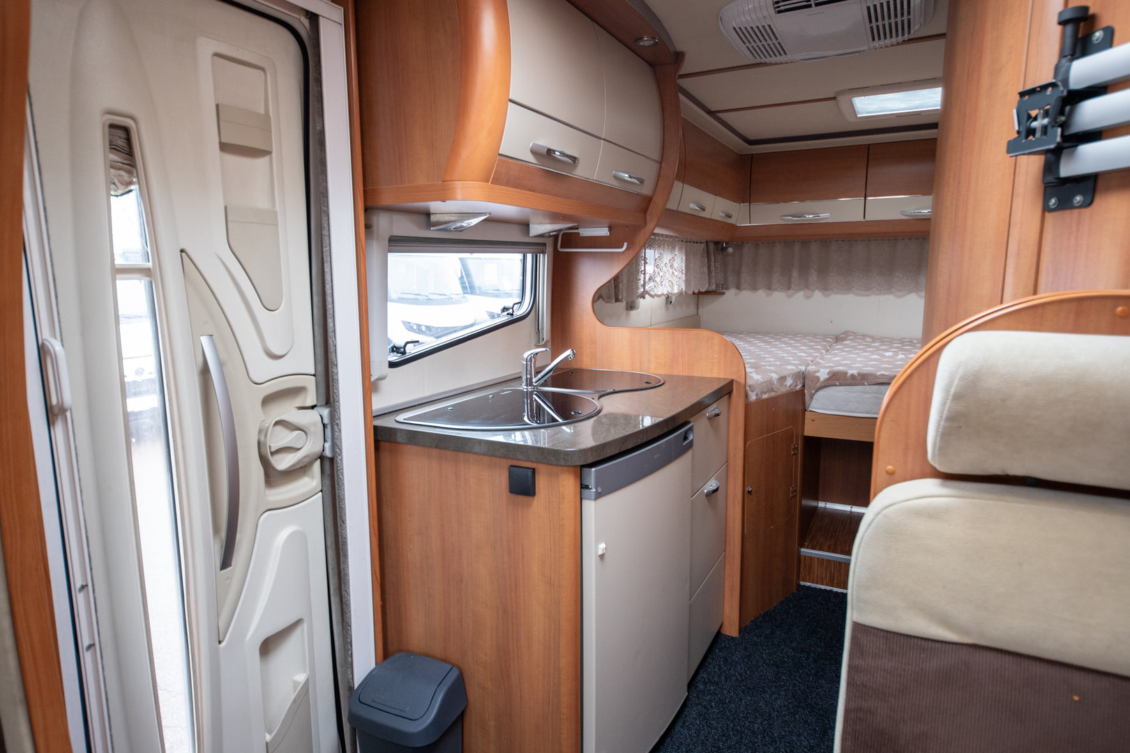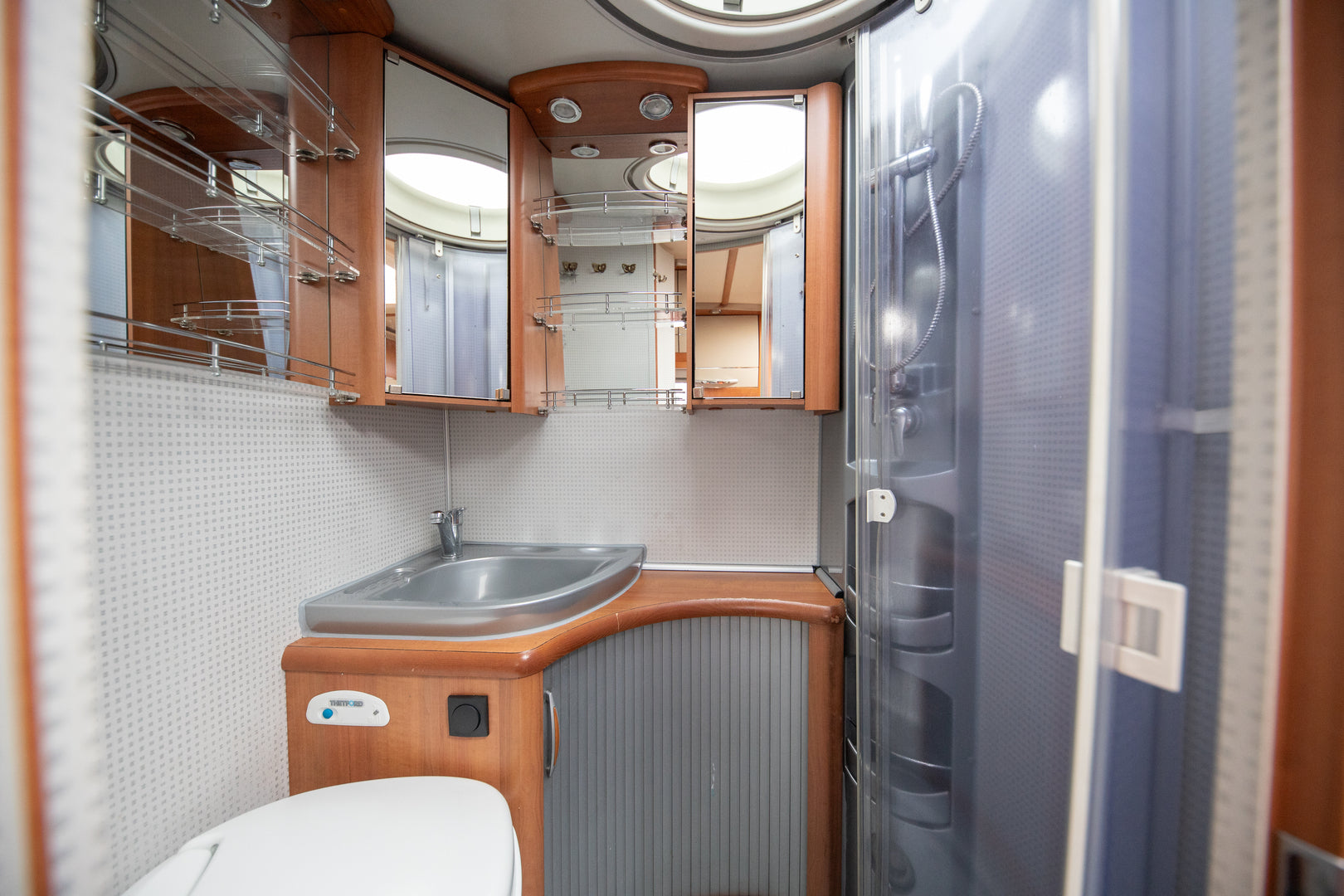 Truma-ilmakeskuslämmitys ja sähköpatruuna tuovat lämpöä kylmempiinkin päiviin. Oleskelutilat pysyvät viihtyisinä säästä riippumatta, ja sähkökäyttöinen porras helpottaa autoon kulkemista.