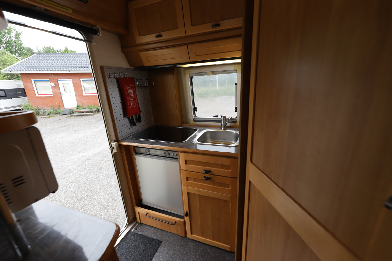 Takakeittiö tuo lisätilaa ja tehokkaan työskentelyalueen ruoanlaittoon. Liesi, jääkaappi ja mikroaaltouuni tarjoavat kaiken tarvittavan, ja ruokailuhetket onnistuvat tilavassa pöytäryhmässä, josta voi muuntaa tarvittaessa lisävuoteen. Kasetti-WC, suihku ja pesuallas tekevät arjesta matkallakin sujuvaa.