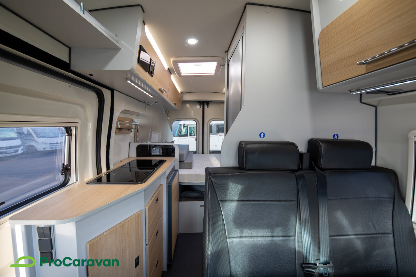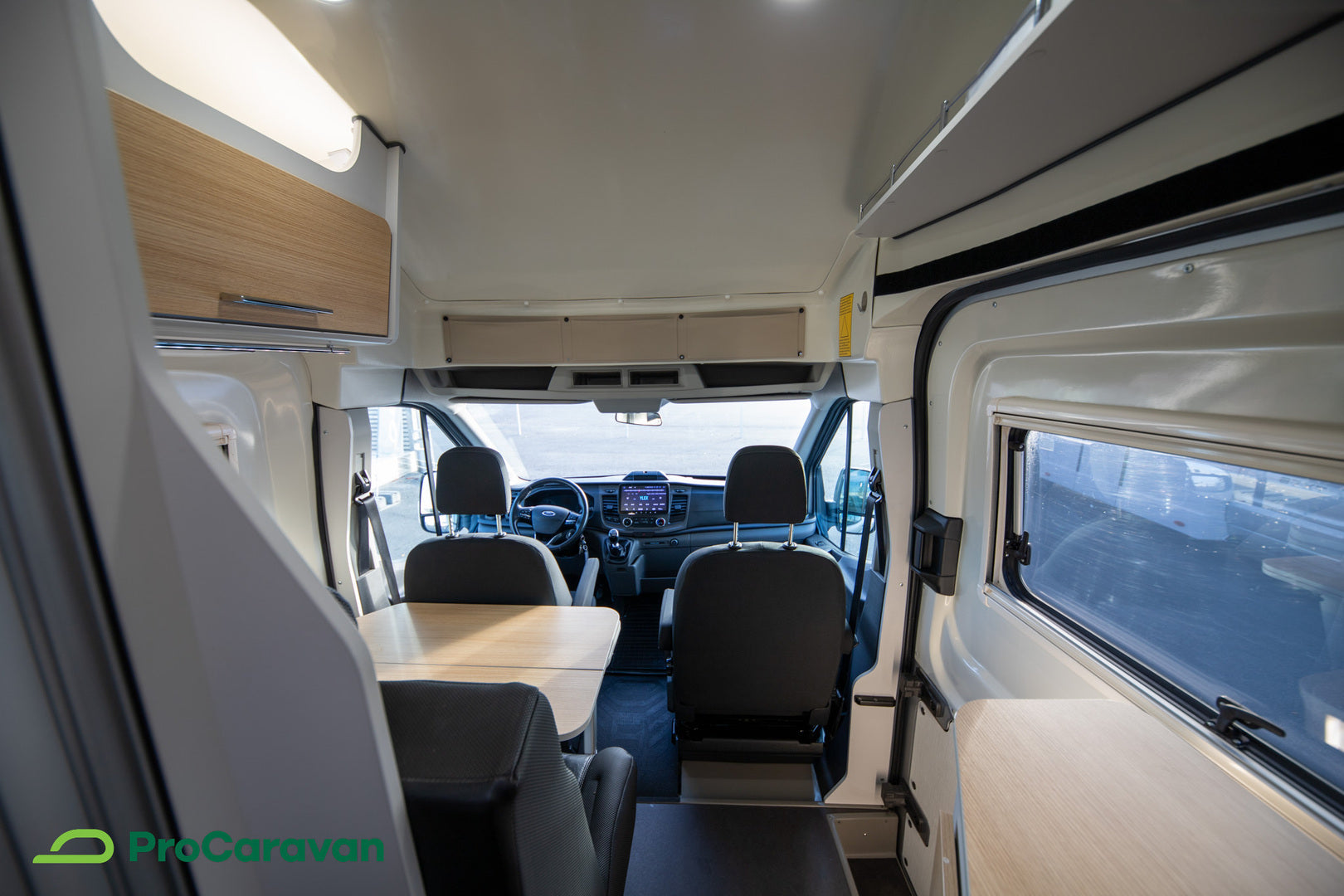 Sisätiloissa on panostettu käytännöllisyyteen: poikittainen parivuode ja vuode pöytäryhmästä tarjoavat nukkumapaikat, ja Truma-ilmakeskuslämmitys dieselkäyttöisenä yhdistettynä sähköpatruunaan varmistaa tasaisen lämmön ympäri vuoden. Polttoainekäyttöinen lisälämmitin ja lämminvesivaraaja tukevat arjen mukavuutta myös kylmemmillä keleillä. Kaksi asuinosan akkua parantaa omavaraisuutta reissussa.