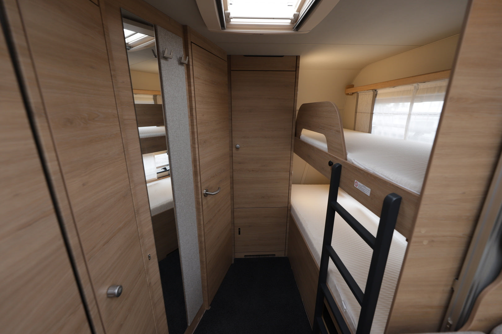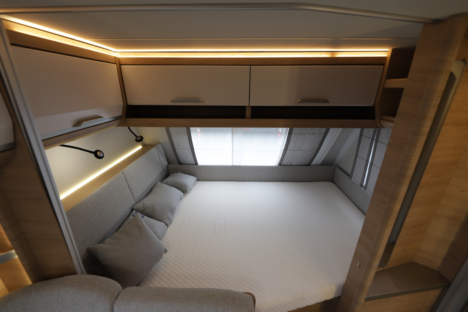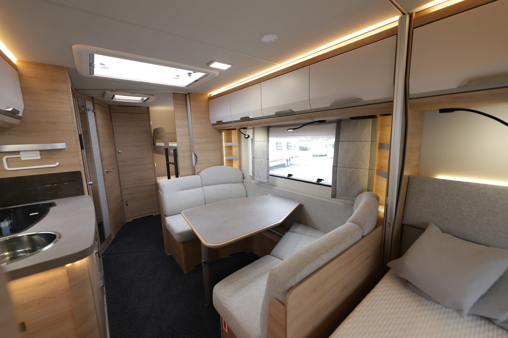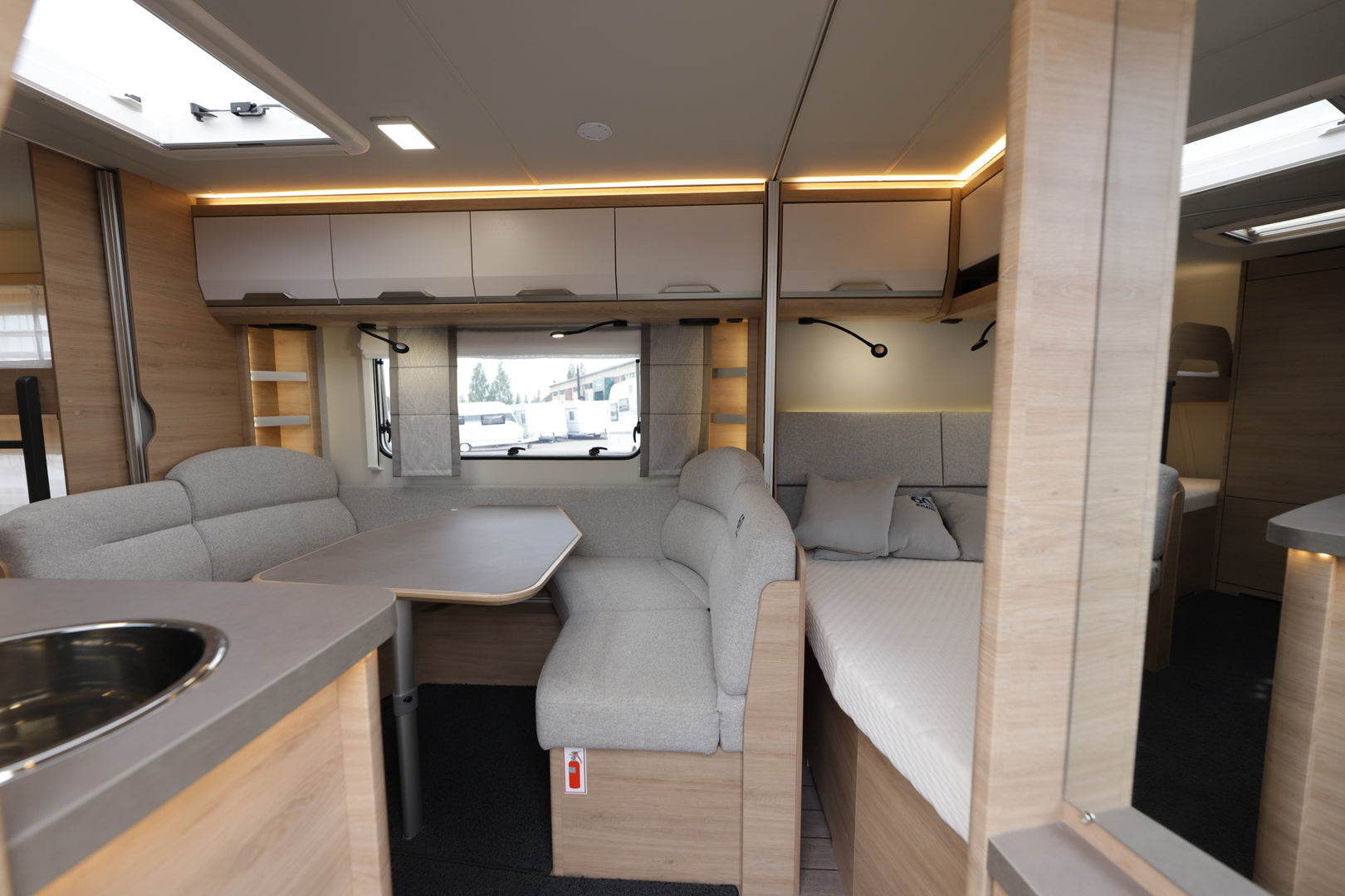 Oleskelualueessa on tilava pöytäryhmä, asuinosan kaiuttimet ja viihteen ystäviä varten vaunu on varustettu TV-telineellä, antennilla ja kattavilla sähköratkaisuilla. Kasettiverhot, hyttysverkko-ovi ja kattoikkuna lisäävät käyttömukavuutta kaikissa sääolosuhteissa.