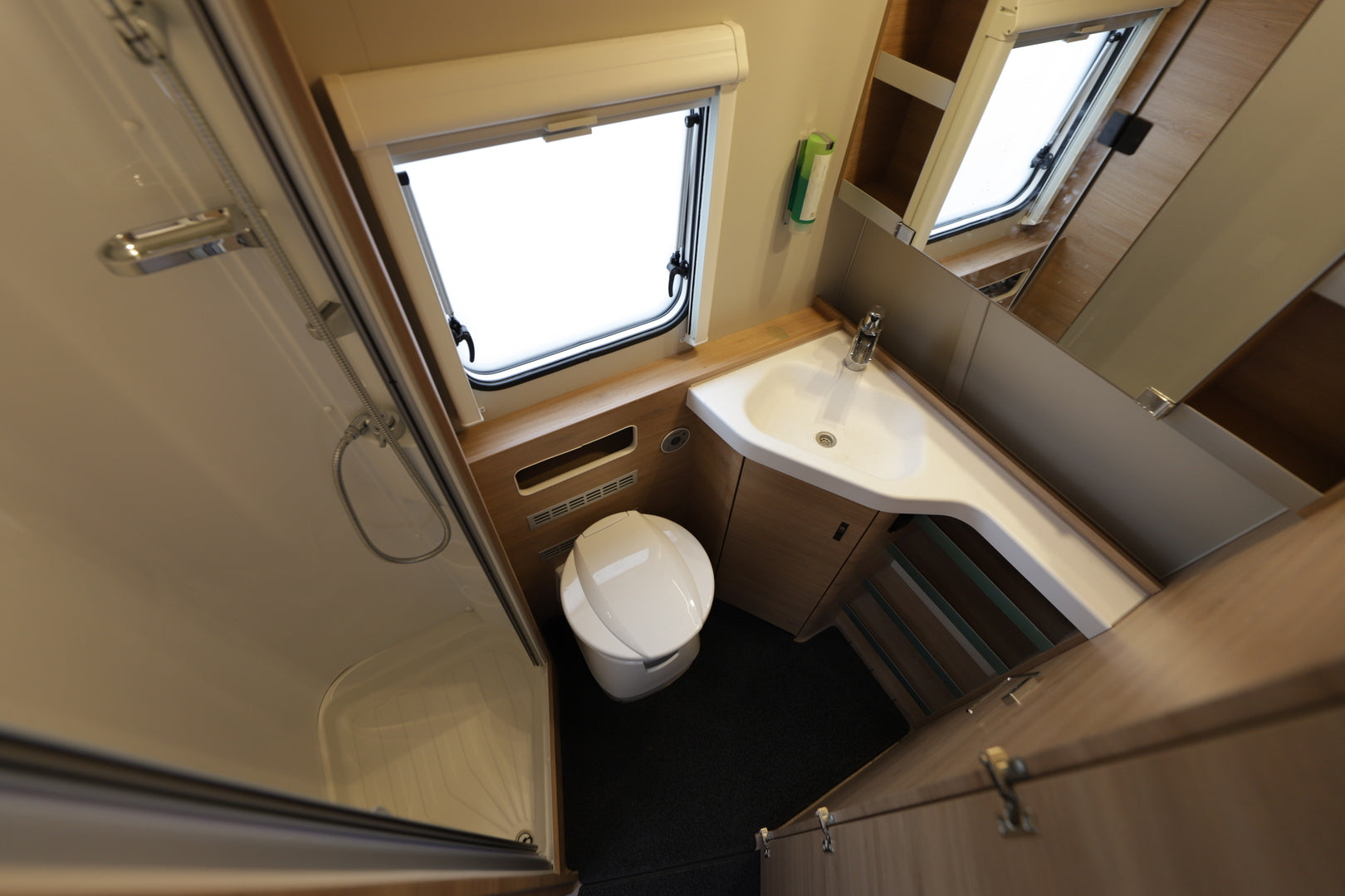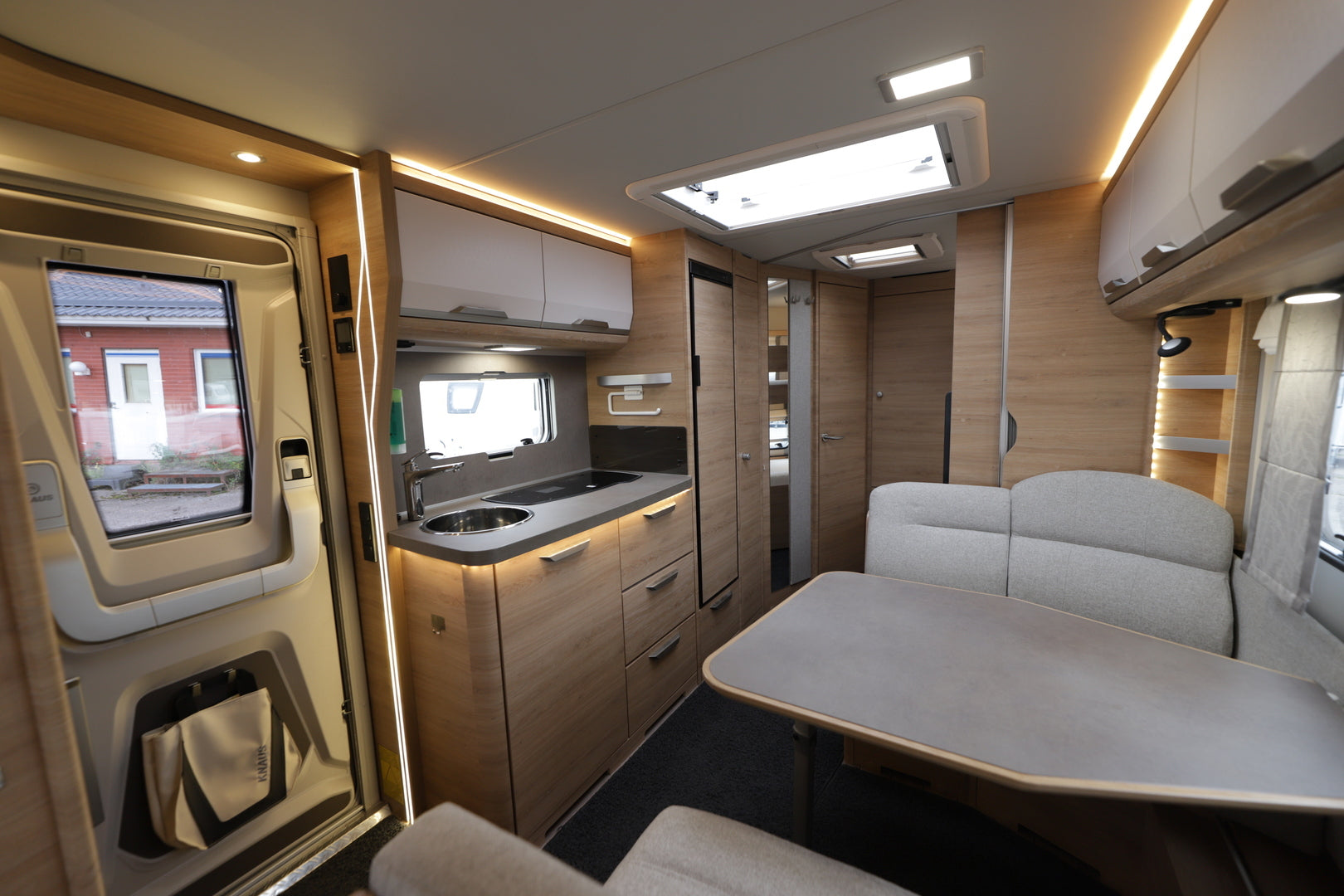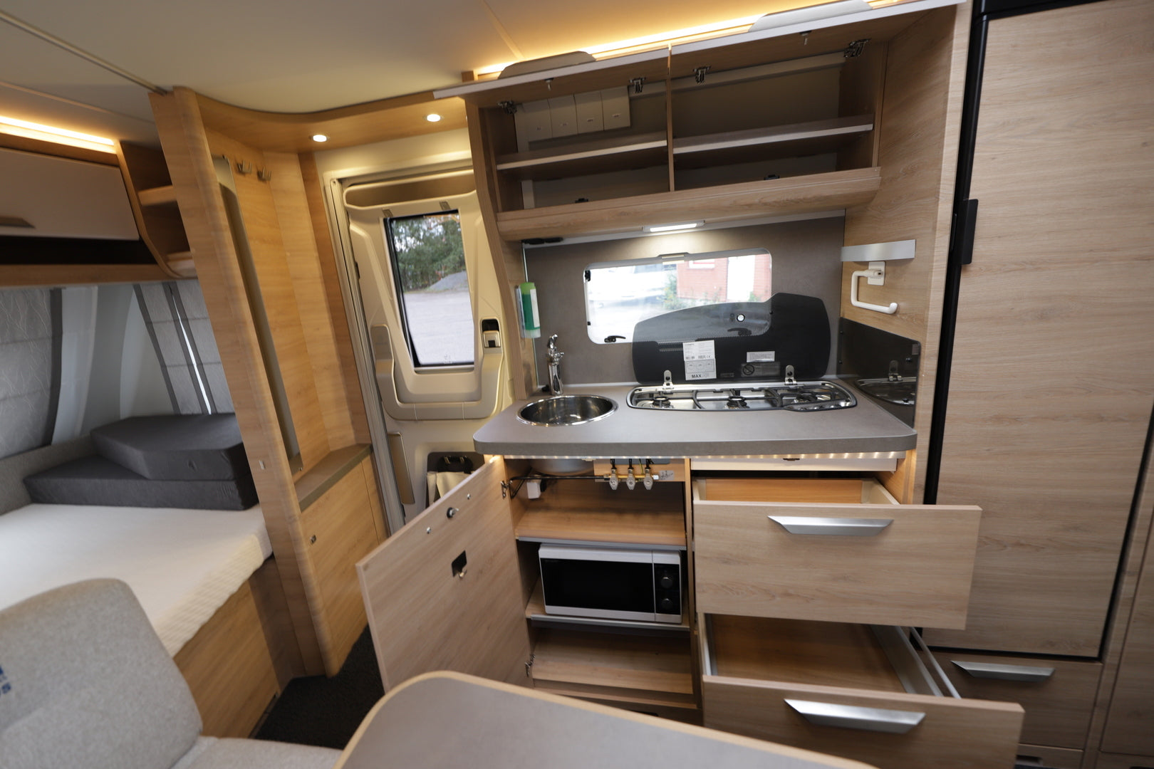 Vaunun keittiö on varustettu jääkaapilla, pakastelokerolla ja liedellä, joten ruoanlaitto sujuu helposti reissun päällä. Peseytymistiloista löytyy suihku, kasetti-WC ja pesuallas, jotka tuovat arjen mukavuudet matkalle mukaan. Lämminvesivaraaja viimeistelee käytännöllisyyden.