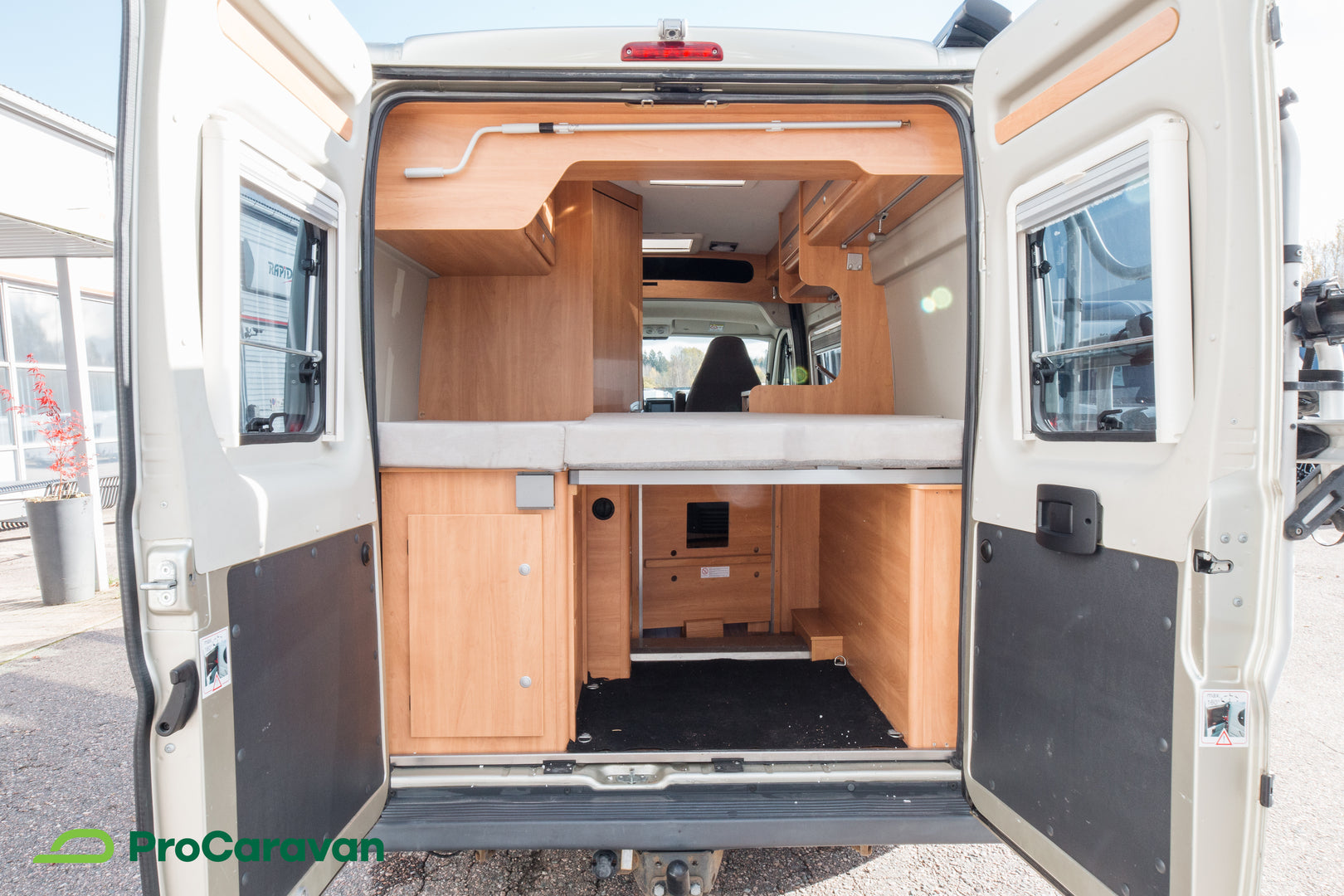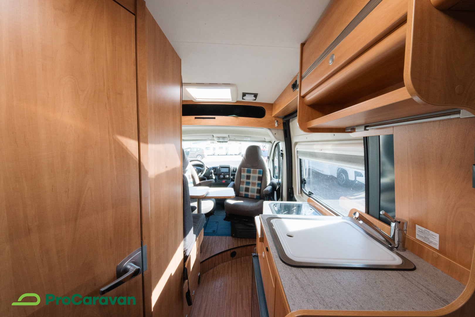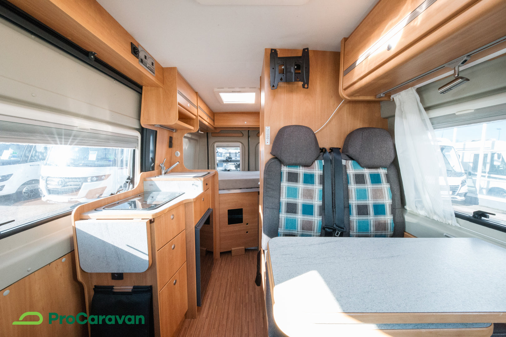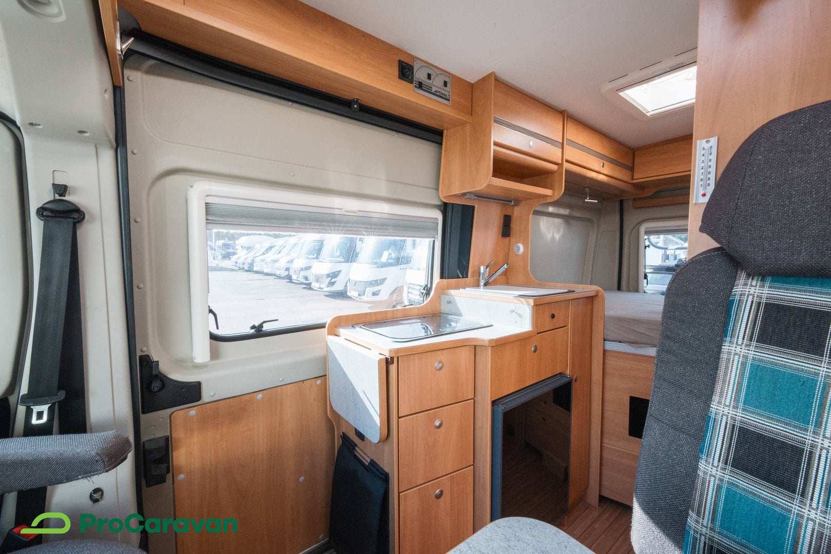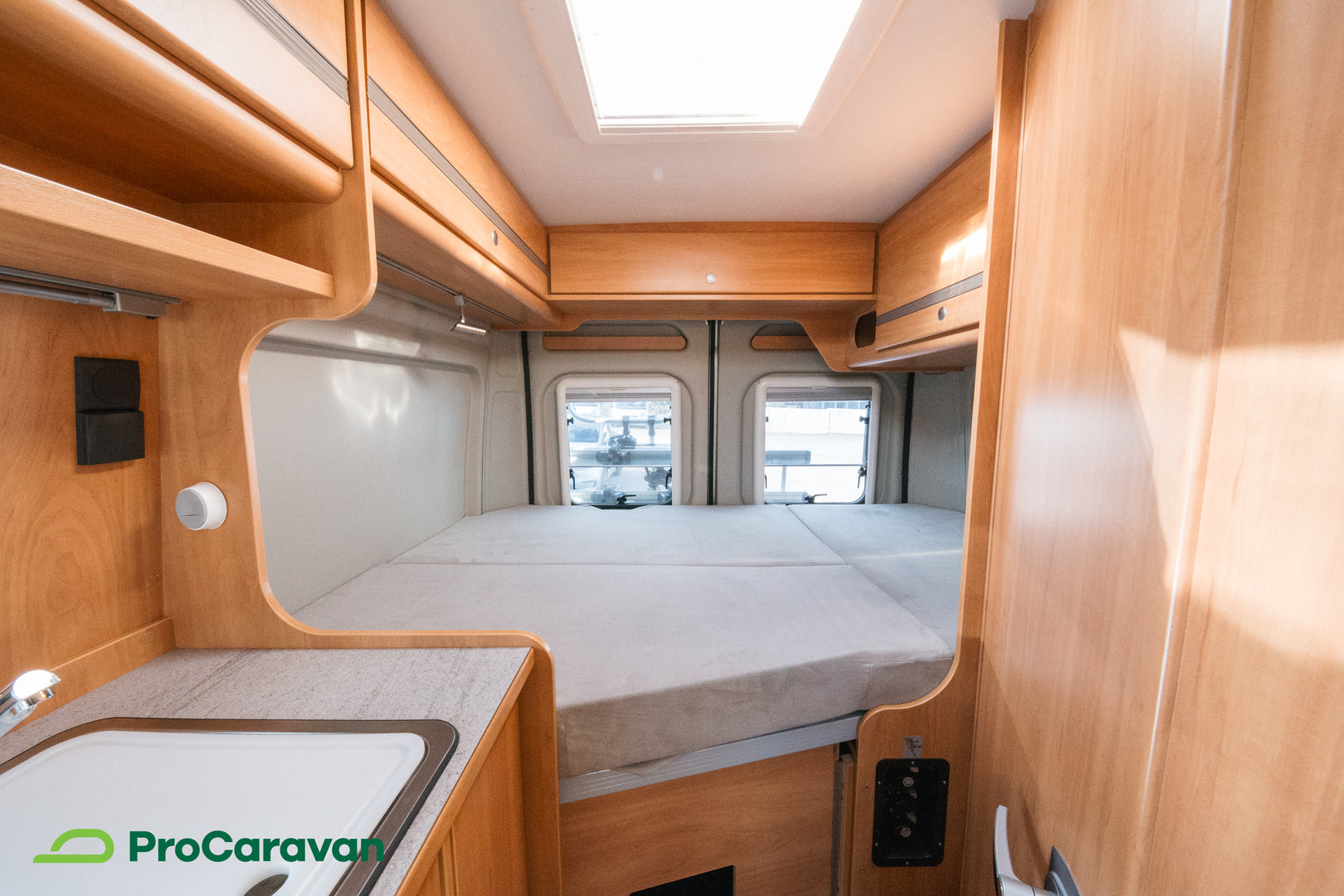Ajoneuvon sisätilat on suunniteltu kahden hengen tarpeisiin. Poikittain sijoitettu parivuode tarjoaa mukavan levon, ja pesutilasta löytyy suihku, pesuallas ja kasetti-WC. Keittiö on varustettu liedellä, jääkaapilla ja pakastelokerolla, jotka mahdollistavat ruoanlaiton missä tahansa pysähdytkin.