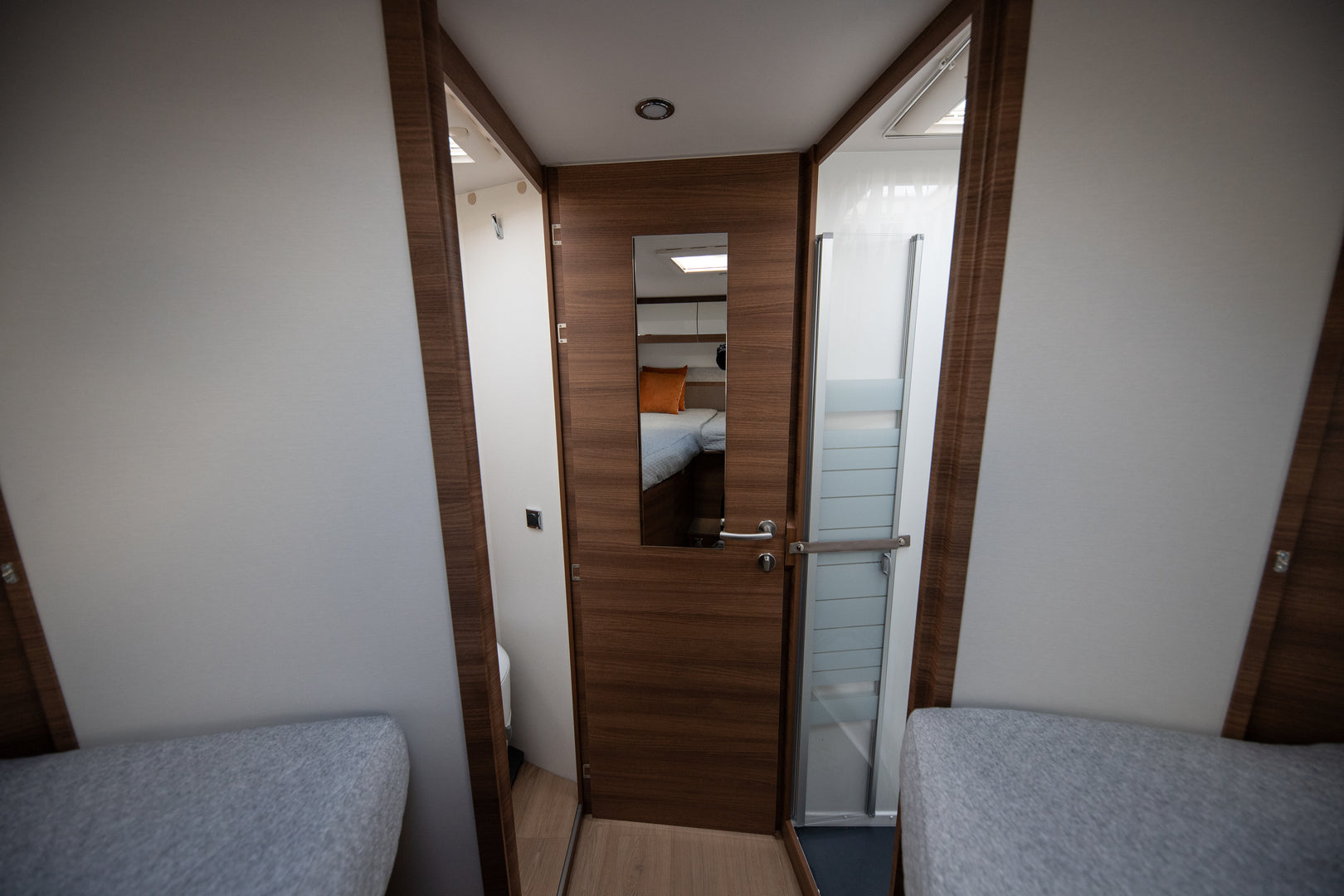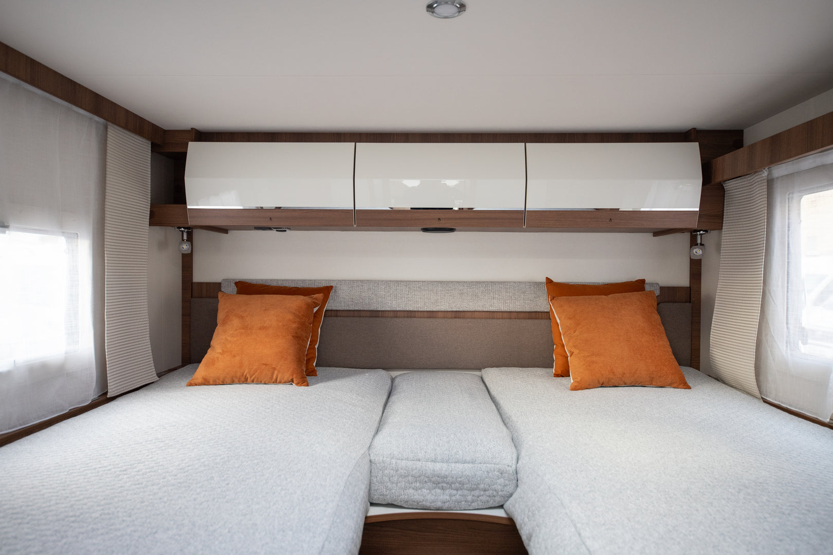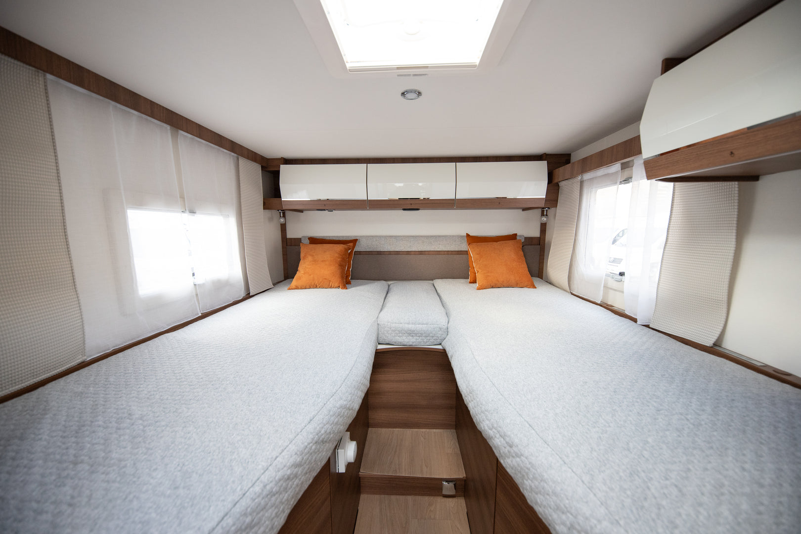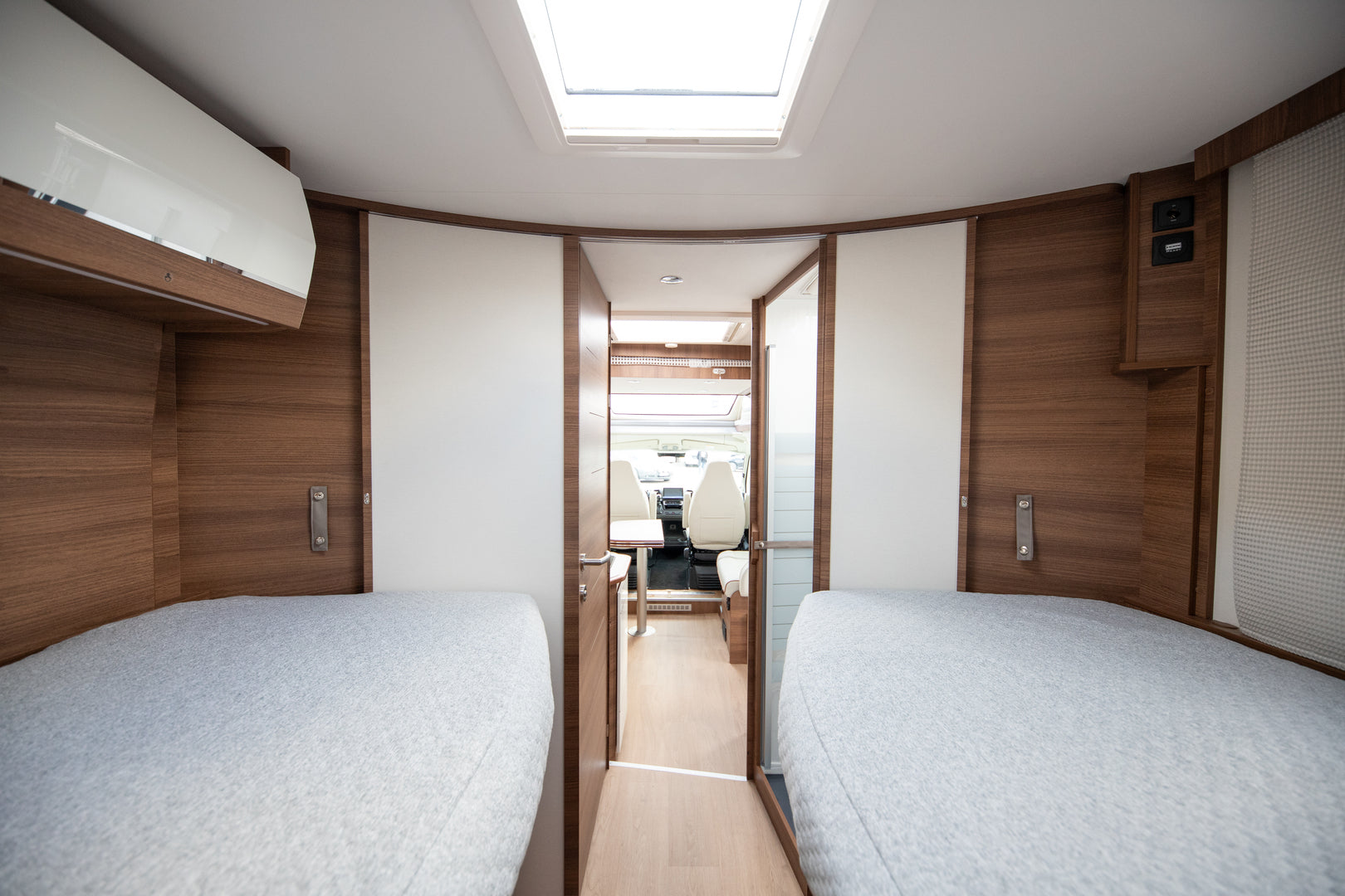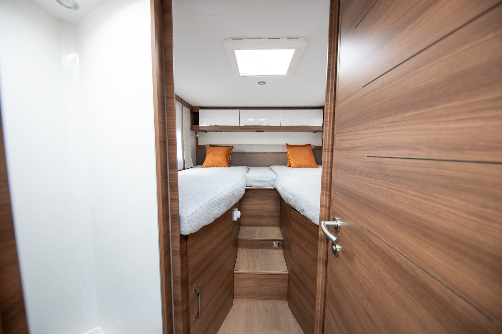 Makuuhuoneessa erillisvuoteet ja sähkötoiminen alaslaskettava ylävuode takaavat hyvät nukkumapaikat useammalle matkustajalle. BULTEX®-patjat ja tunnelmavalaistus tuovat levollisuutta ja mukavuutta, kun taas panoraamakattoikkuna avaa näkymät ja lisää valoisuutta.