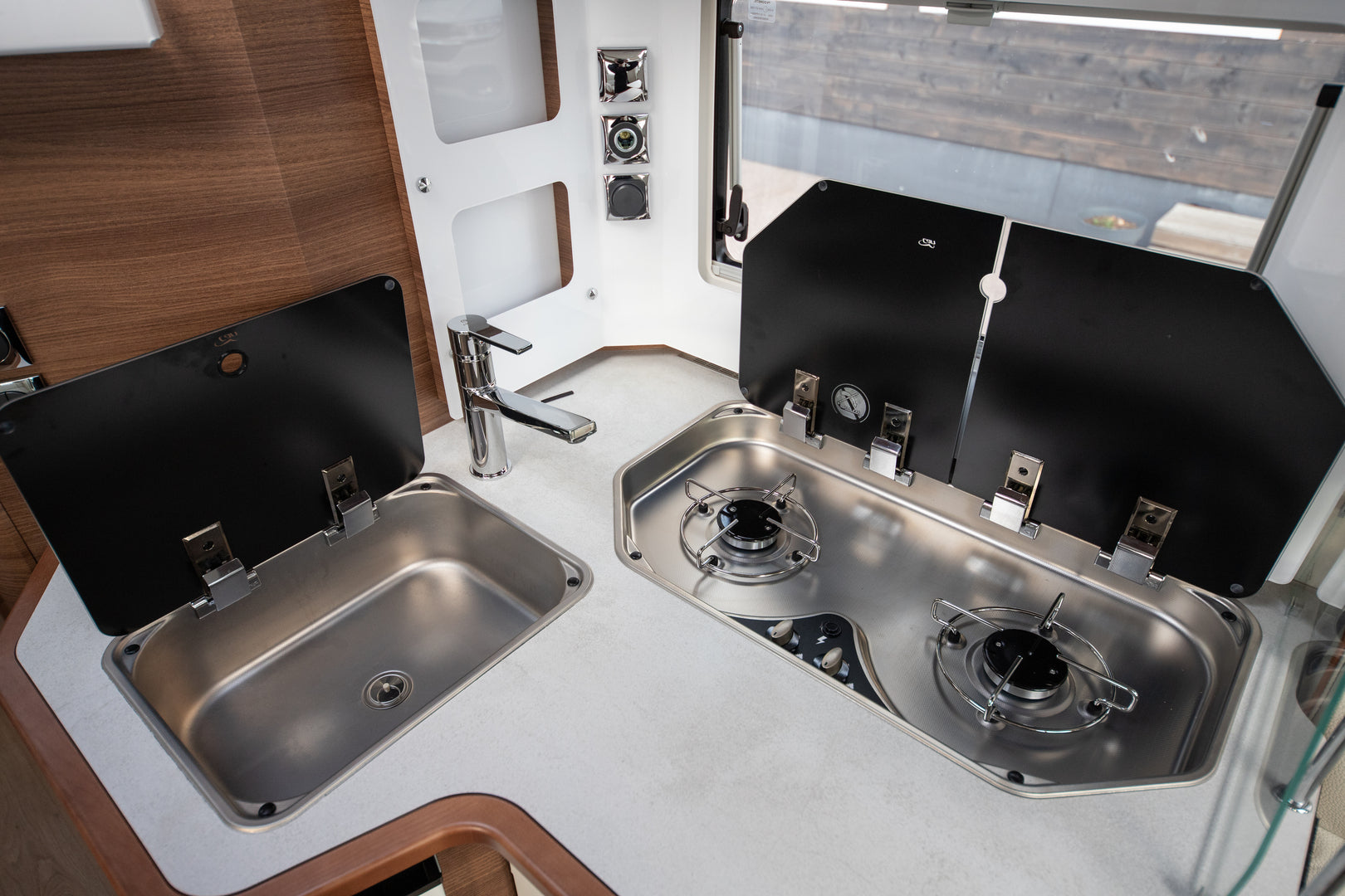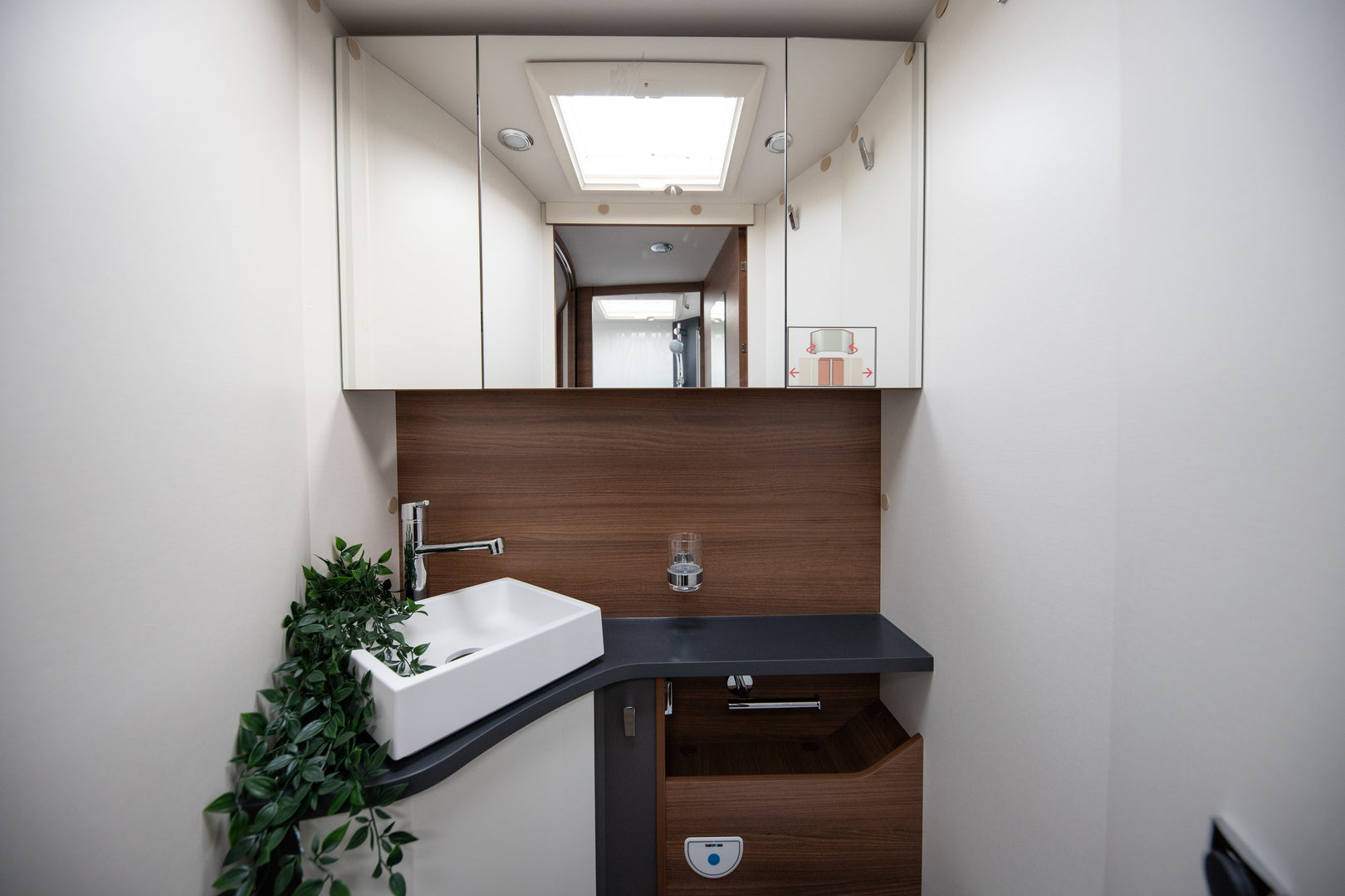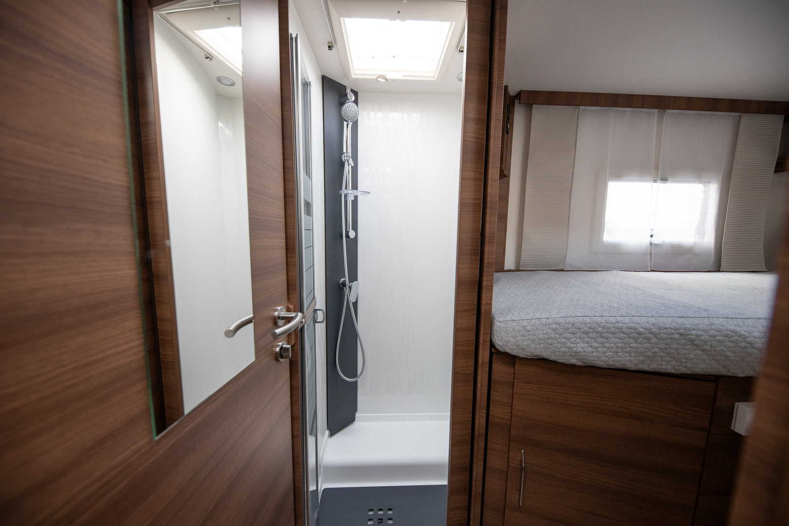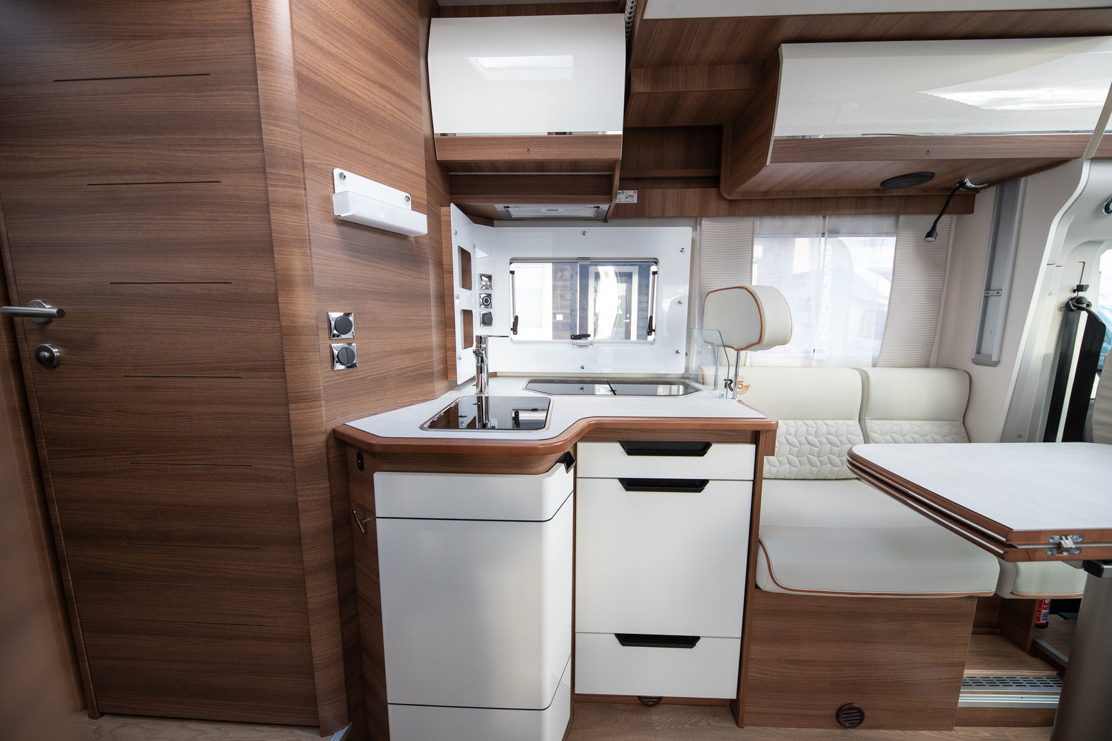 Keskelle sijoitettu XXL-kylpyhuone erillisellä suihkutilalla ja modernilla sisustuksella tekee matkailusta vaivatonta. Keittiö on varustettu L-mallisella ratkaisulla, ruostumattomasta teräksestä valmistetulla altaalla ja liesituulettimella, joten ruoanlaitto onnistuu helposti matkan päällä. Tilava pöytäryhmä toimii viihtyisänä oleskelutilana ja muuntuu tarvittaessa lisävuoteeksi.