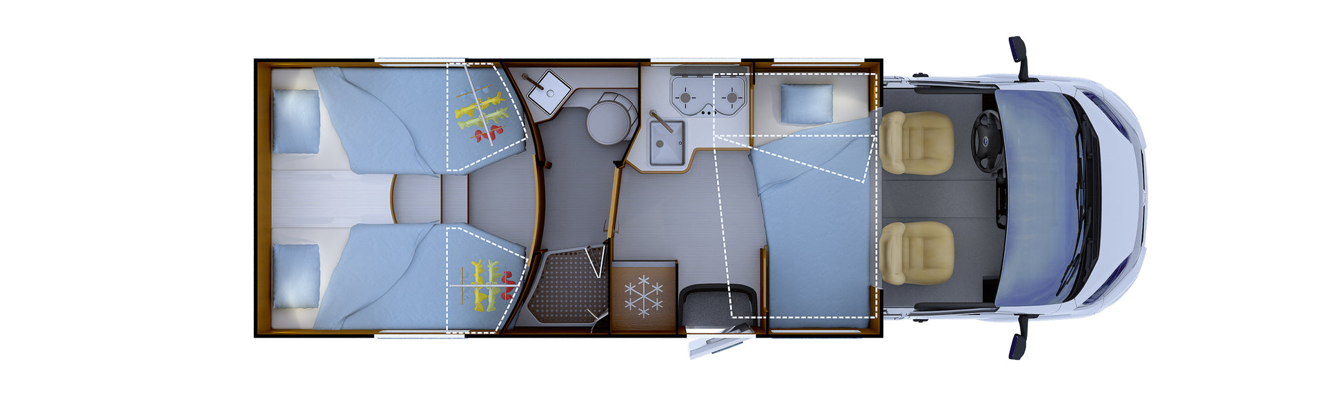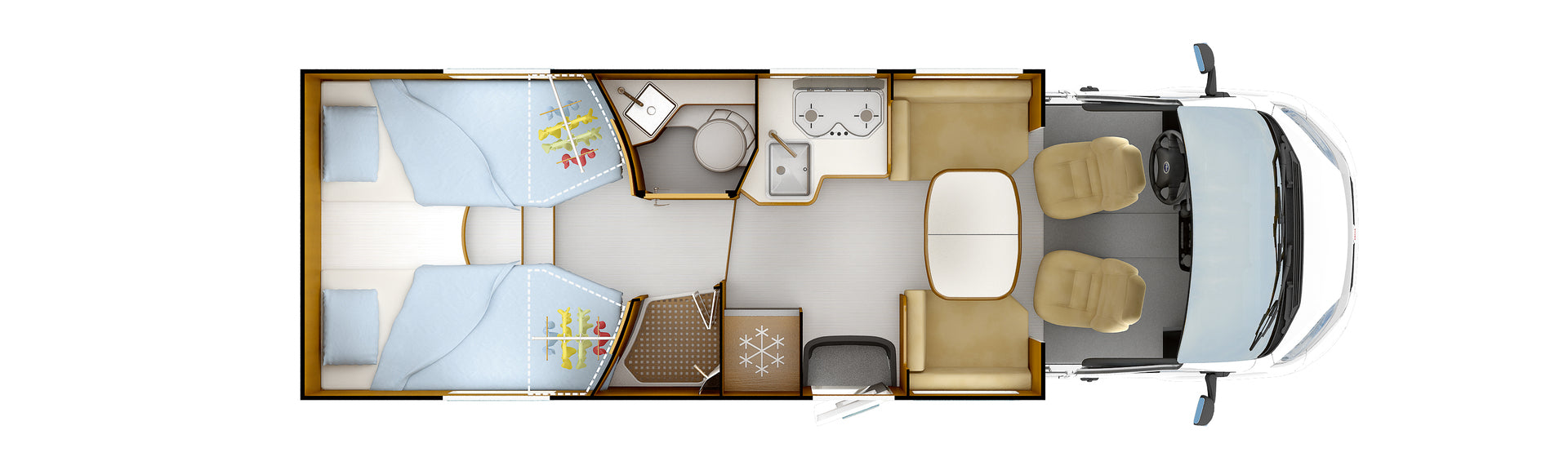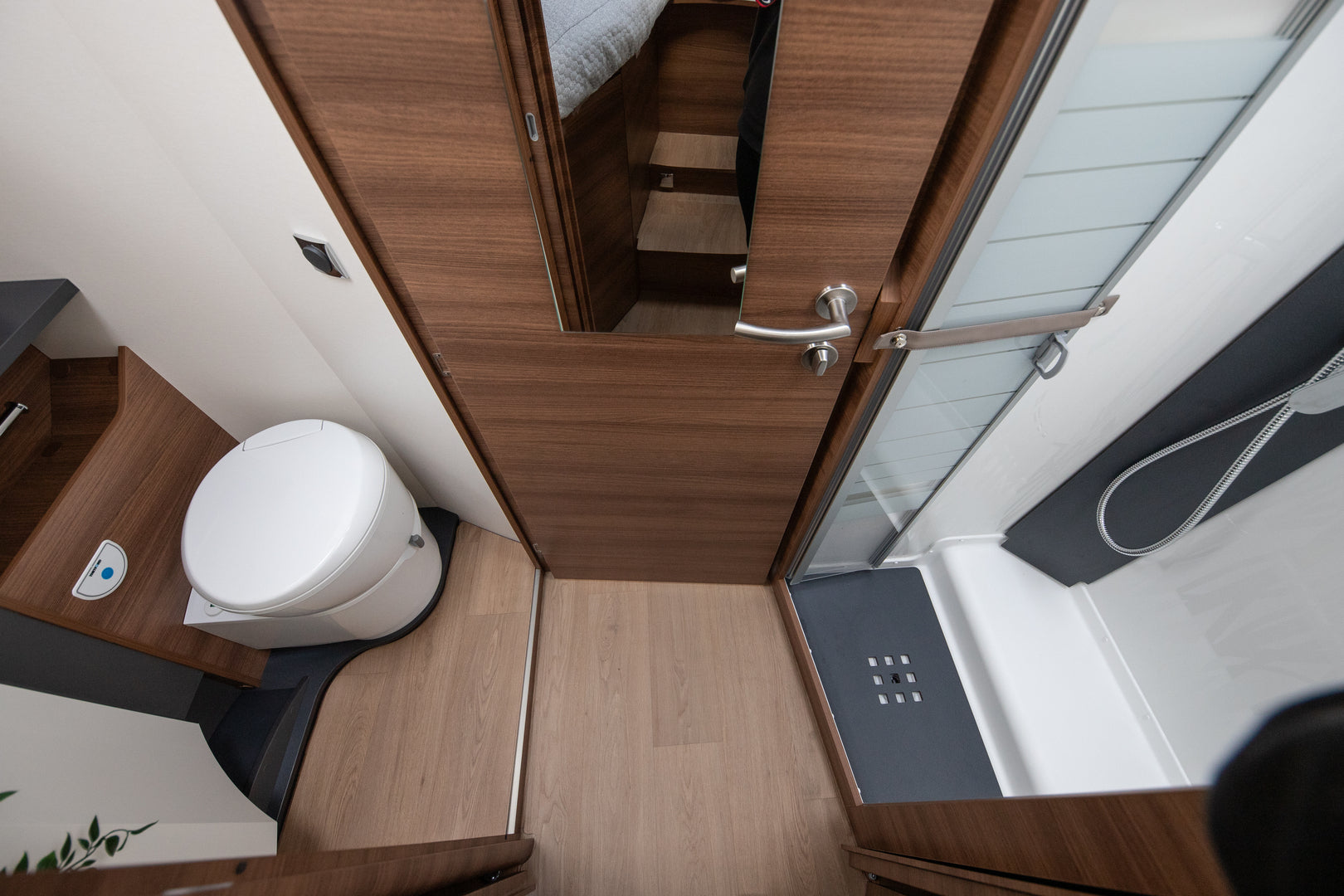 Keskelle sijoitettu XXL-kylpyhuone erillisellä suihkutilalla ja modernilla sisustuksella tekee matkailusta vaivatonta. Keittiö on varustettu L-mallisella ratkaisulla, ruostumattomasta teräksestä valmistetulla altaalla ja liesituulettimella, joten ruoanlaitto onnistuu helposti matkan päällä. Tilava pöytäryhmä toimii viihtyisänä oleskelutilana ja muuntuu tarvittaessa lisävuoteeksi.