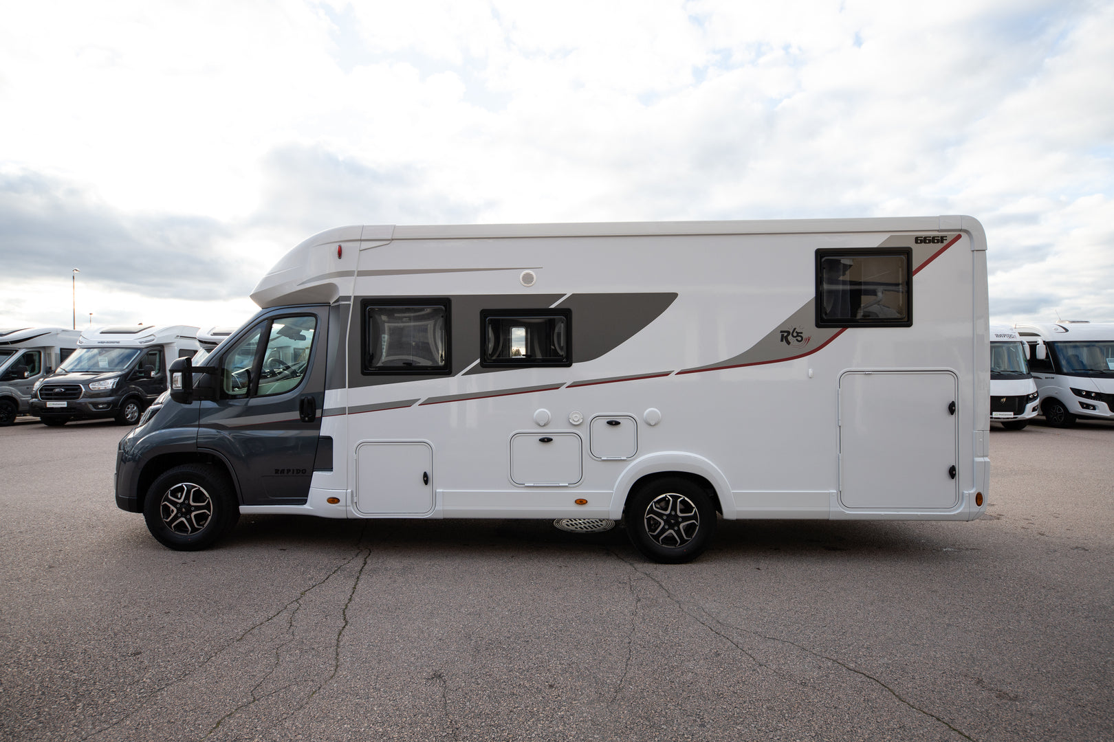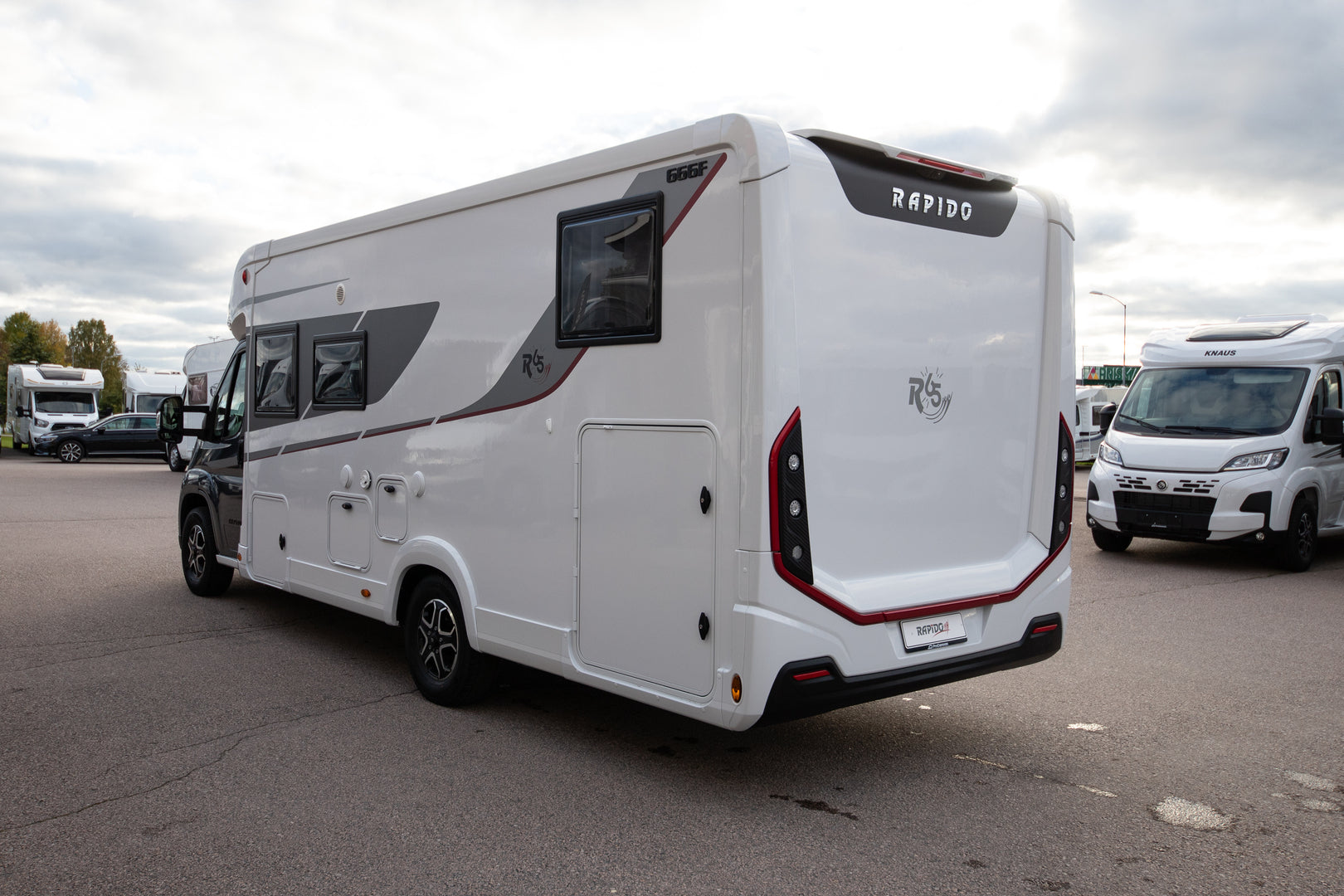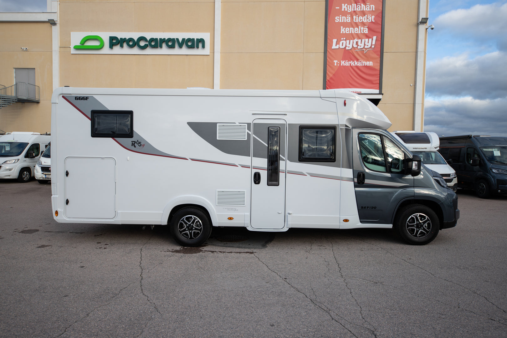 Rapido 666F ALDE 65 vuotta on erikoismalli, jossa yhdistyvät moderni tekniikka ja juhlavarustelun tuoma viimeistely. Nestekiertoinen ALDE Comfort Plus Arctic -lämmitys, sähköinen lattialämmitys ja lämmitetty harmaavesisäiliö takaavat ympärivuotisen käytettävyyden. 150 W aurinkopaneeli ja 100 Ah litiumakku mahdollistavat omavaraisuuden matkoilla, ja sähköinen seisontajarru tuo lisää helppoutta arkeen.