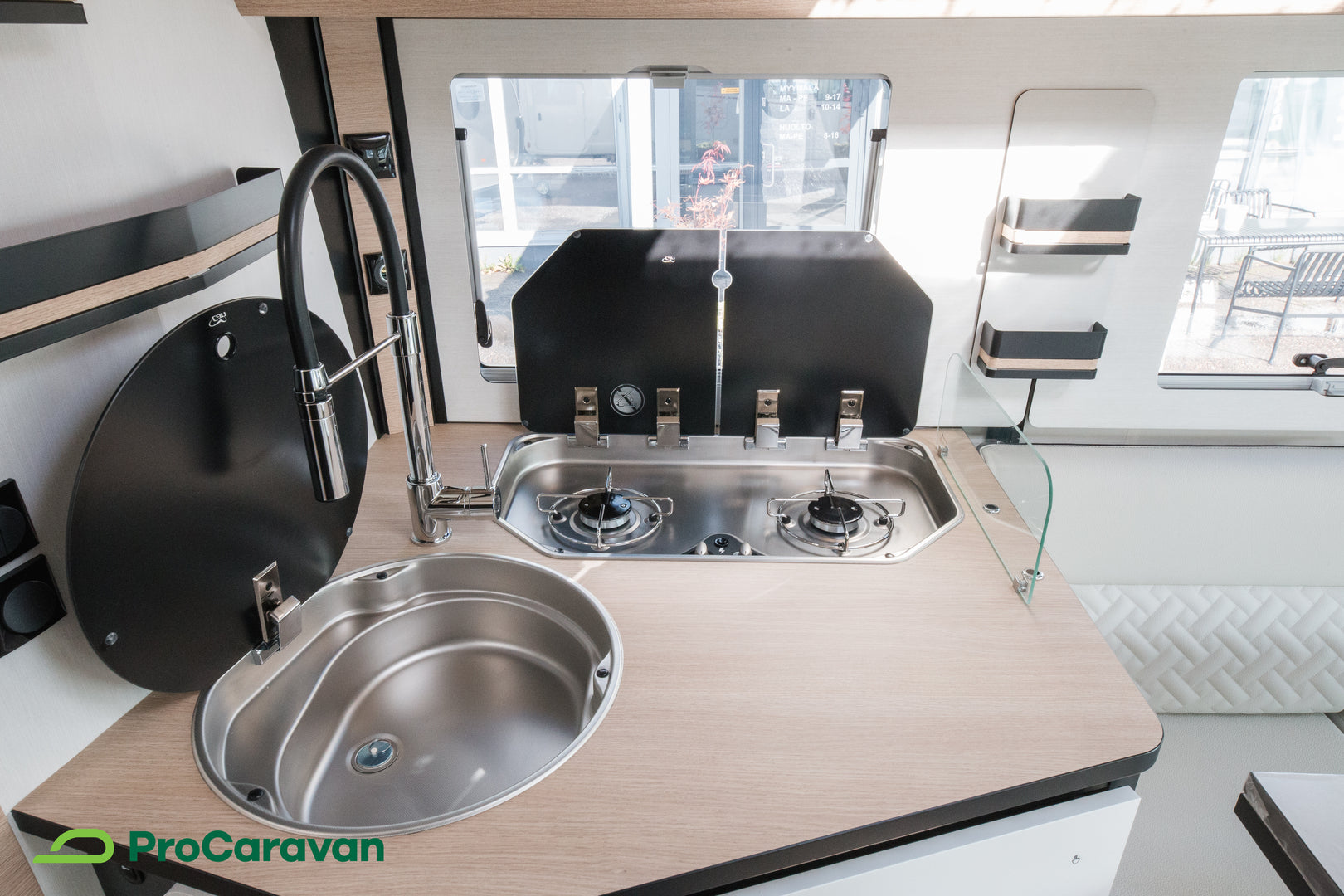 Keittiö on varustettu TEC-Tower -yhdistelmällä, jossa uuni ja jääkaappi yhdistyvät fiksuksi kokonaisuudeksi. Kromattu hana, mustakantinen ruostumaton allas sekä mausteteline viimeistelevät käytännöllisyyden. Yöpymiseen on tarjolla saarekevuode sekä manuaalisesti alaslaskettava vuode ohjaamon yläpuolella. BULTEX®-patjat ja sälepohjat varmistavat levolliset unet.