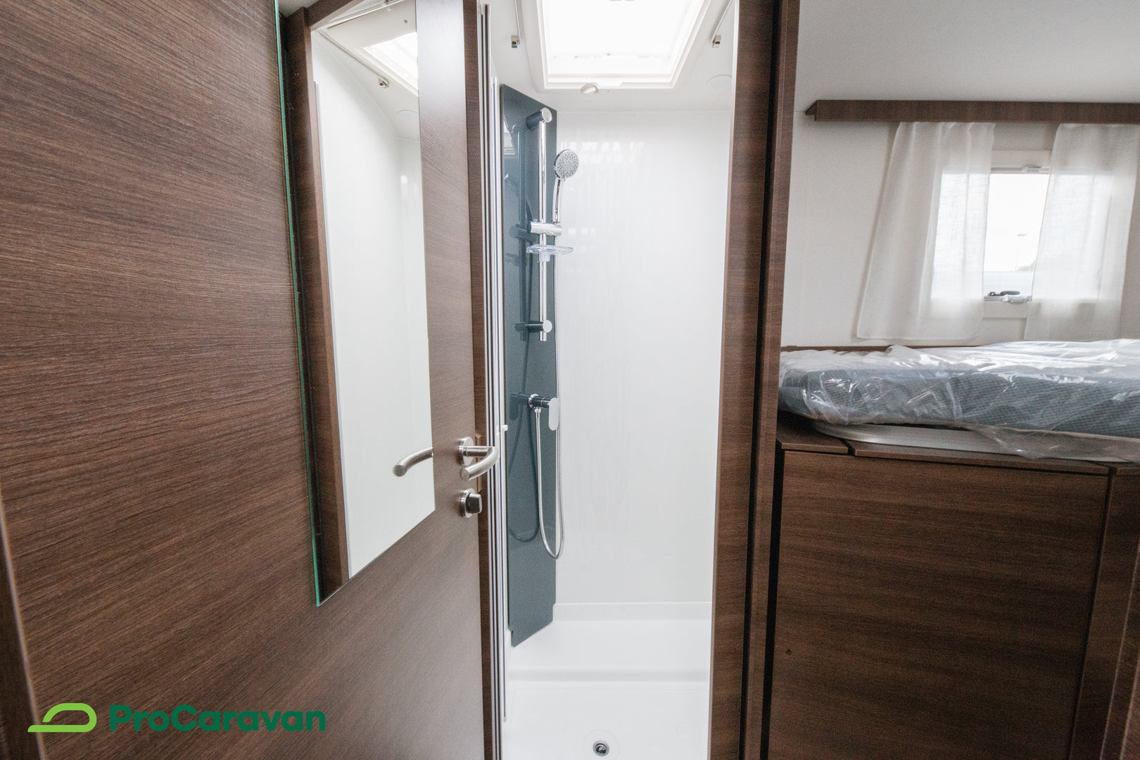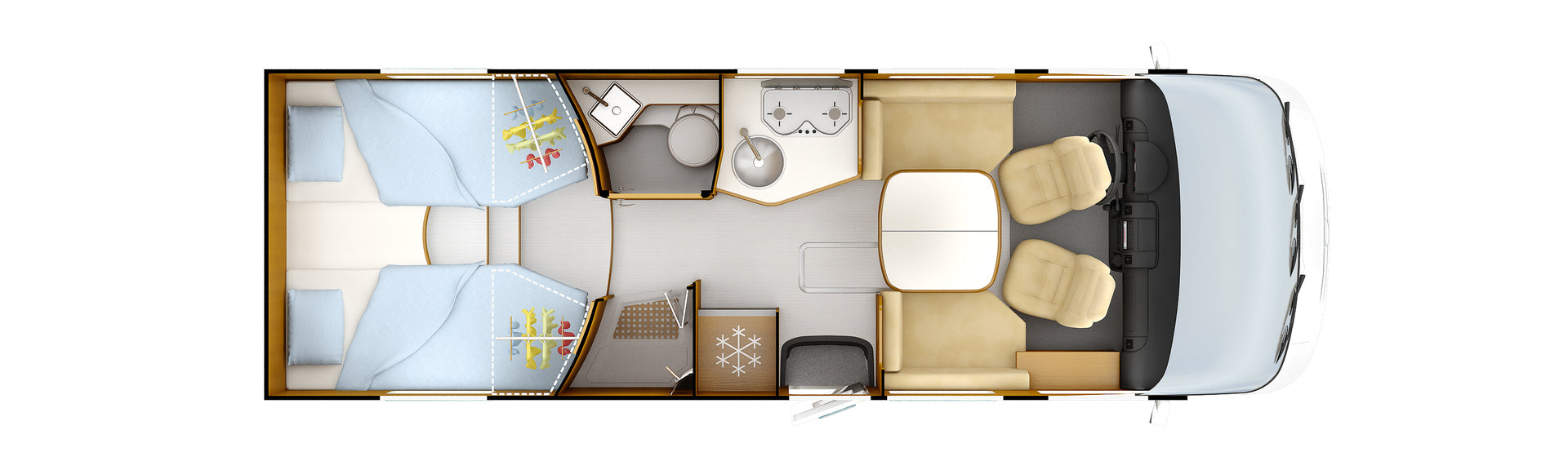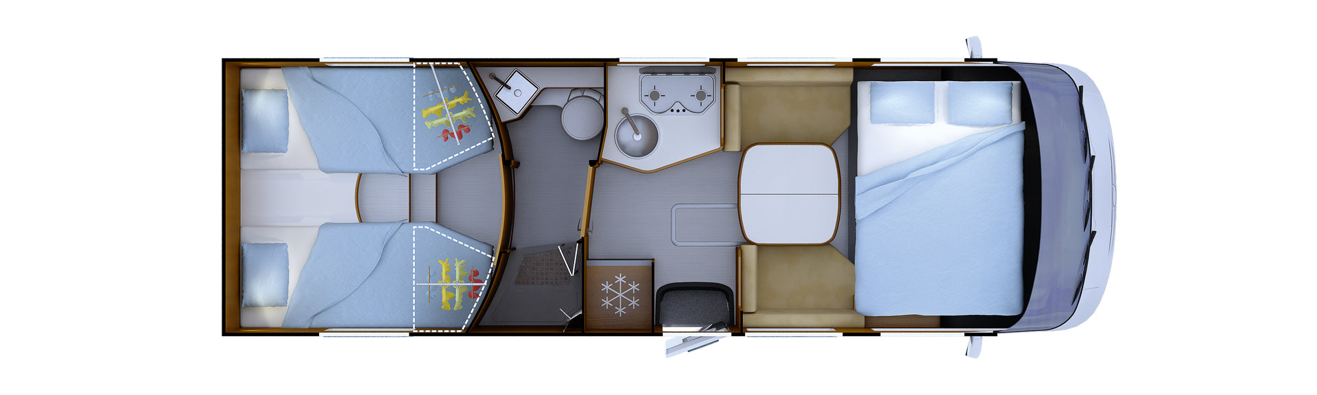Keskelle sijoitettu kylpyhuone erillisellä suihkutilalla mahdollistaa käytännöllisen ja rauhallisen arjen myös tien päällä. Käytännön ratkaisut, kuten nostettava vuoteen jalka säilytystilan hyödyntämiseksi sekä LED-taustavalaistut tarvikelokerot, ovat osa tämän matkailuauton arkea helpottavaa suunnittelua.