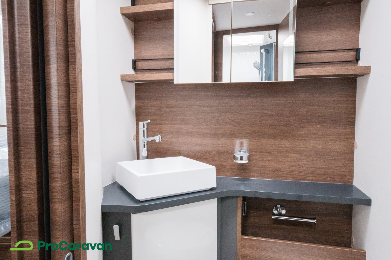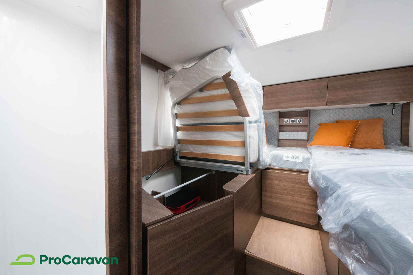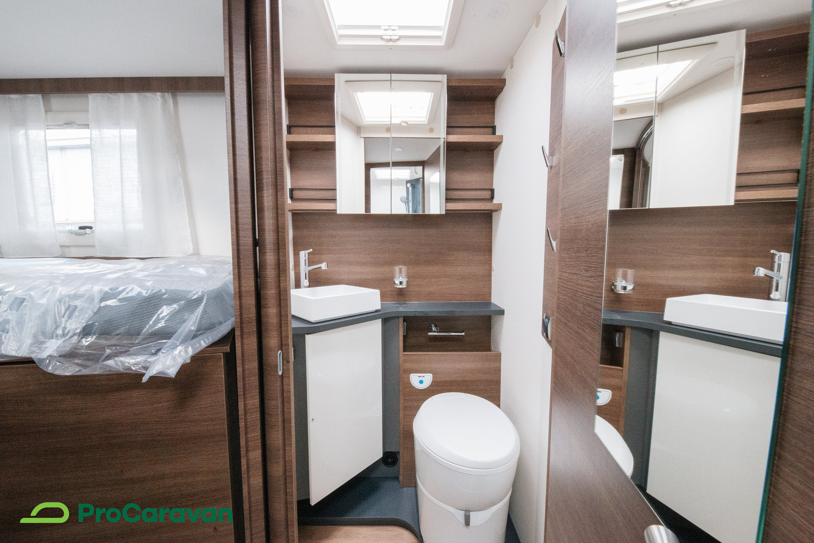 Keskelle sijoitettu kylpyhuone erillisellä suihkutilalla mahdollistaa käytännöllisen ja rauhallisen arjen myös tien päällä. Käytännön ratkaisut, kuten nostettava vuoteen jalka säilytystilan hyödyntämiseksi sekä LED-taustavalaistut tarvikelokerot, ovat osa tämän matkailuauton arkea helpottavaa suunnittelua.