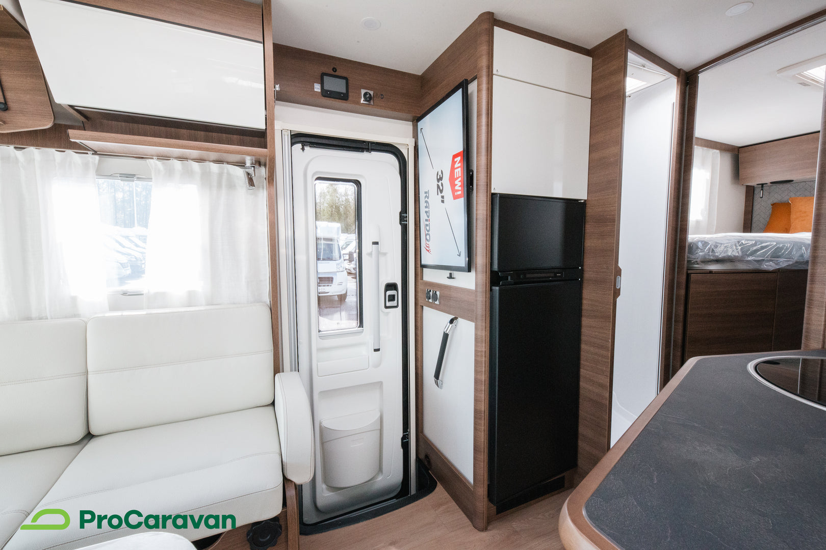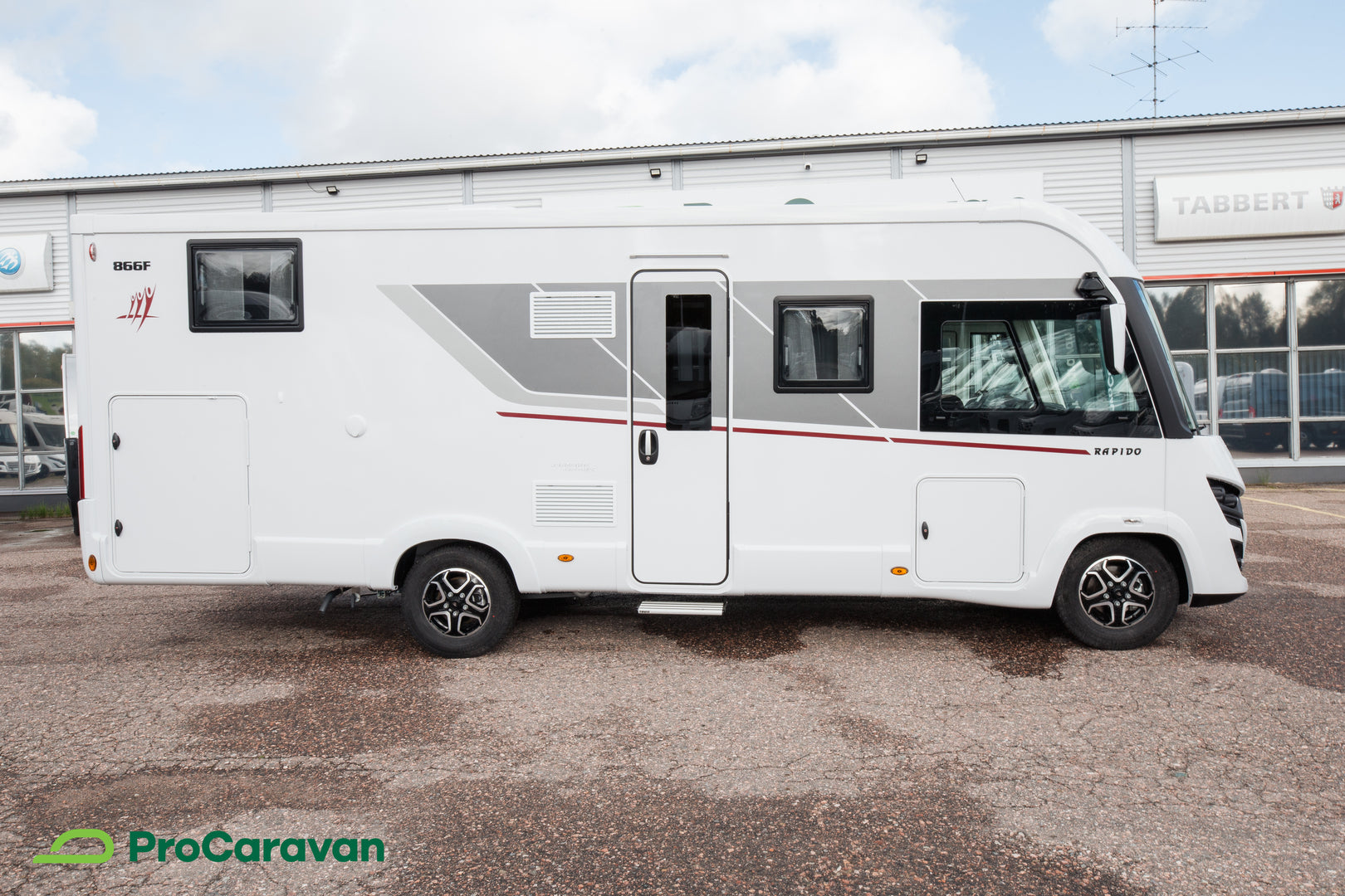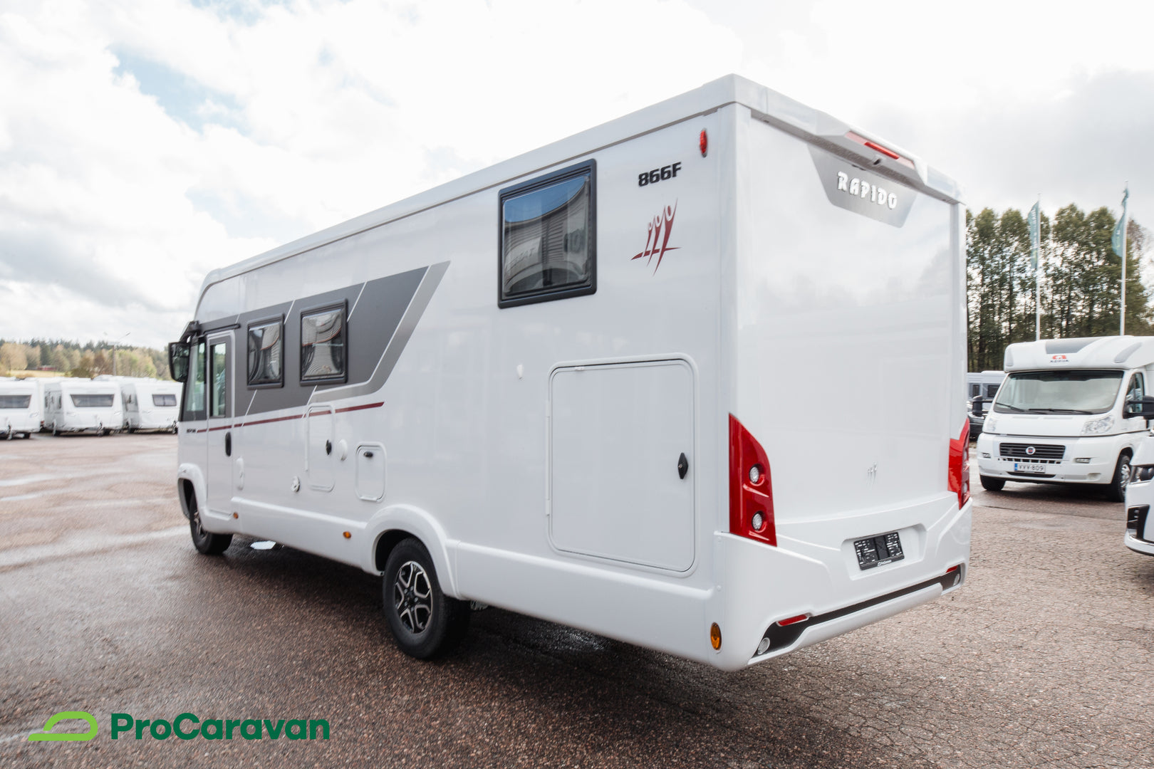 Rapido 866F on varusteltu yksityiskohtiin saakka. Hyttysverkko-ovi, TV-teline kahdella katselupaikalla sekä aurinkopaneelin esijohdotus ovat osa kokonaisuutta, joka tukee itsenäistä ja miellyttävää matkailua. Takatalli on valaistu ja siihen pääsee molemmilta puolilta, joten tavaroiden säilytys ja käyttö on sujuvaa.