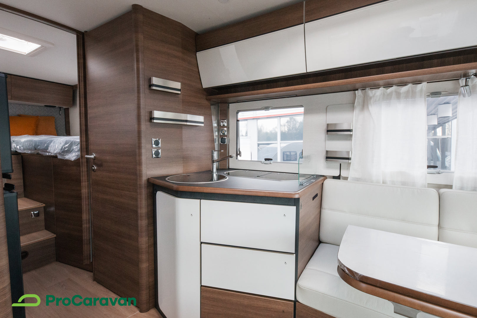 Asuinosassa yhdistyvät laadukkaat materiaalit ja toimiva suunnittelu. Kiinteät erillisvuoteet sekä alaslaskettava ylävuode tarjoavat mukavat nukkumapaikat jopa neljälle. Keittiöstä löytyy jääkaappi, pakastelokero, uuni sekä keraaminen hana, ja ruostumaton teräsallas viimeistelee toimivuuden. Tilava pöytäryhmä kutsuu rentoutumaan – tunnelmavalaistuksen ja PALATINA-kalusteiden ansiosta oleskelu on miellyttävää hetki toisensa jälkeen.