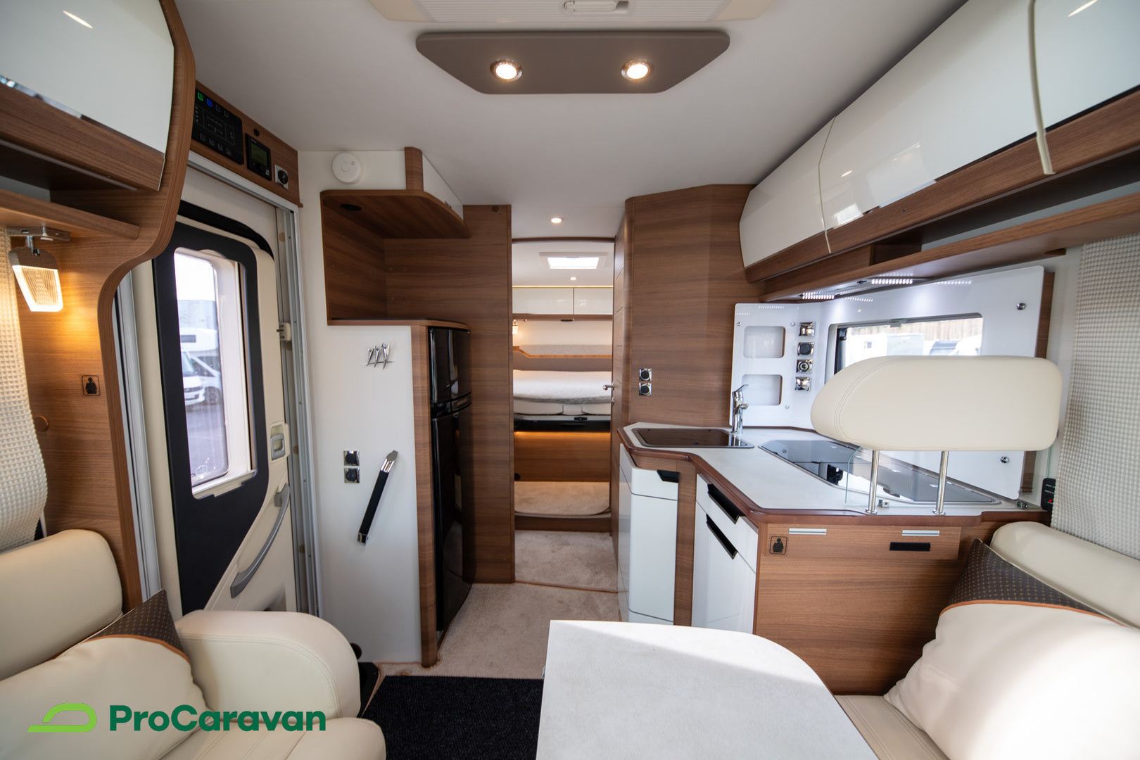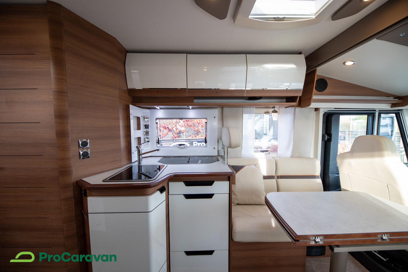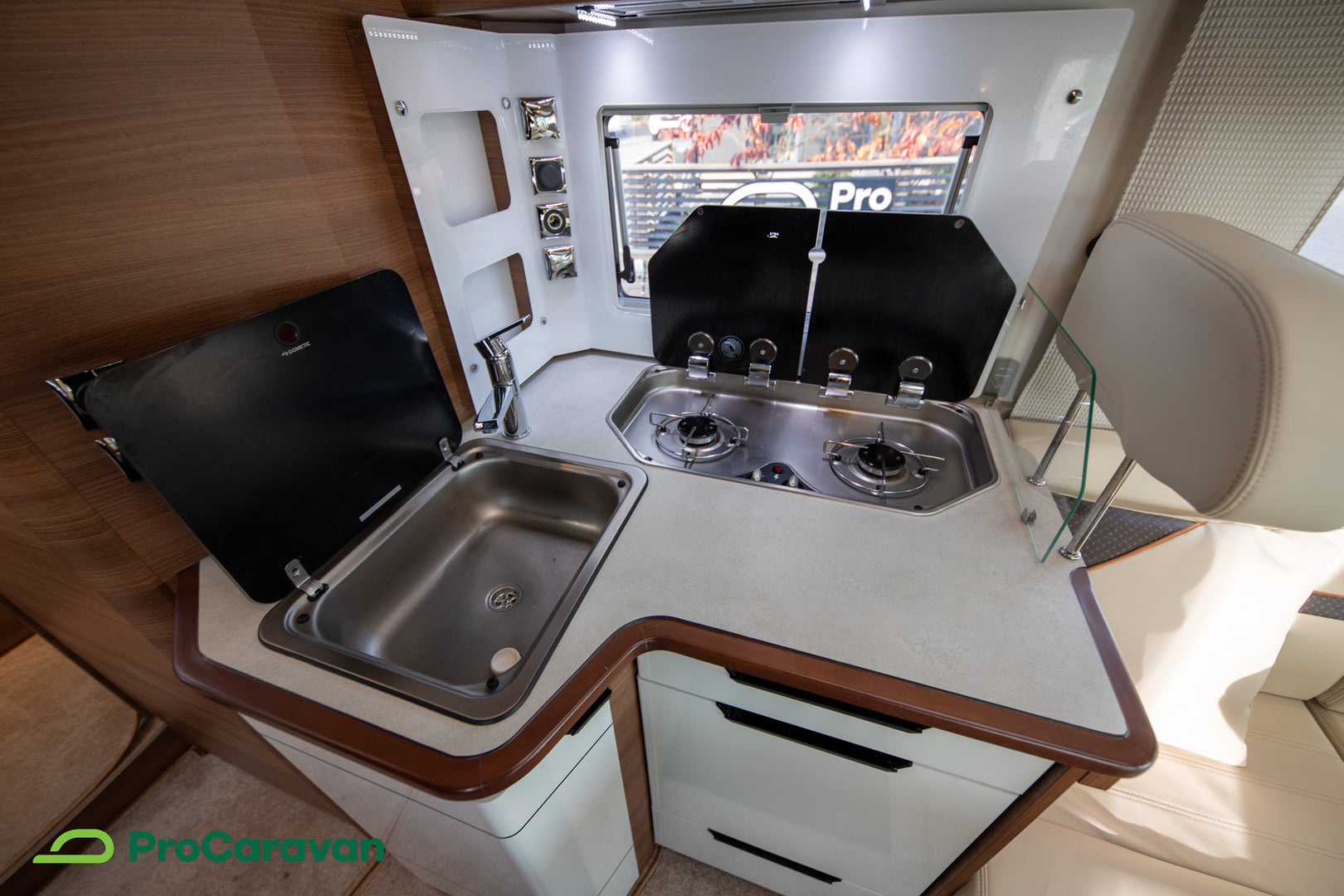 Liesi, liesituuletin ja iso jääkaappi pakastelokerolla tekevät ruoanlaitosta vaivatonta. Aurinkopaneeli, kaksi asuinosan akkua ja invertteri lisäävät omavaraisuutta, ja lämmitetty harmaavesisäiliö sekä lämminvesivaraaja takaavat mukavuuden myös vaativammissa oloissa. Kaasun ulosotto ja DuoControl helpottavat kaasunhallintaa käytännössä.