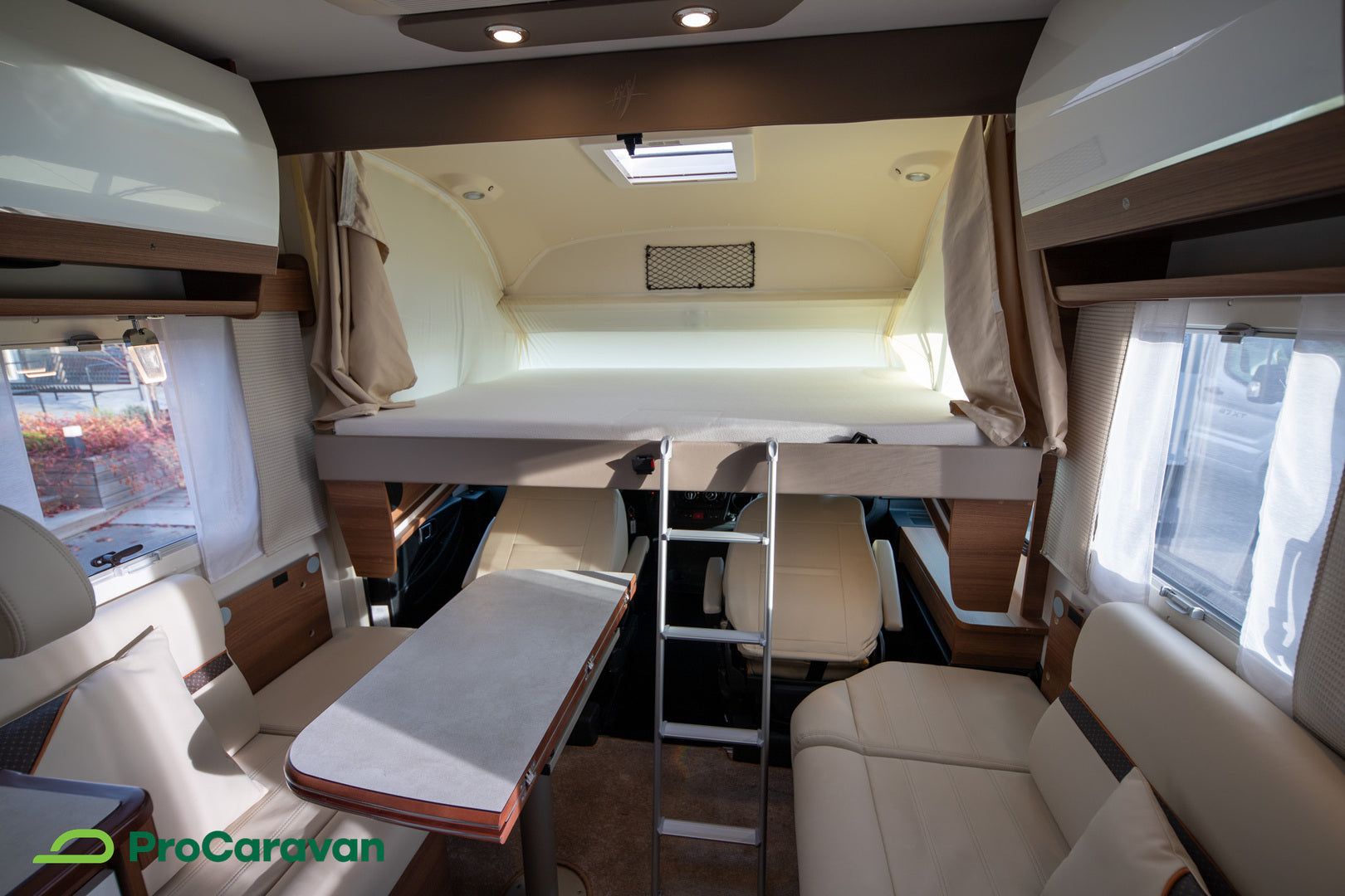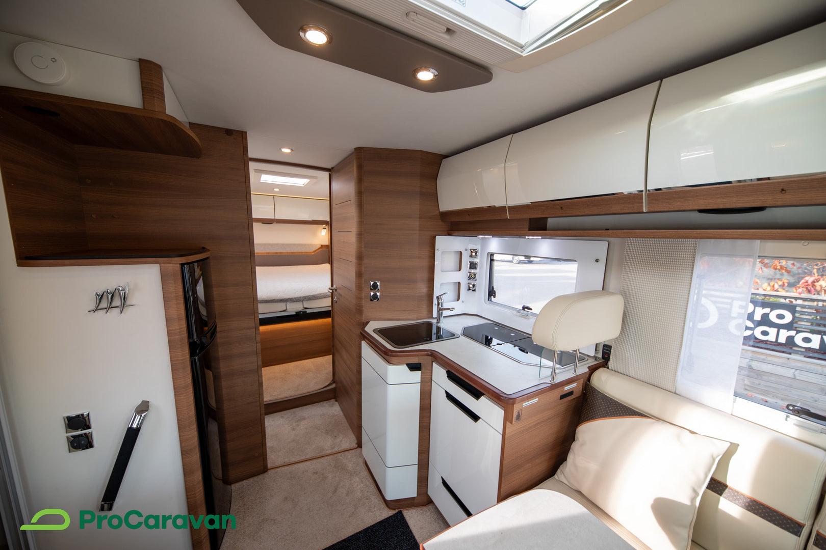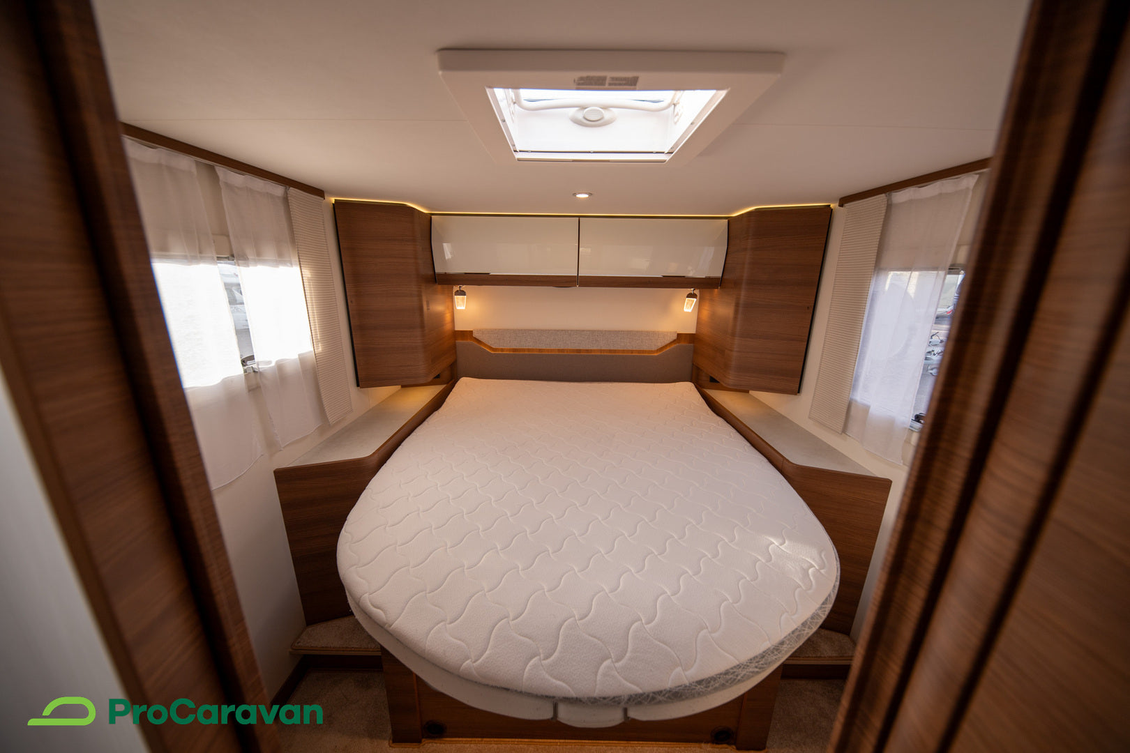 Tilava pöytäryhmä tarjoaa viihtyisän paikan yhdessäoloon, ja manuaalisesti alaslaskettava ylävuode sekä takana sijaitseva saarekevuode mahdollistavat mukavat yöpymisratkaisut. Erillinen suihkutila ja kasetti-WC tuovat lisää yksityisyyttä ja toimivuutta matkalla. Lattialämmitys, Truma-ilmakeskuslämmitys sekä sähköpatruuna pitävät olosuhteet tasaisen miellyttävinä vuoden ympäri.