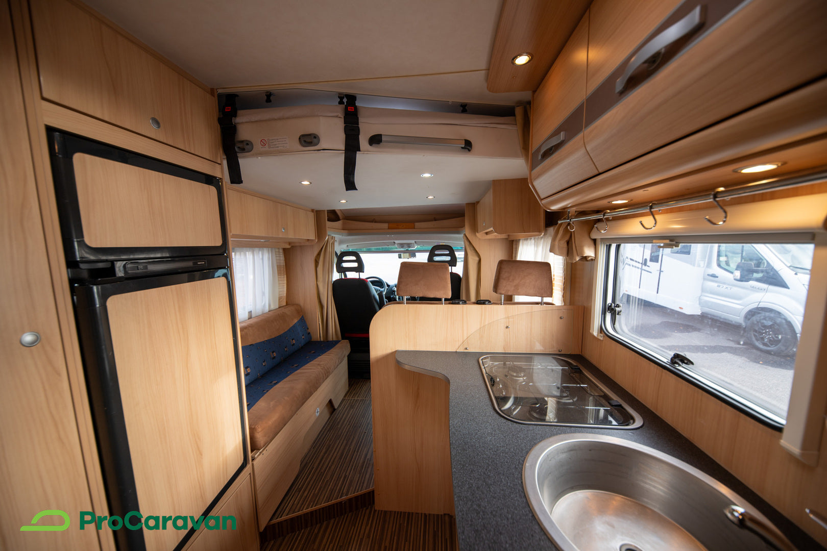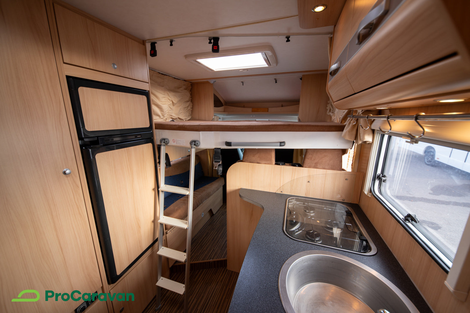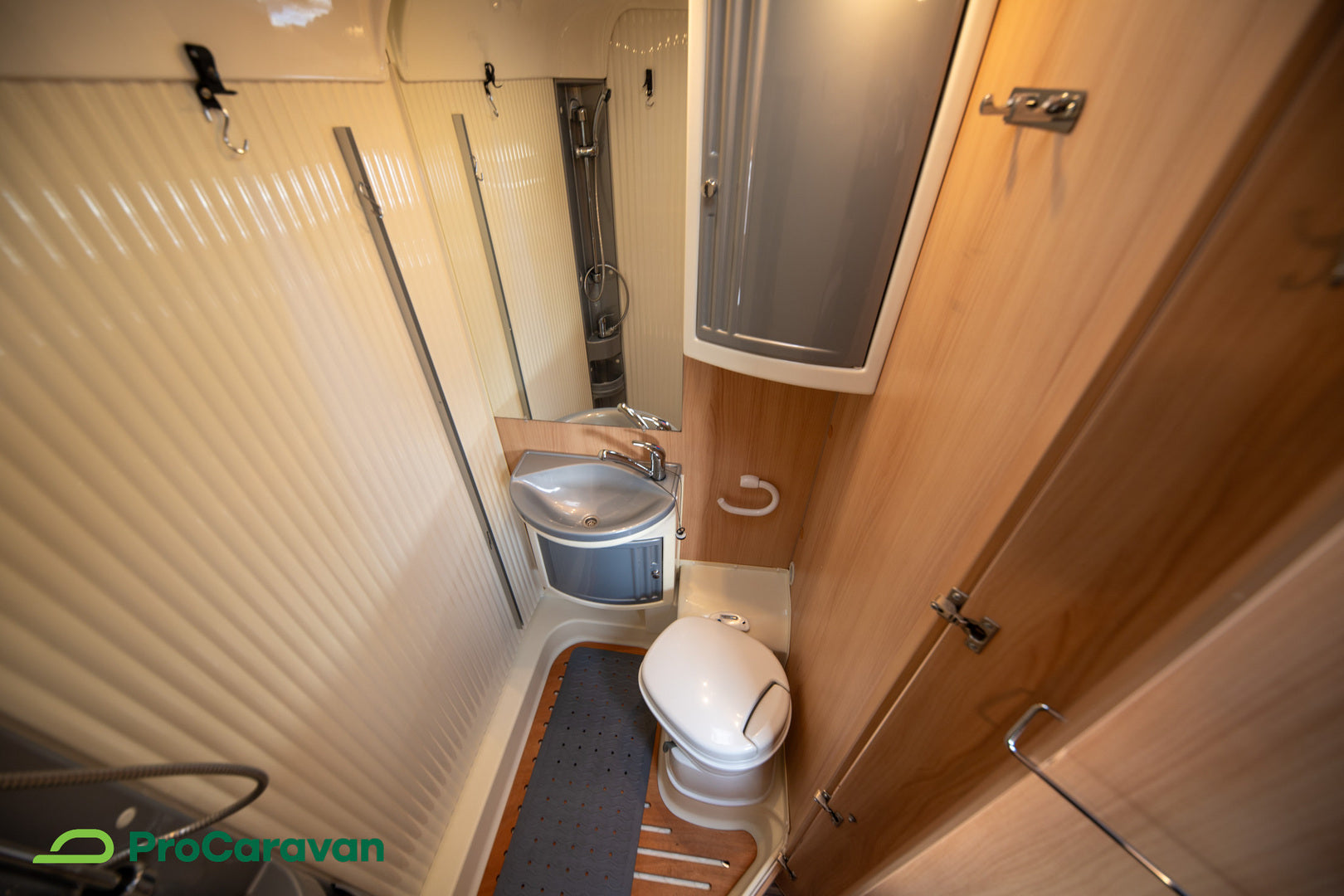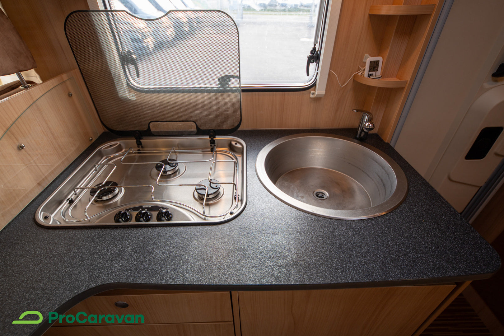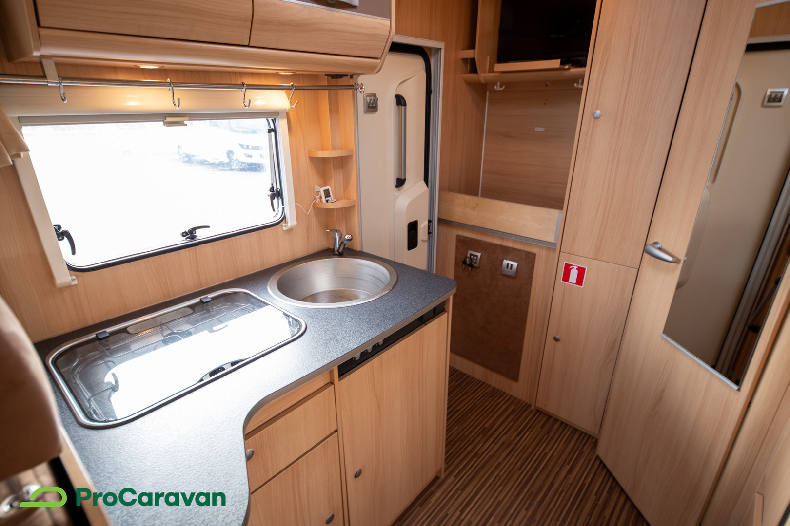 Keittiössä on liesi, pakastelokerollinen iso jääkaappi sekä riittävästi työskentelytilaa. Kylpyhuoneesta löytyy kasetti-WC, pesuallas ja suihku, mikä tekee matkustamisesta itsenäistä ja huoletonta. Hyttysverkko-ovi ja kattoluukku parantavat ilmanvaihtoa ja tuovat raikkaan tunnelman sisälle.