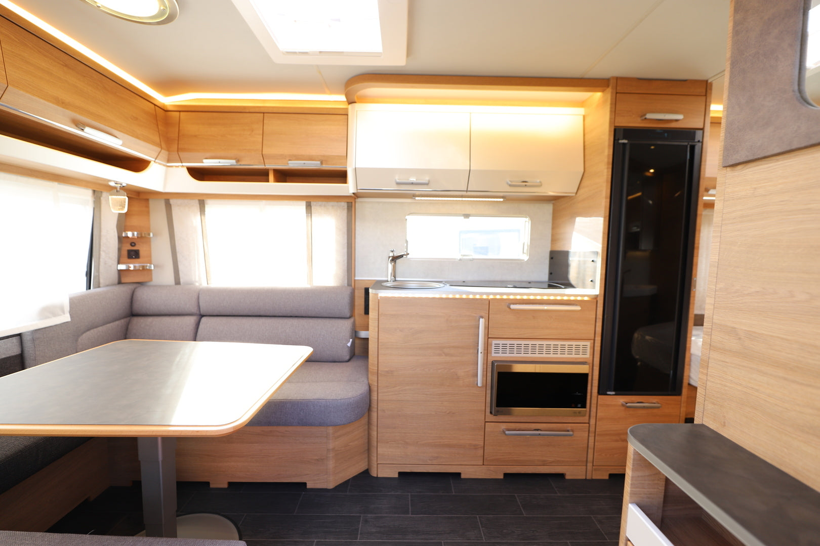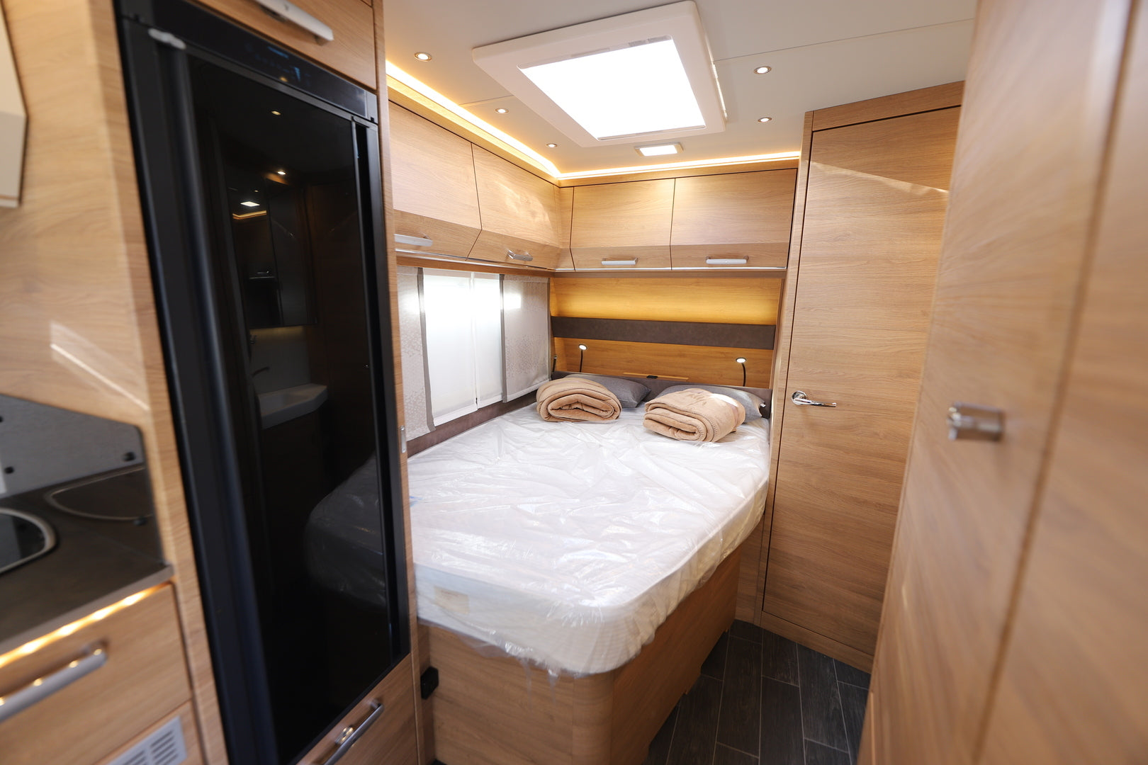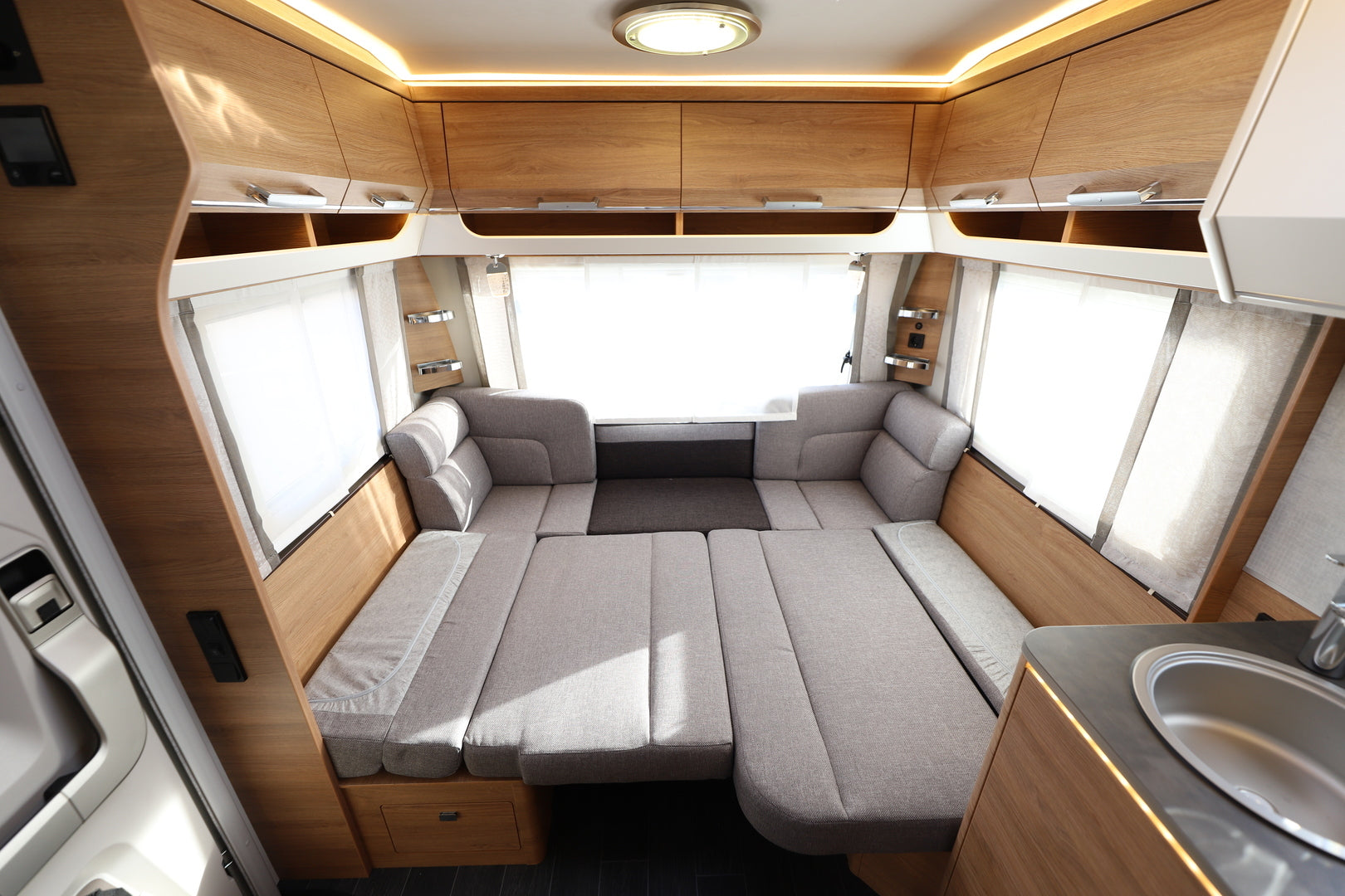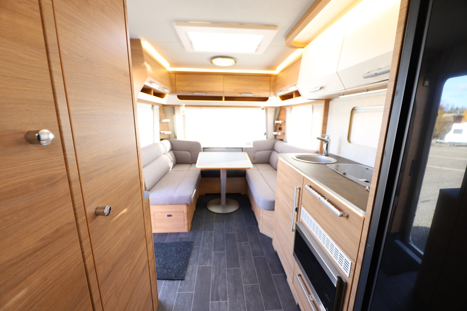 Vaunun takaosassa sijaitseva parivuode (198 x 164/140 cm) tarjoaa runsaasti nukkumatilaa, ja istuinryhmästä muunneltava lisävuode laajentaa kapasiteetin jopa neljälle. Tilojen jakaminen onnistuu tyylikkäällä tekstiiliverholla, ja säilytystilaa löytyy runsaasti kaapeista ja lattiatasolta. Tunnelmallinen LED-valaistus luo miellyttävän ilmapiirin iltoihin, ja verhoiltu ACTIVE SOFT CARBON -sisustus viimeistelee viihtyvyyden.