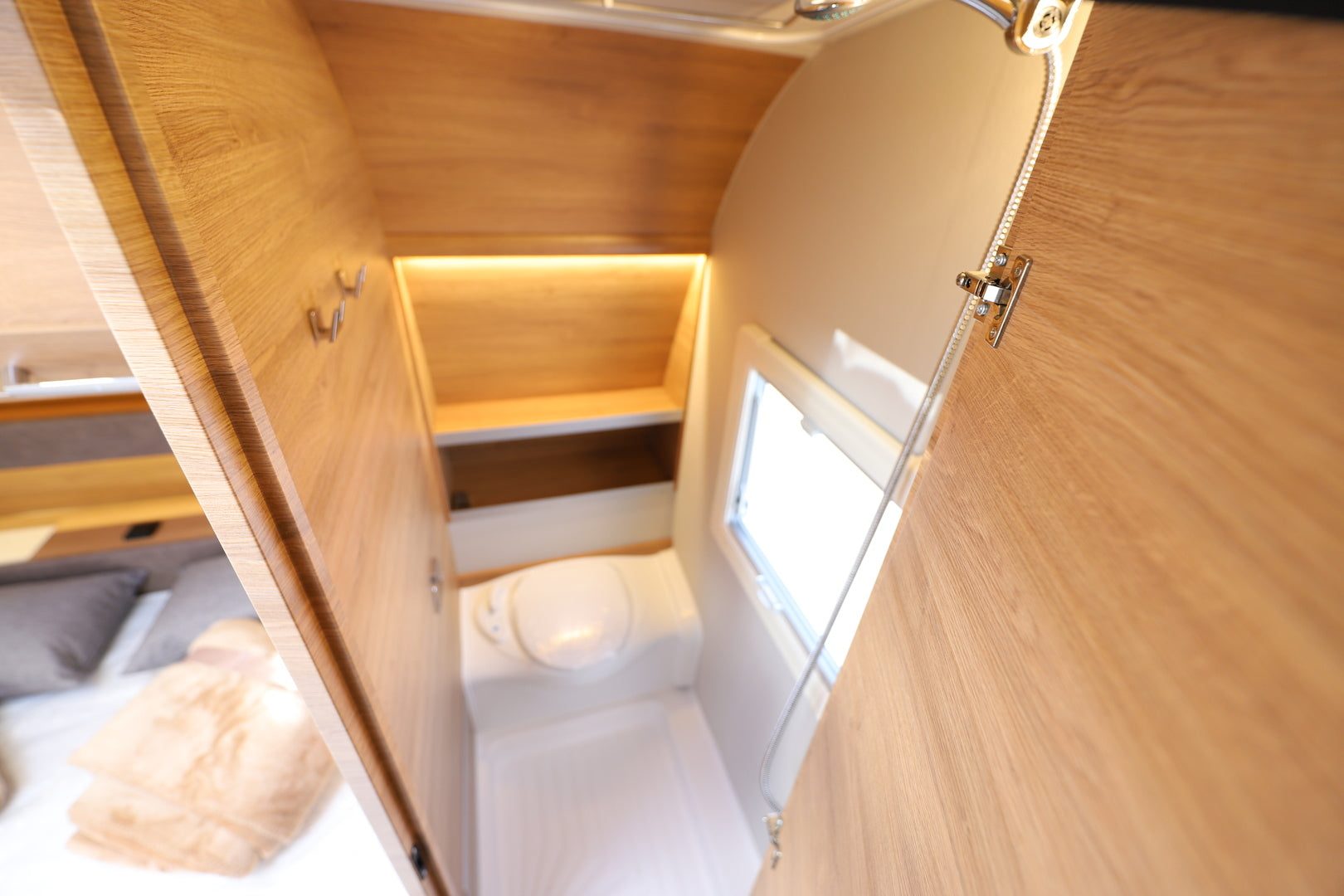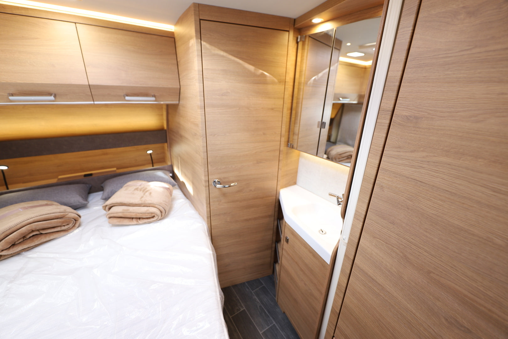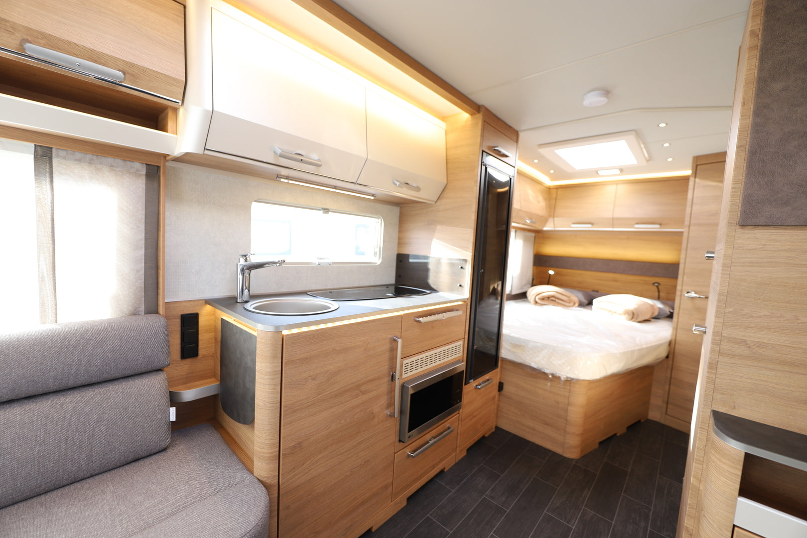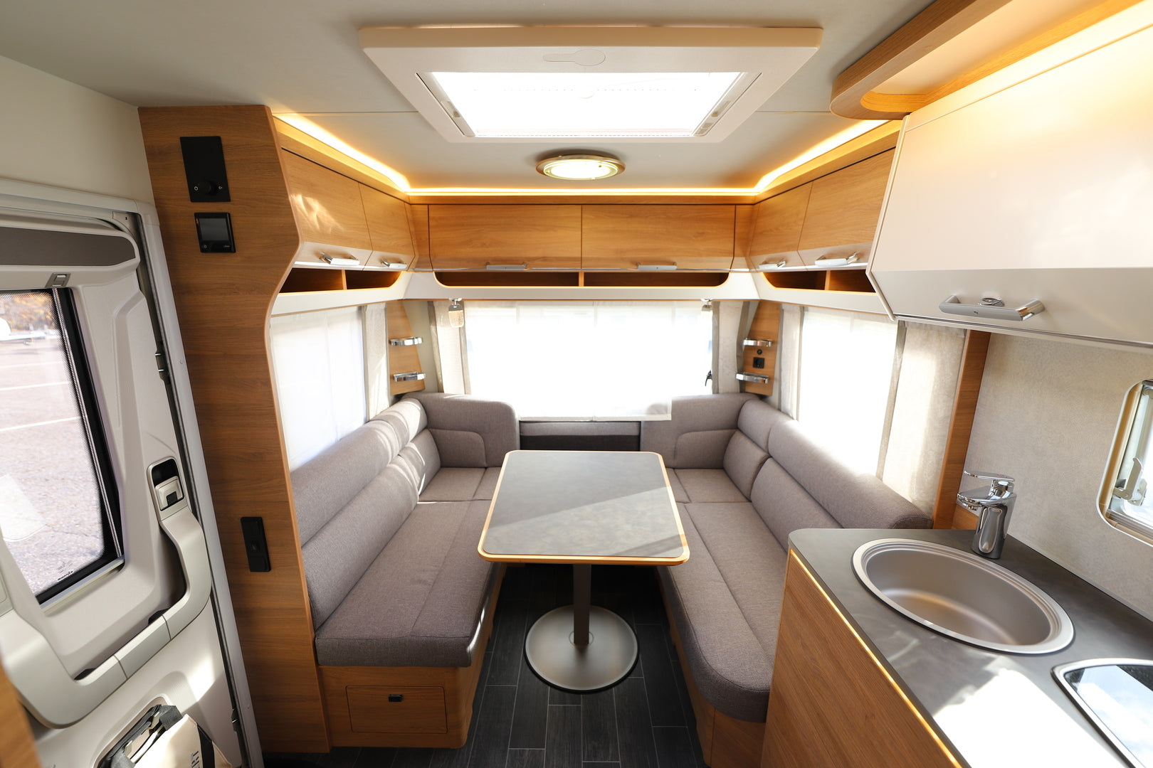 Vaunun takaosassa sijaitseva parivuode (198 x 164/140 cm) tarjoaa runsaasti nukkumatilaa, ja istuinryhmästä muunneltava lisävuode laajentaa kapasiteetin jopa neljälle. Tilojen jakaminen onnistuu tyylikkäällä tekstiiliverholla, ja säilytystilaa löytyy runsaasti kaapeista ja lattiatasolta. Tunnelmallinen LED-valaistus luo miellyttävän ilmapiirin iltoihin, ja verhoiltu ACTIVE SOFT CARBON -sisustus viimeistelee viihtyvyyden.