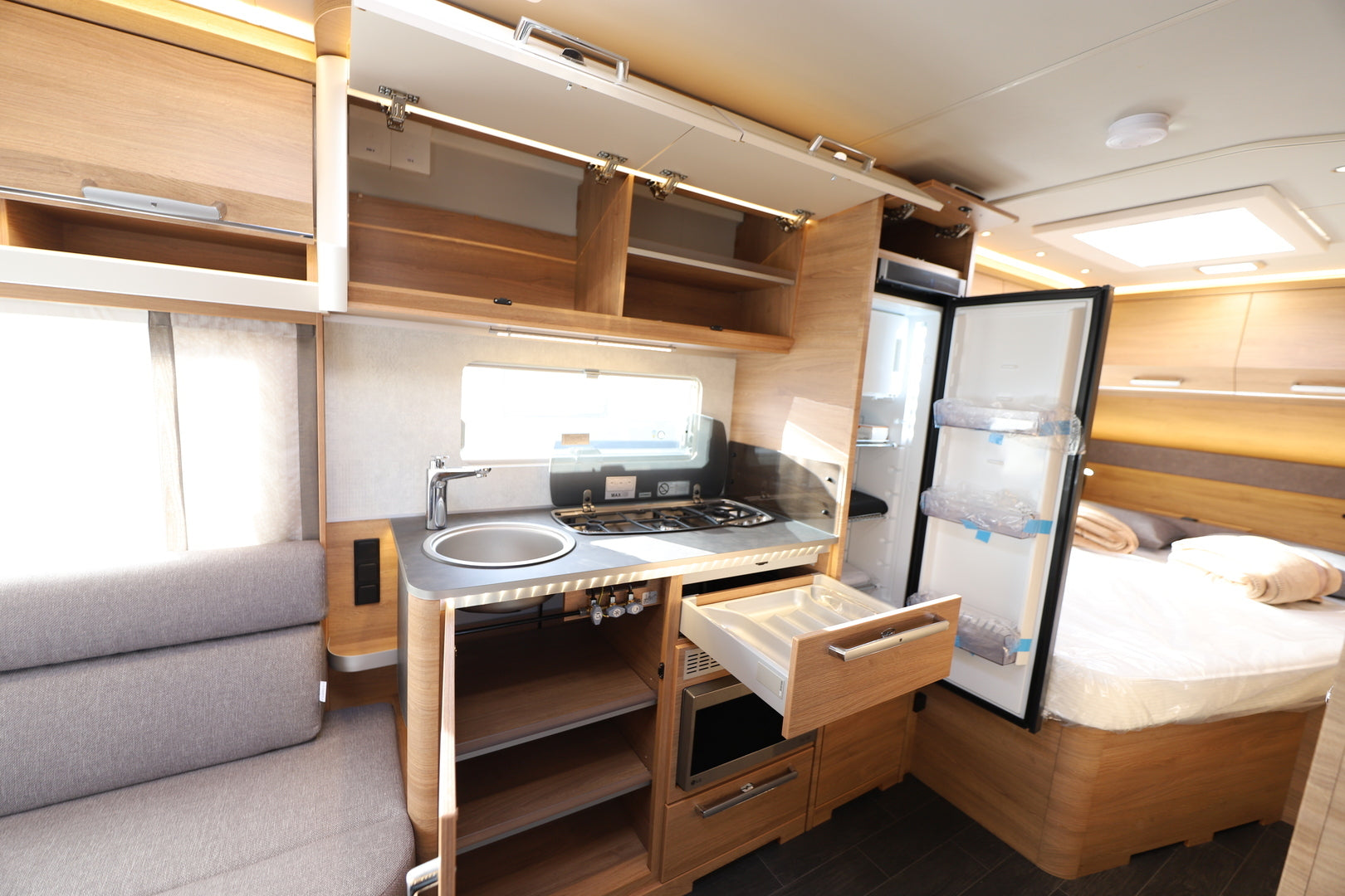 Keittiössä on kolme poltinta valurautarungolla, automaattinen energianvalinta jääkaapille sekä ruostumattomasta teräksestä valmistettu pesuallas. Taittuva aputaso lisää käytännöllisyyttä ruoanlaitossa. Kylpyhuoneesta löytyy peilillinen seinäyksikkö, Thetfordin WC sekä suihkulaite, jotka tuovat lisämukavuutta pidemmilläkin reissuilla.
