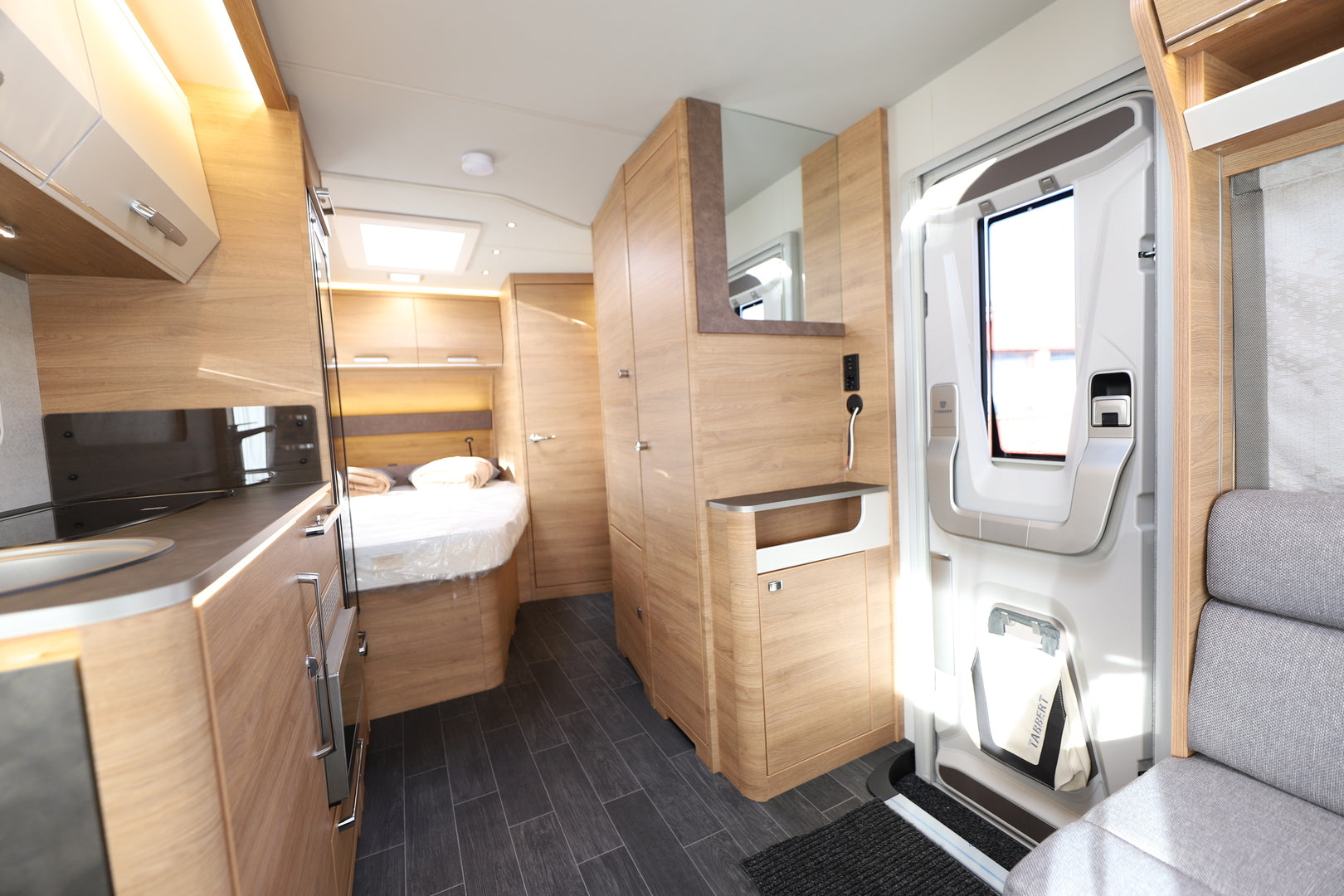 Tabbert Da Vinci 490 TD yhdistää harkitun muotoilun ja matkustusmukavuuden tavalla, joka kutsuu pidempäänkin lomailuun. Sisätilat on viimeistelty laadukkailla materiaaleilla, ja suunnittelu painottaa viihtyisyyttä sekä toimivuutta. Makuuhuoneessa odottaa viilentävällä geelialustalla varustettu Comfort-vuode, jonka lautasjousitettu alusta tarjoaa levolliset yöunet. Tilava keittiö, 133 litran jääkaappi ja pehmeästi sulkeutuvat laatikot tekevät arjen helpoksi matkalla.