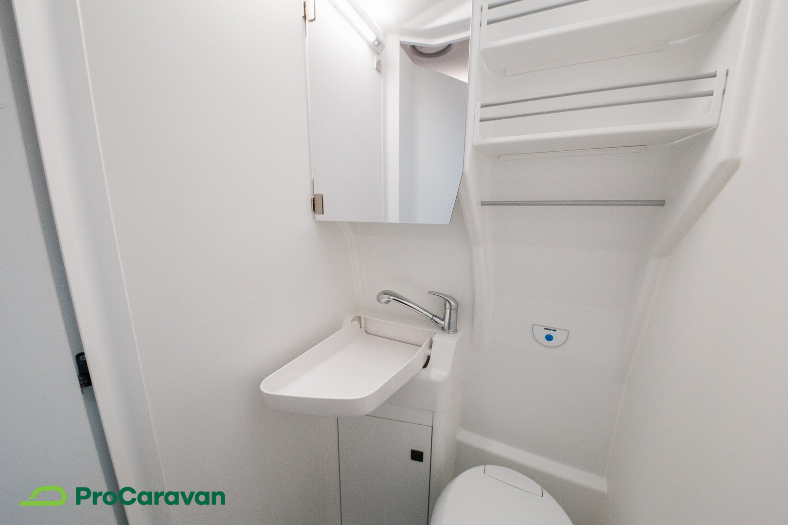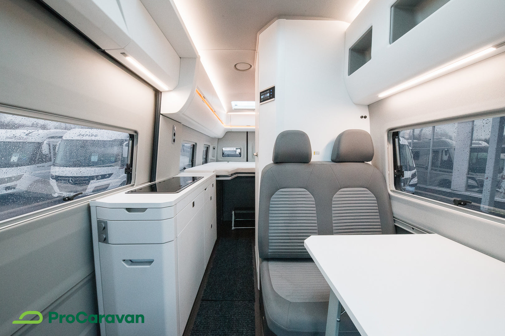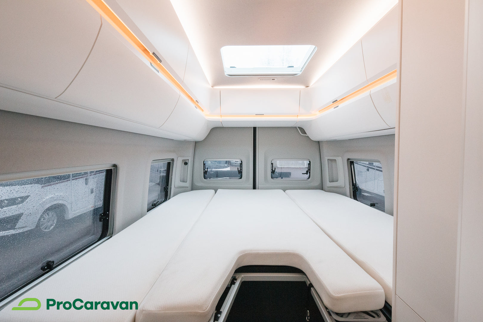 Lämmityksestä vastaa Truma-ilmakeskuslämmitys ja sähköpatruuna, jotka pitävät sisätilat miellyttävinä säästä riippumatta. Parivuode tarjoaa levolliset yöunet, ja liesi, jääkaappi sekä pakastelokero mahdollistavat monipuolisen ruoanlaiton missä tahansa. Matkan aikana peseytyminen onnistuu helposti kasetti-WC:n ja pesualtaan avulla.