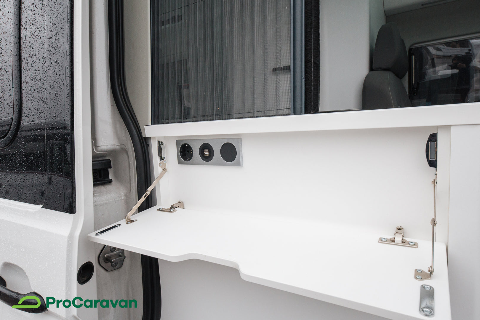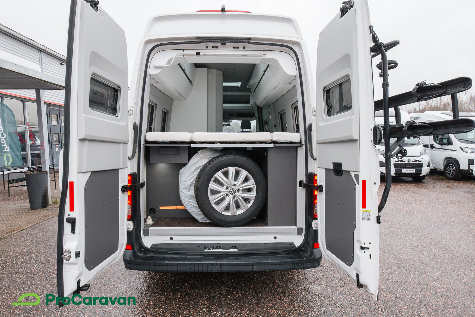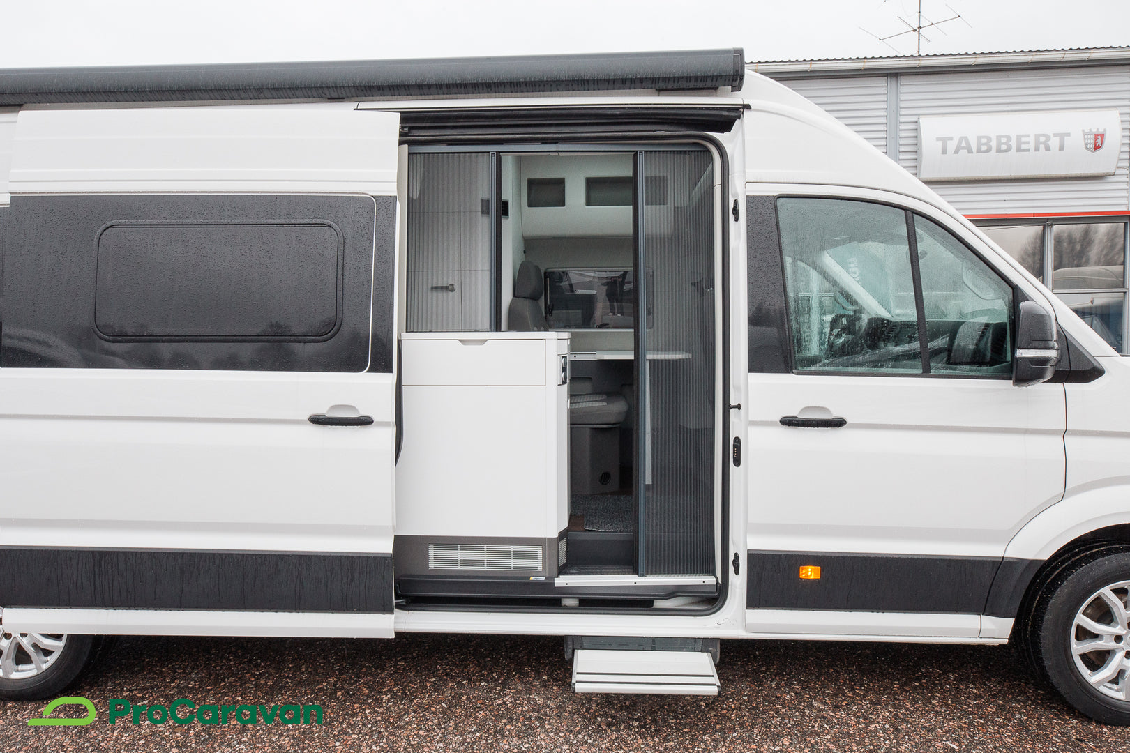 Markiisi ja pyöräteline laajentavat mahdollisuuksia ulkoiluun, ja sähkörappu helpottaa sisäänkäyntiä. Sisätilat pysyvät valoisina kattoikkunan ansiosta, ja kasettiverhot tarjoavat tarvittaessa yksityisyyttä. Multimediasoitin huolehtii viihteestä tien päällä ja hyttysverkko-ovi tuo mukavuutta kesäiltoihin.