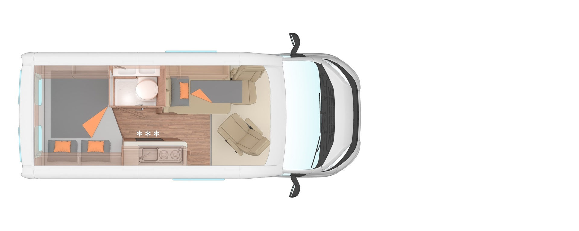 Takaosan 194 cm pitkä parivuode tarjoaa nukkumamukavuutta kahdelle, ja istuinryhmästä muodostettavissa oleva lisävuode mahdollistaa myös kolmannen yöpymisen. Käytännöllinen sisustusratkaisu sisältää säilytyslokeron kuljettajan istuimen alla, kääntyvät ohjaamon istuimet, EasyEntry-pöydän ja vetolaatikot, jotka ulosvetäytyvät kokonaan. Takasäilytystila on muunneltavissa ja antaa joustavuutta tavaroiden pakkaamiseen.