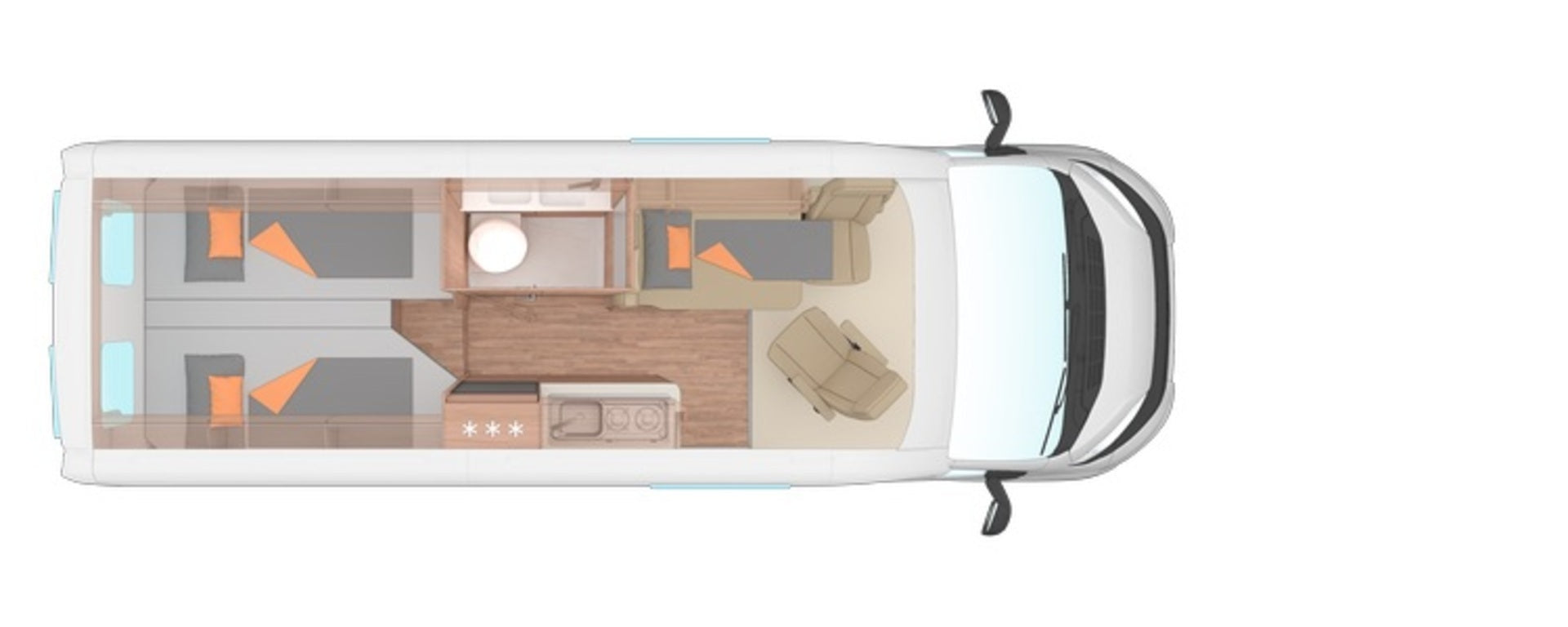 Takaosan pitkittäiset erillisvuoteet, joiden pituudet ovat 180 ja 200 cm, tarjoavat erinomaisen nukkumamukavuuden. Istuinryhmän lisävuode mahdollistaa kolmannen matkustajan yöpymisen. Säilytystilaa on runsaasti: muunneltava takasäilytys, vetolaatikot ja kaasuteline kahdelle 11 kg pullolle tekevät matkustamisesta vaivatonta. Istuinryhmään integroitu lämmitys sekä EasyEntry-pöytä lisäävät asumismukavuutta.