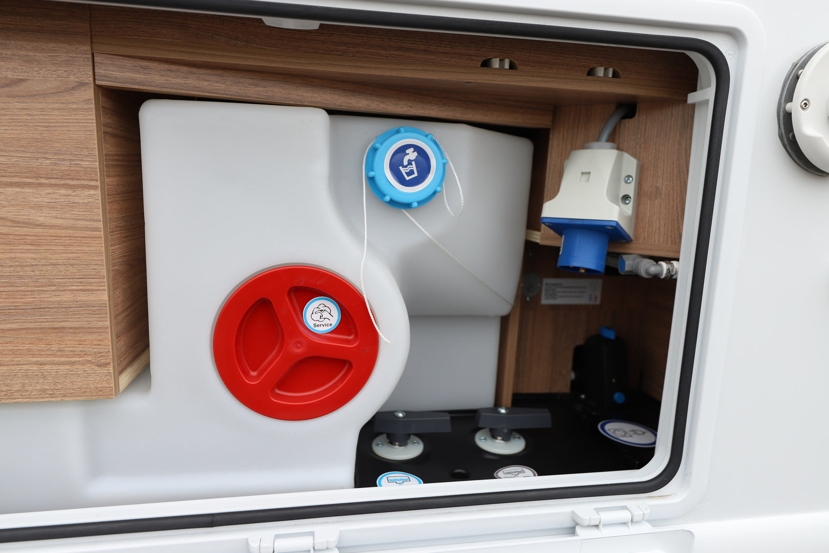 WEINSBERG Easy-Travel-Box johon pääsy ulkokautta: Vedentäyttö / vesihana ja 230 V liitäntä